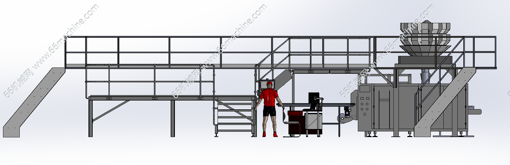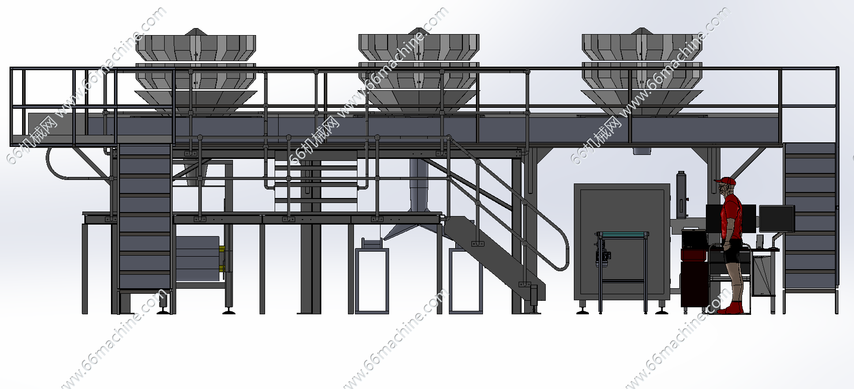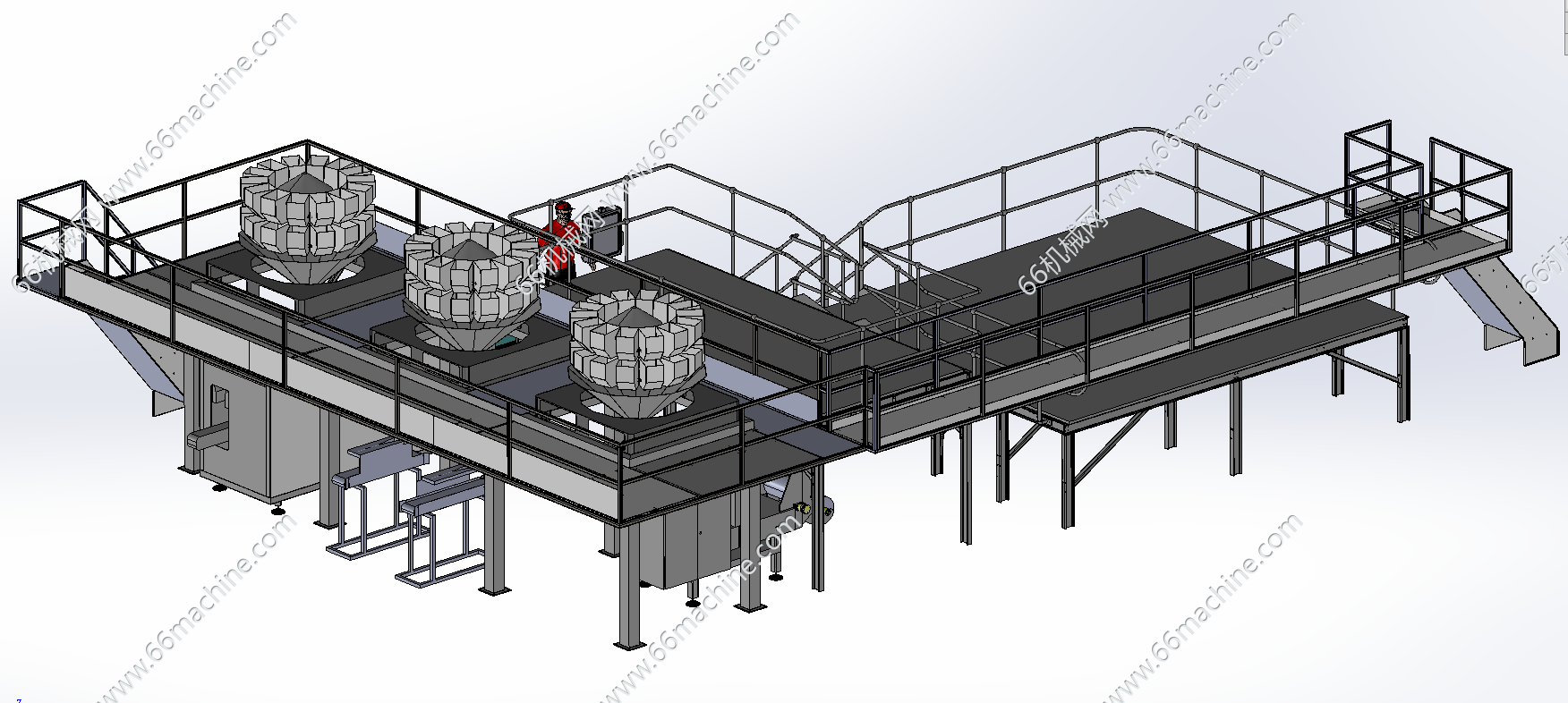 本系统用于对不同种类的坚果(如杏仁、核桃等)进行分拣和精准计量。上层的多个旋转分拣装置可识别并分离不同规格、品类的坚果,通过输送线传递至计量区域,工作人员在操作工位可监控并管理整个分拣计量流程,实现坚果产品按规格、重量的自动化分拣与计量,为后续的罐装、袋装包装提供精准的物料准备。