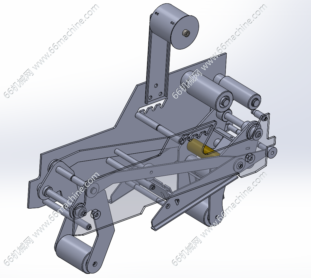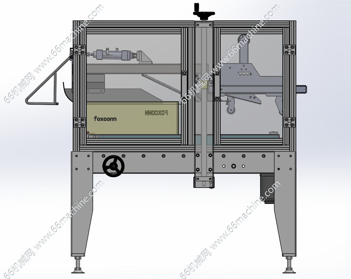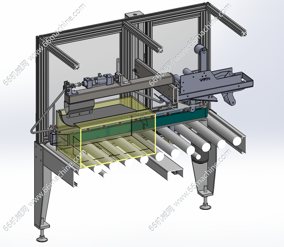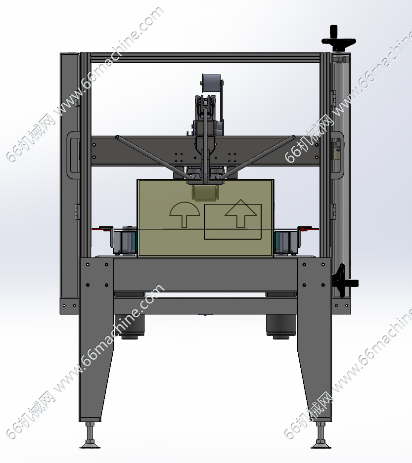 本模型为纸箱自动折盖及胶带封箱机,是一种将纸箱上盖自动折合与胶带自动封箱两个功能集成于一体的自动化包装机械。它能够自动将直立开口的纸箱(通常已完成装填)的摇盖依次折合,并用胶带(通常是压敏胶带)将箱盖中缝或边角牢固封合。