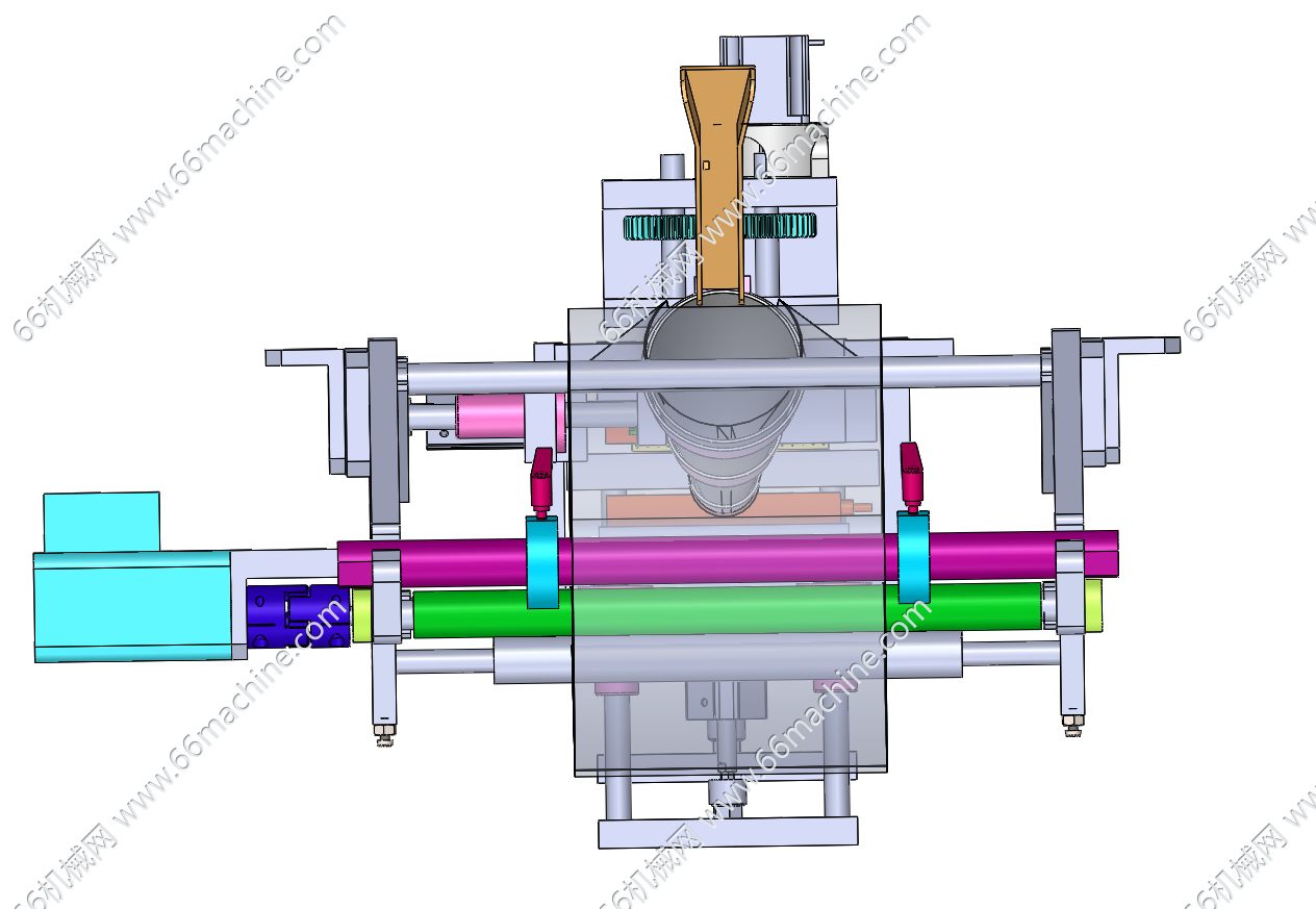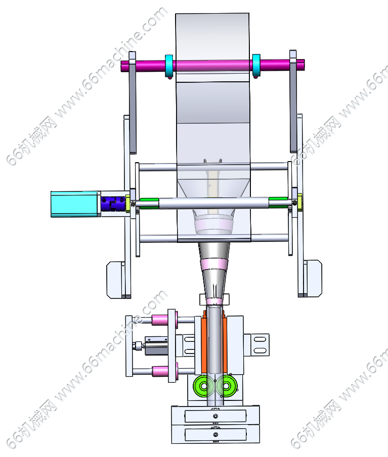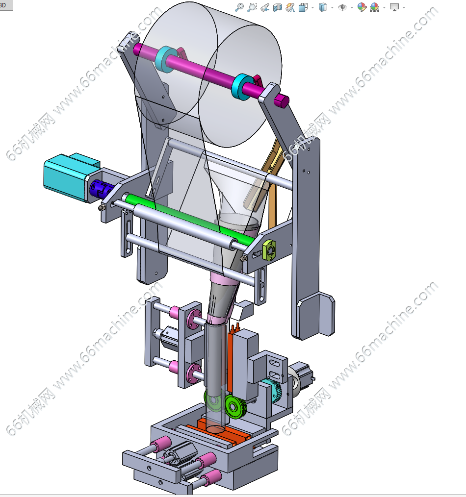 本模型为颗粒物料薄膜包装热封口机,主要由薄膜卷料、侧面热封口、底部热封口、薄膜驱动轮组等组成,适用于颗粒物料(如:糖果、小动物饲料等)自动化薄膜包装,仅供大家参考!