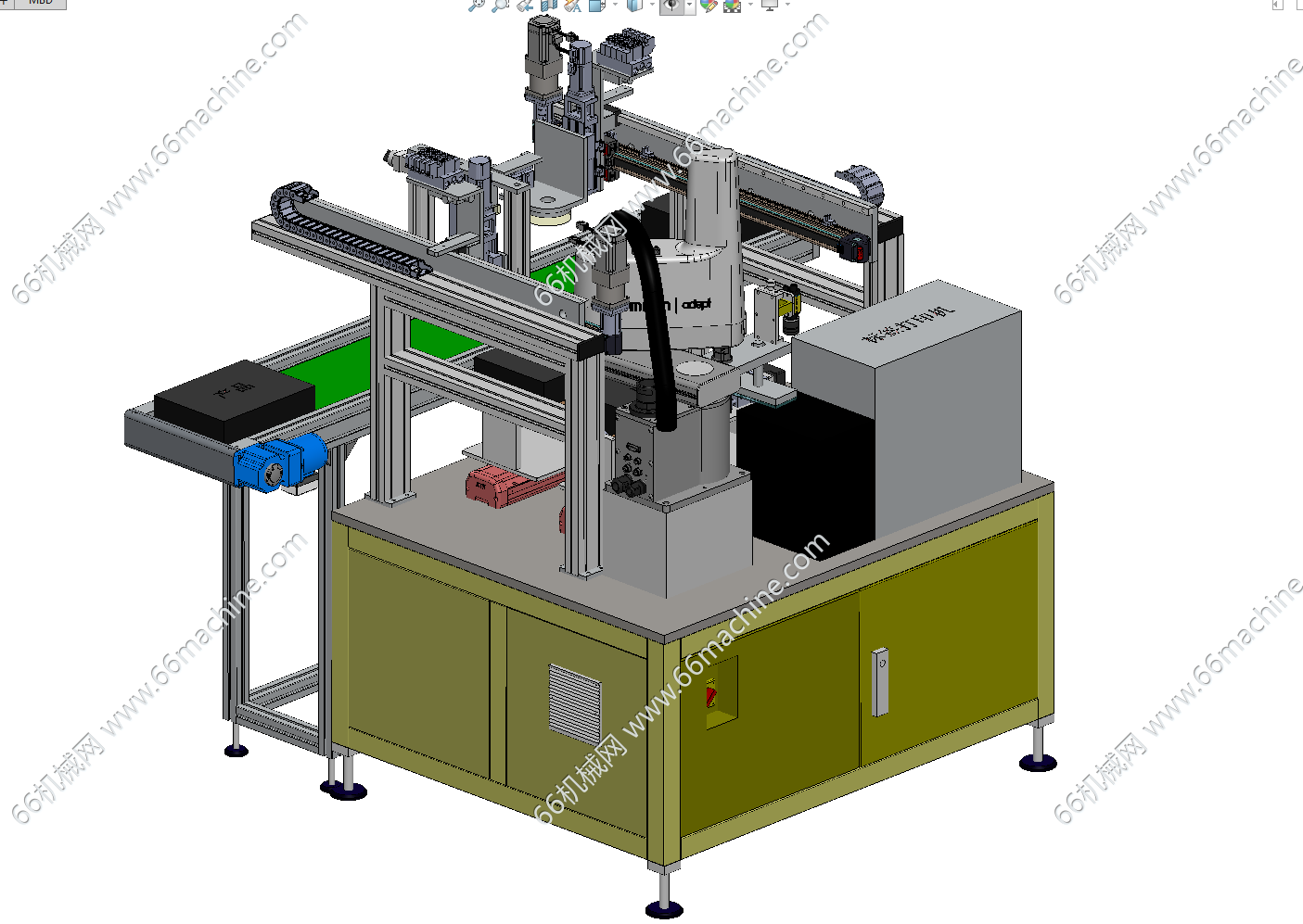 本模型为基于视觉引导机器人的贴标机(标签贴覆机),主要由下机架、机罩、视觉引导吸附贴标机器人、可横移及旋转定位治具、吸附式上下料移栽机、皮带输送机、标签打印机(供标模组)组成,视觉引导贴标机器人对旋转定位治具上的产品进行贴标,欢迎下载参考!