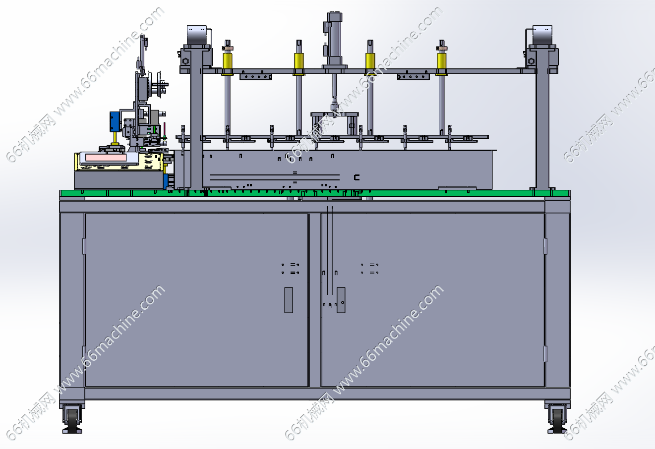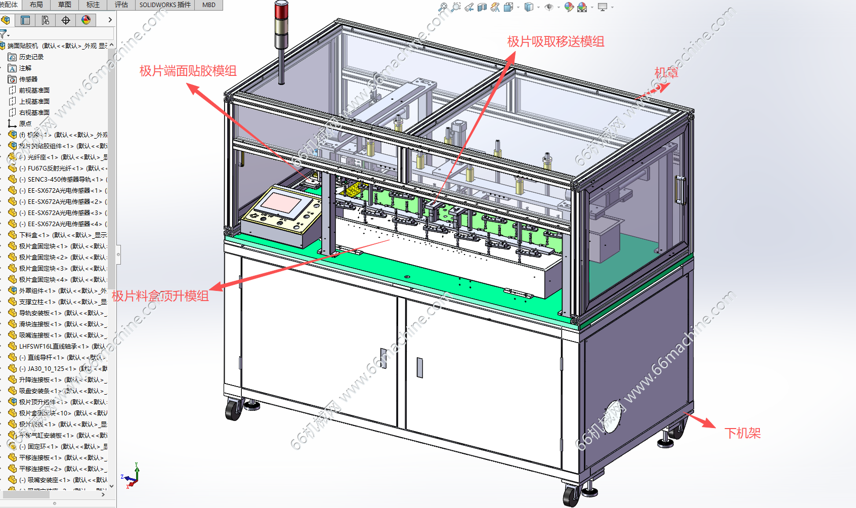 本模型为某企业电池极片极耳端面自动贴胶机,主要由下机架、机罩、极片端面贴胶模组、极片料盒顶升模组、极片吸取移送模组等组成,用于电池极片极耳自动上料及贴胶作业。本资料包含3D及工程图,为专业人员设计,水平很高,可供大家探讨学习!