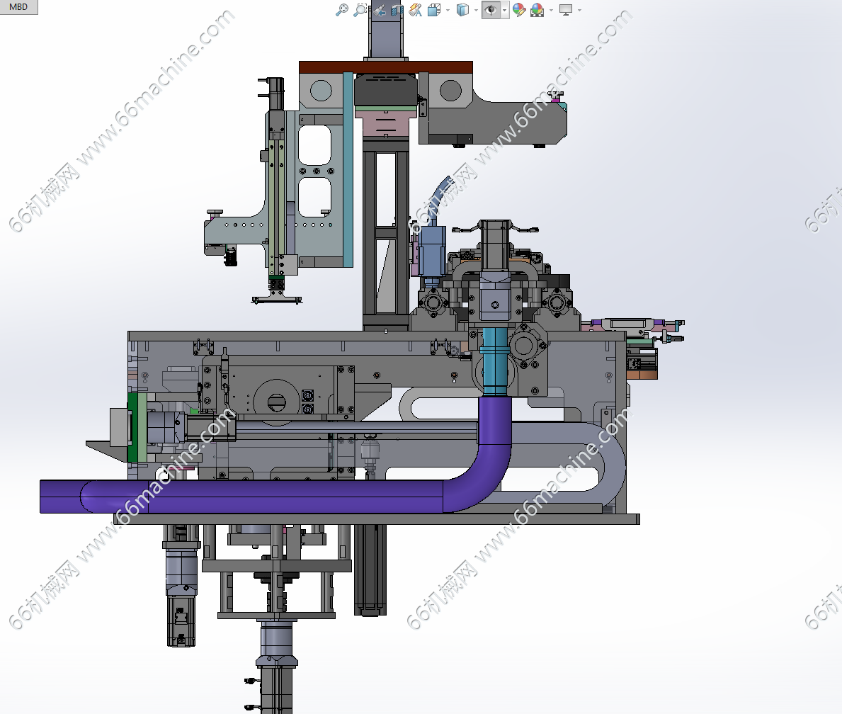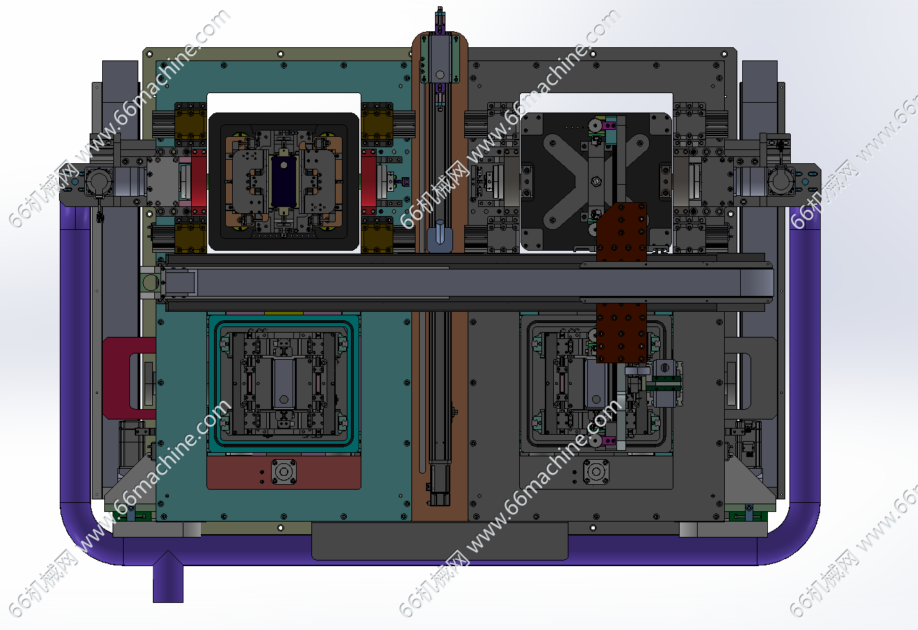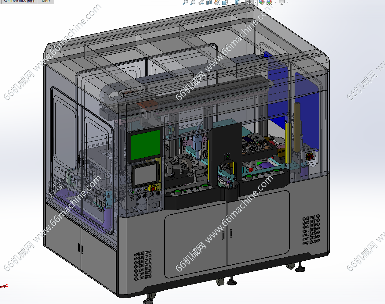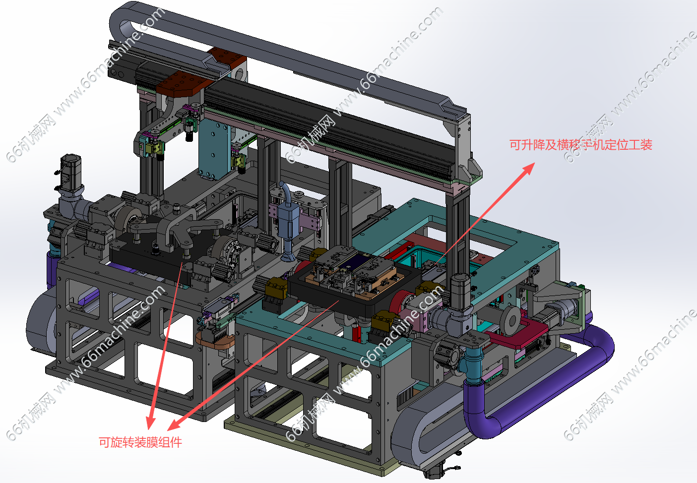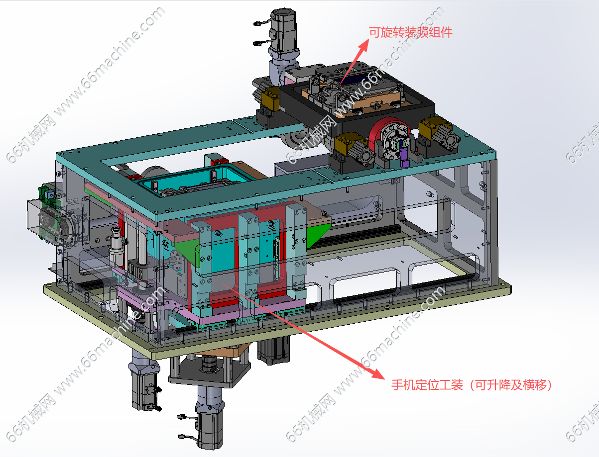 本模型为手机玻璃曲面面板贴膜及视觉检测机,由机架、手机贴膜模组、视觉检测及移送模组组成,手机贴膜模组由可升降及横移手机定位工装与可旋转装膜组件组成,手机定位后移送至装膜位进行顶升与收集面板进行贴合覆膜。本设备结构比较独特,欢迎参考!