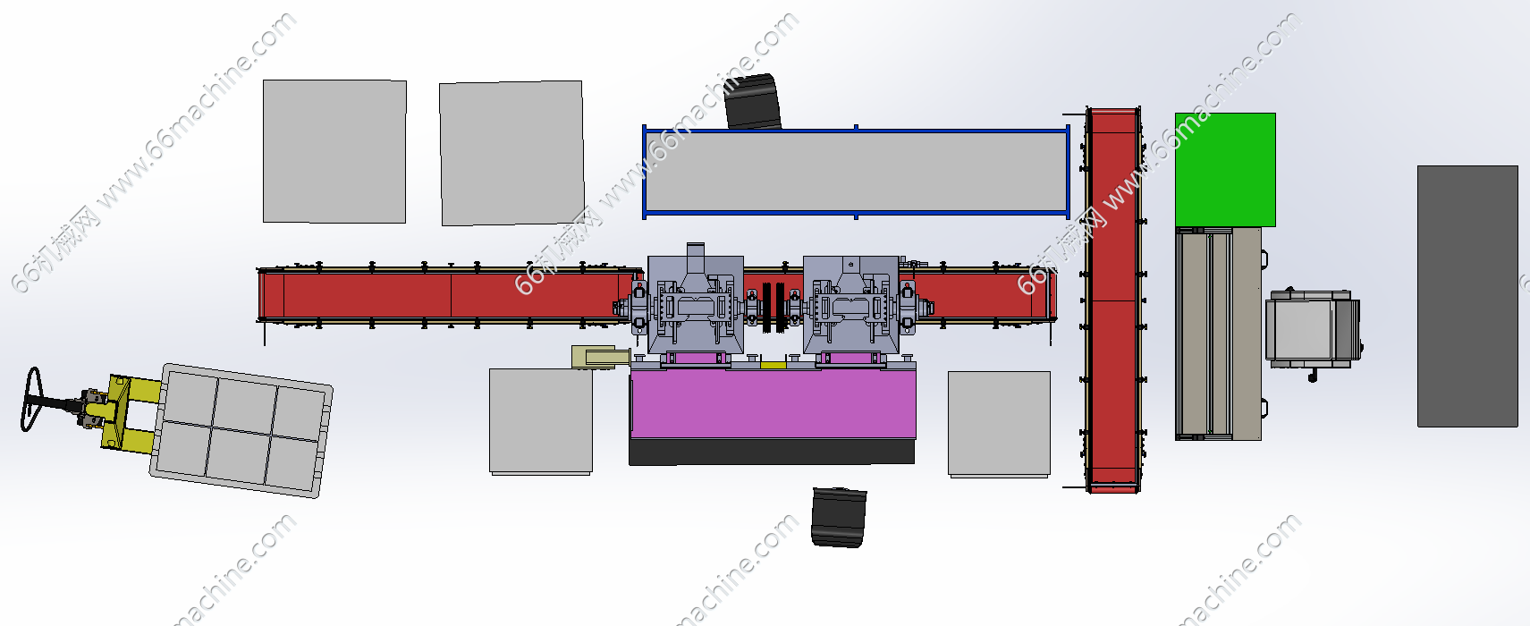 本模型为打包工作站,红色的传送带贯穿整个工作站,用于物料的传输。加工设备:中间带有紫色工作台和检测工位,配有操作面板和显示设备。左侧有带蓝色网格的多层存储柜,左下角还有叉车搬运的托盘货物;中间有多个抽屉式储物柜,用于工具或零件的收纳。右侧有绿色货架、工作台和办公柜,还有供人员操作的高脚凳,构成了操作与办公区域。