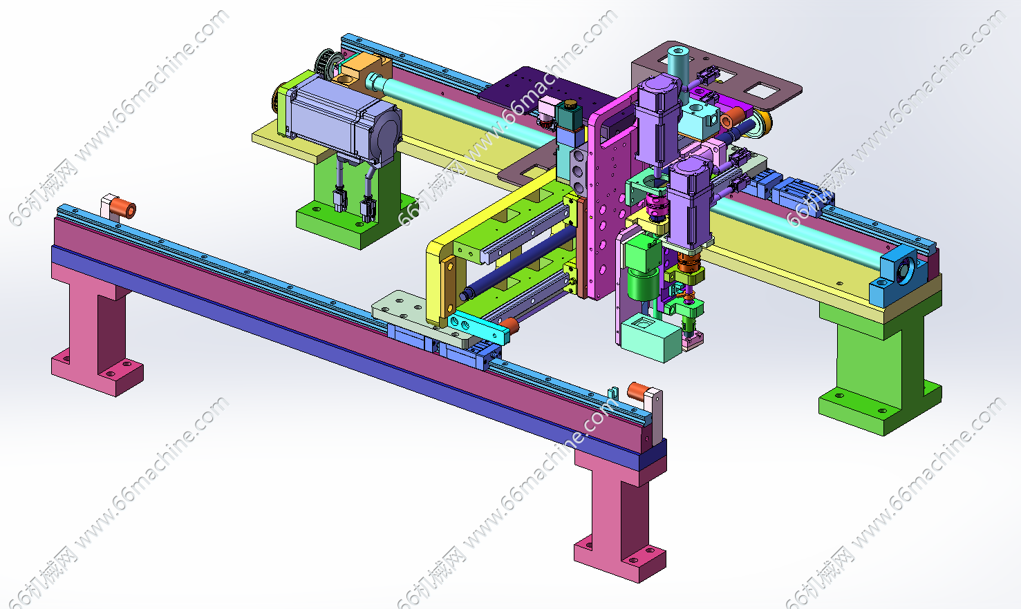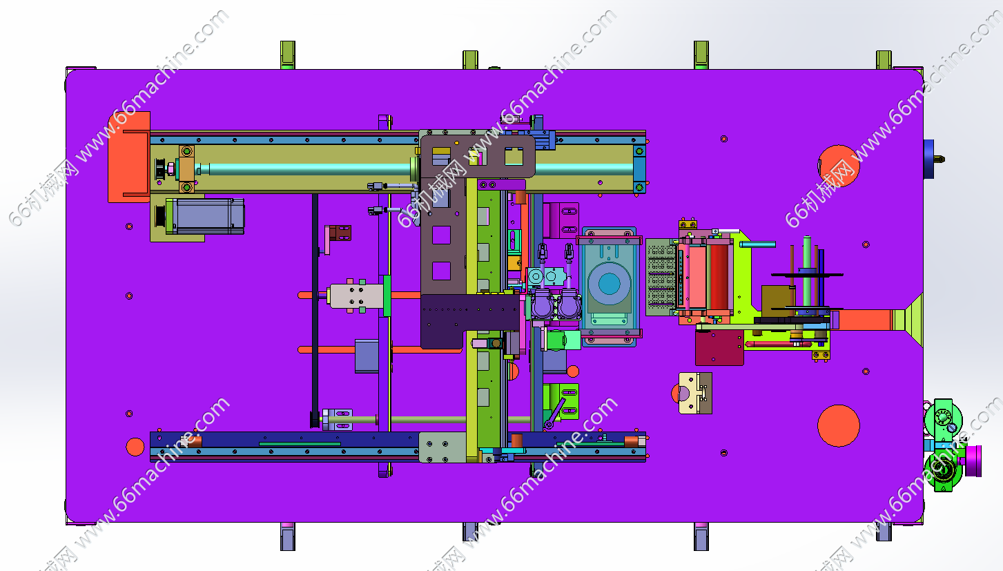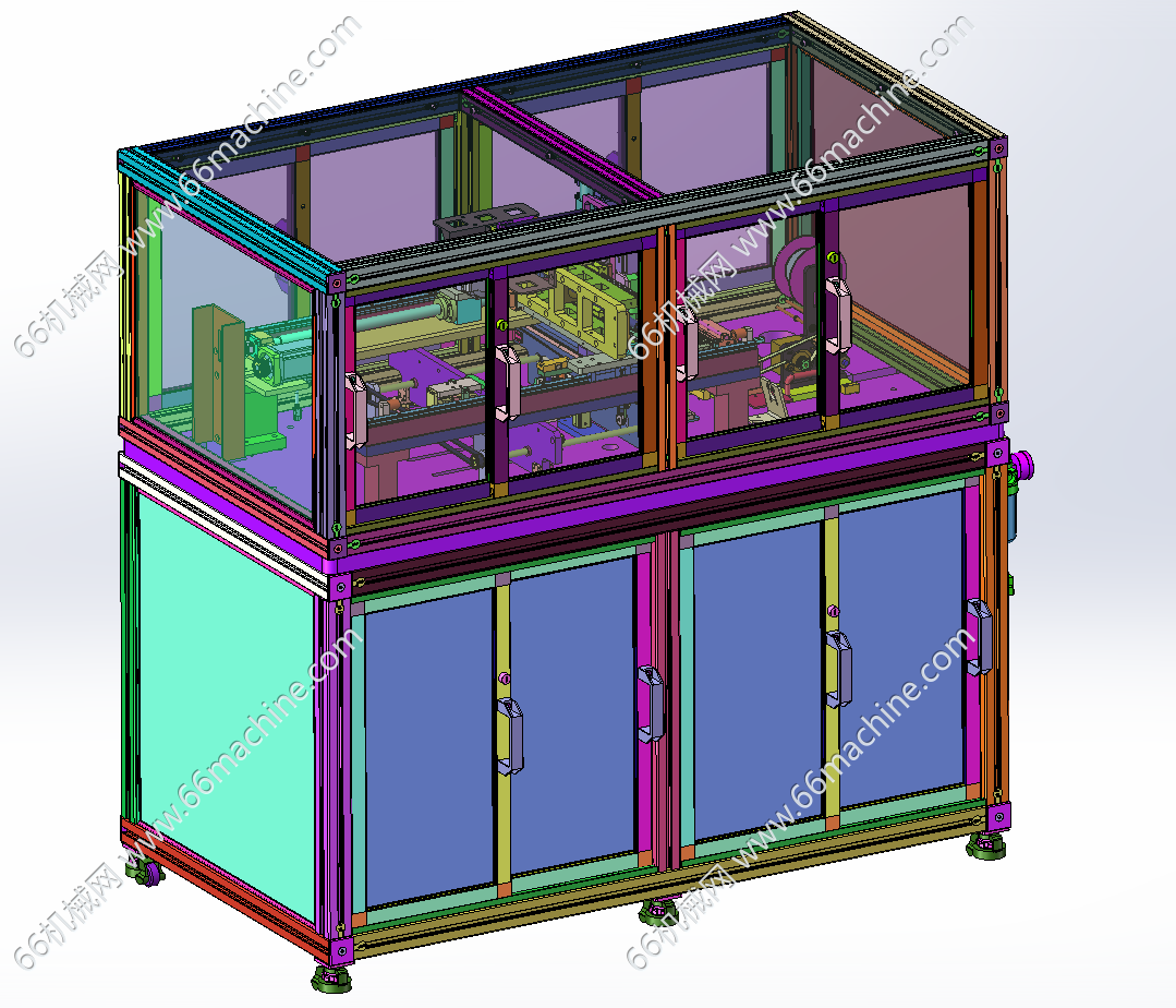 本模型为某企业自动贴标机,主要由下机架、机罩、送标机构、间距可调式载具输送线、三轴吸取移栽模组组成,工作流程:产品由载具输送线流入,送标机构出标,然后由三轴吸取移栽模组吸取标签并粘贴至载具内的产品上,欢迎下载参考!