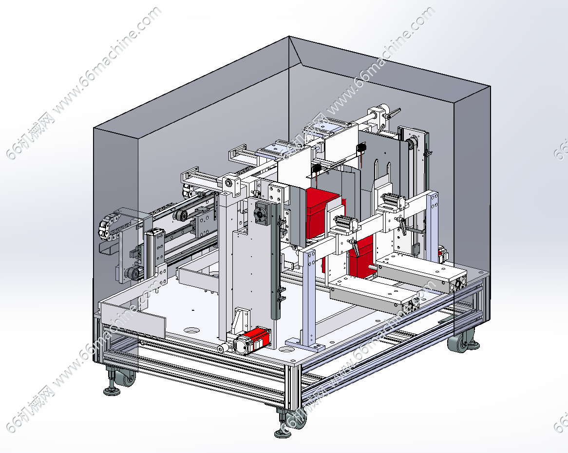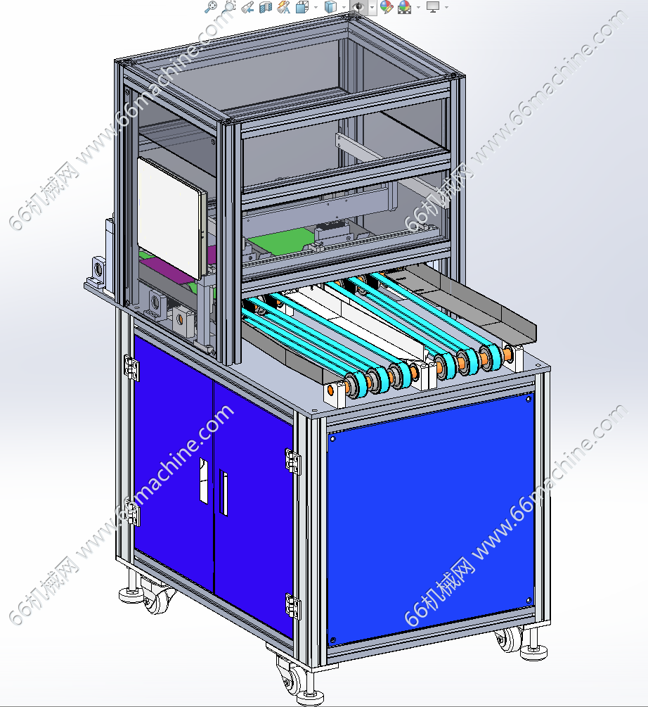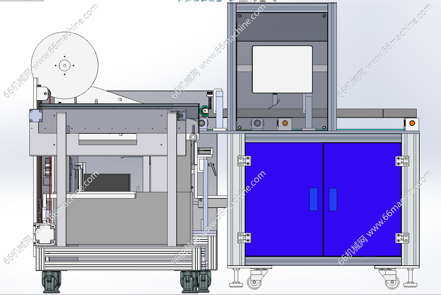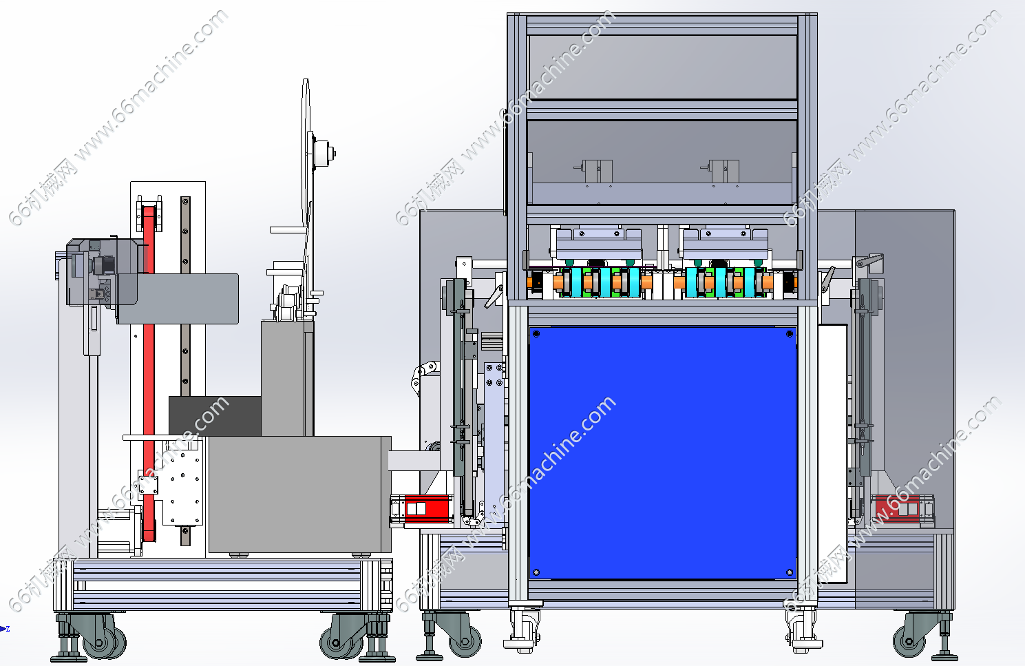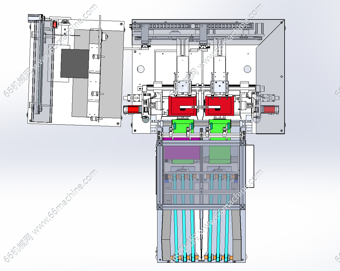 本模型为软包塑料袋理袋捆扎一体机,主要由上料输送线、收料整齐机及打包机组成,用于将定好数量的一叠袋子用包装材料捆扎成整齐的“砖块”状,便于运输、仓储和销售。