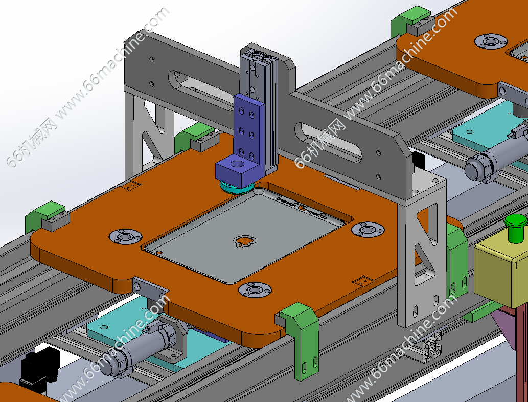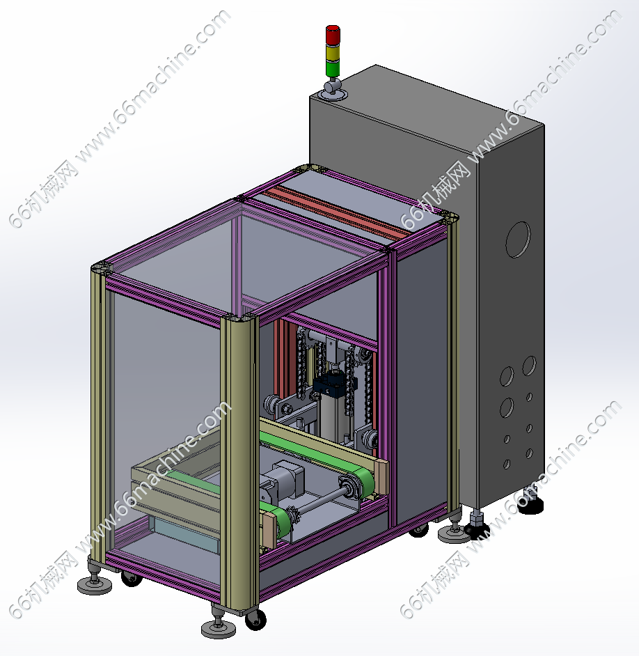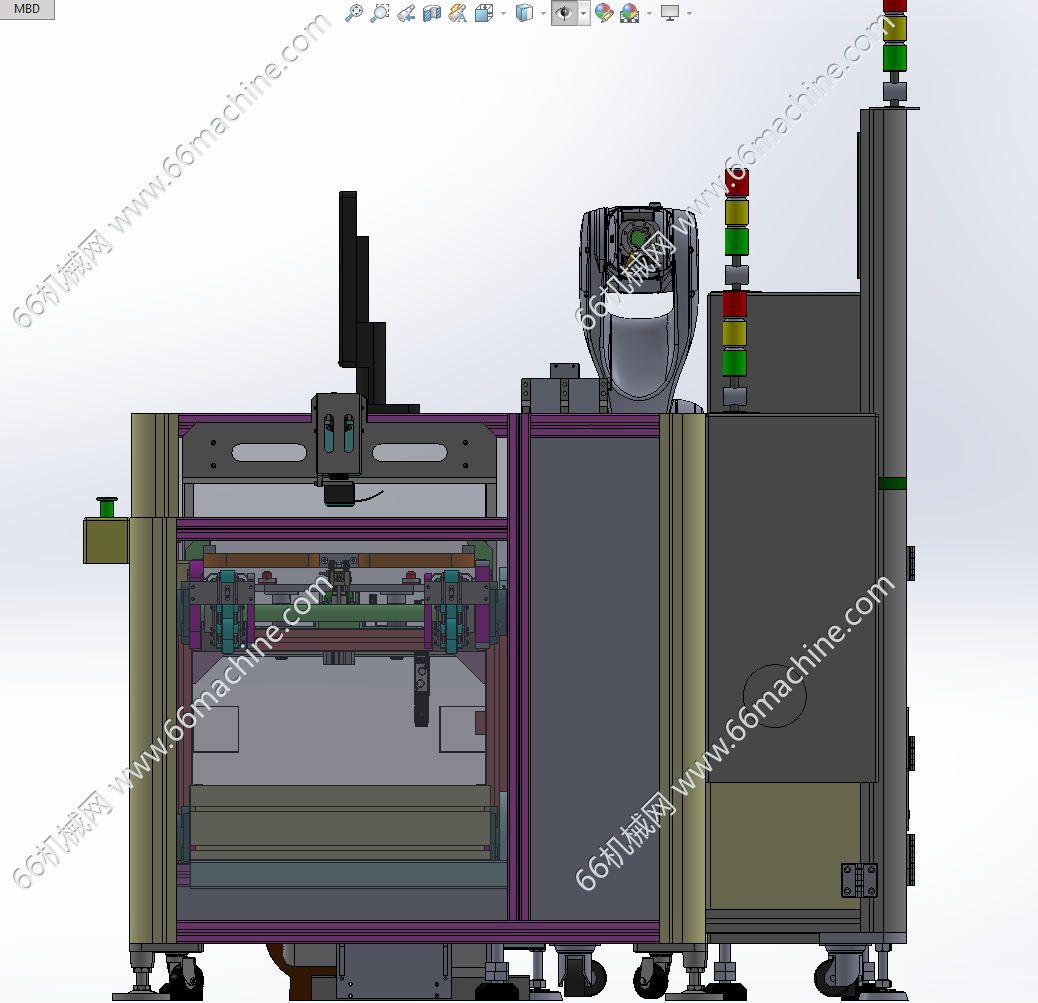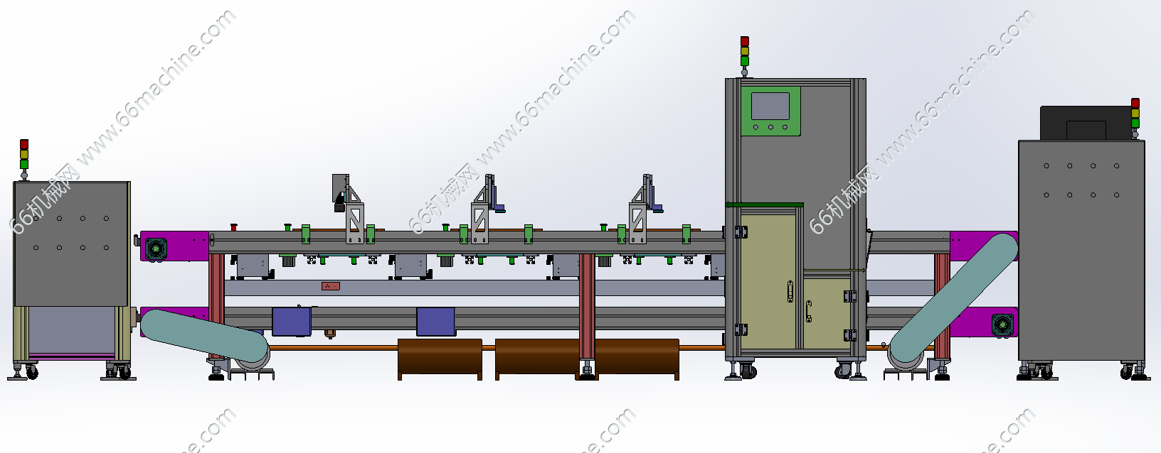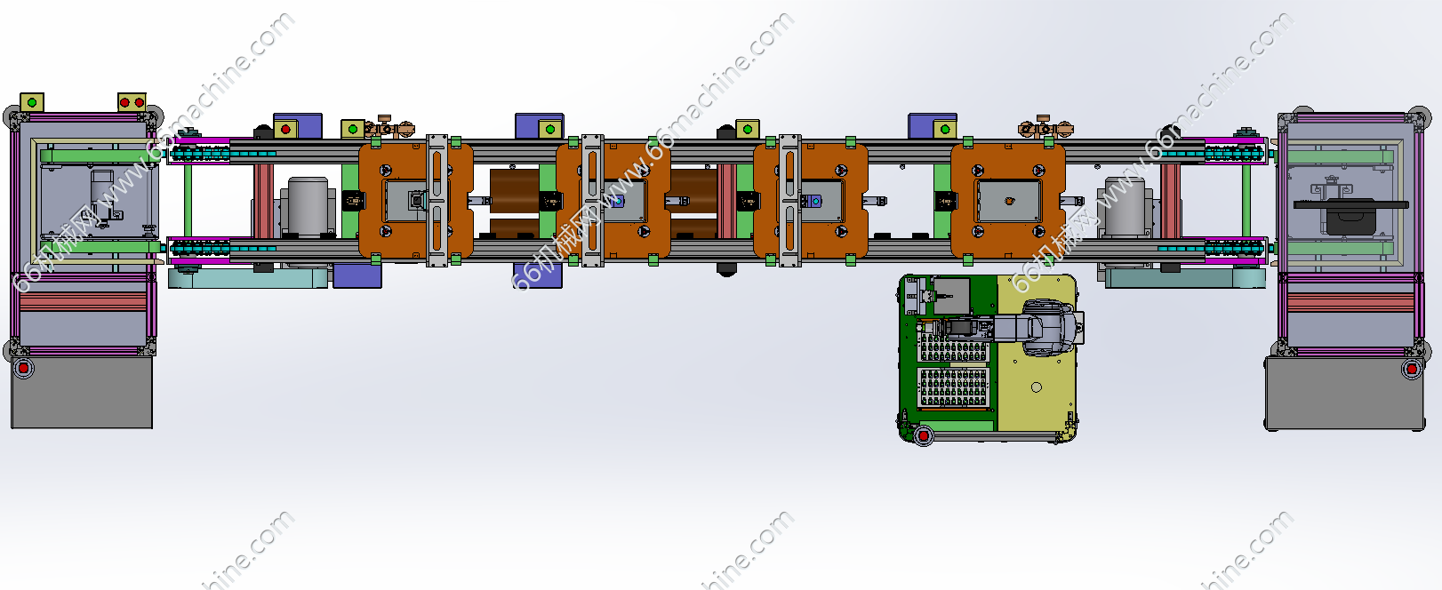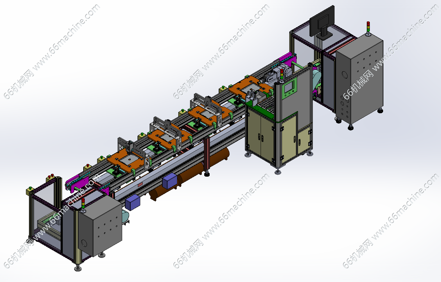 本模型为基于机器人的平板电脑logo贴标机,主要由双层倍速链、取标贴标六轴机器人、2台载具升降机等组成,将平板电脑放入载具内,沿着倍速链流入到指定位置,机器人进行贴logo,然后气动下压模组对logo压紧!