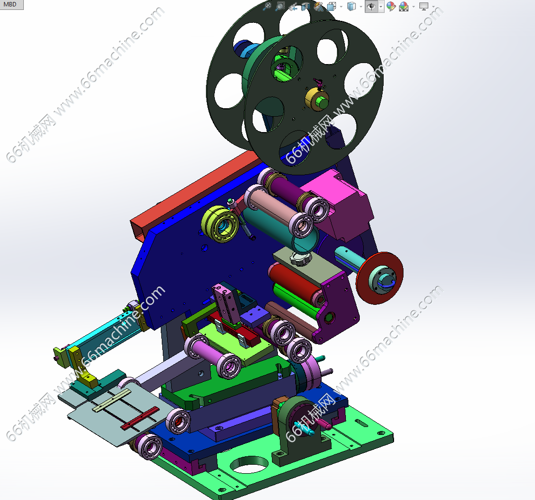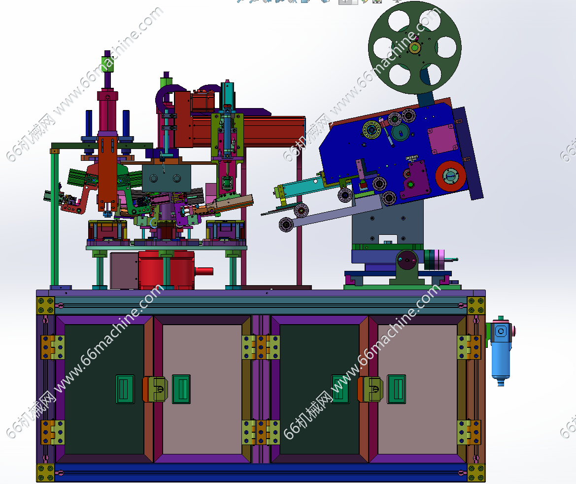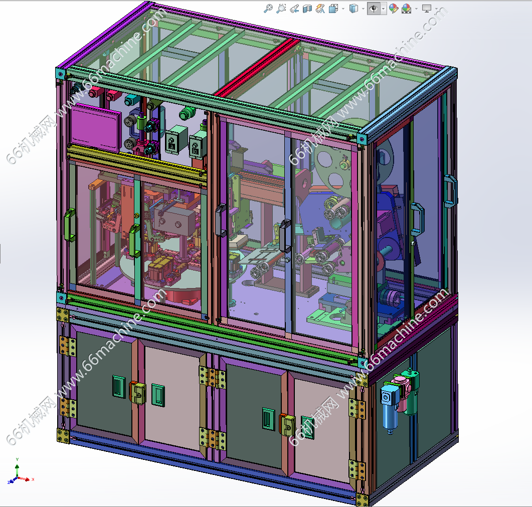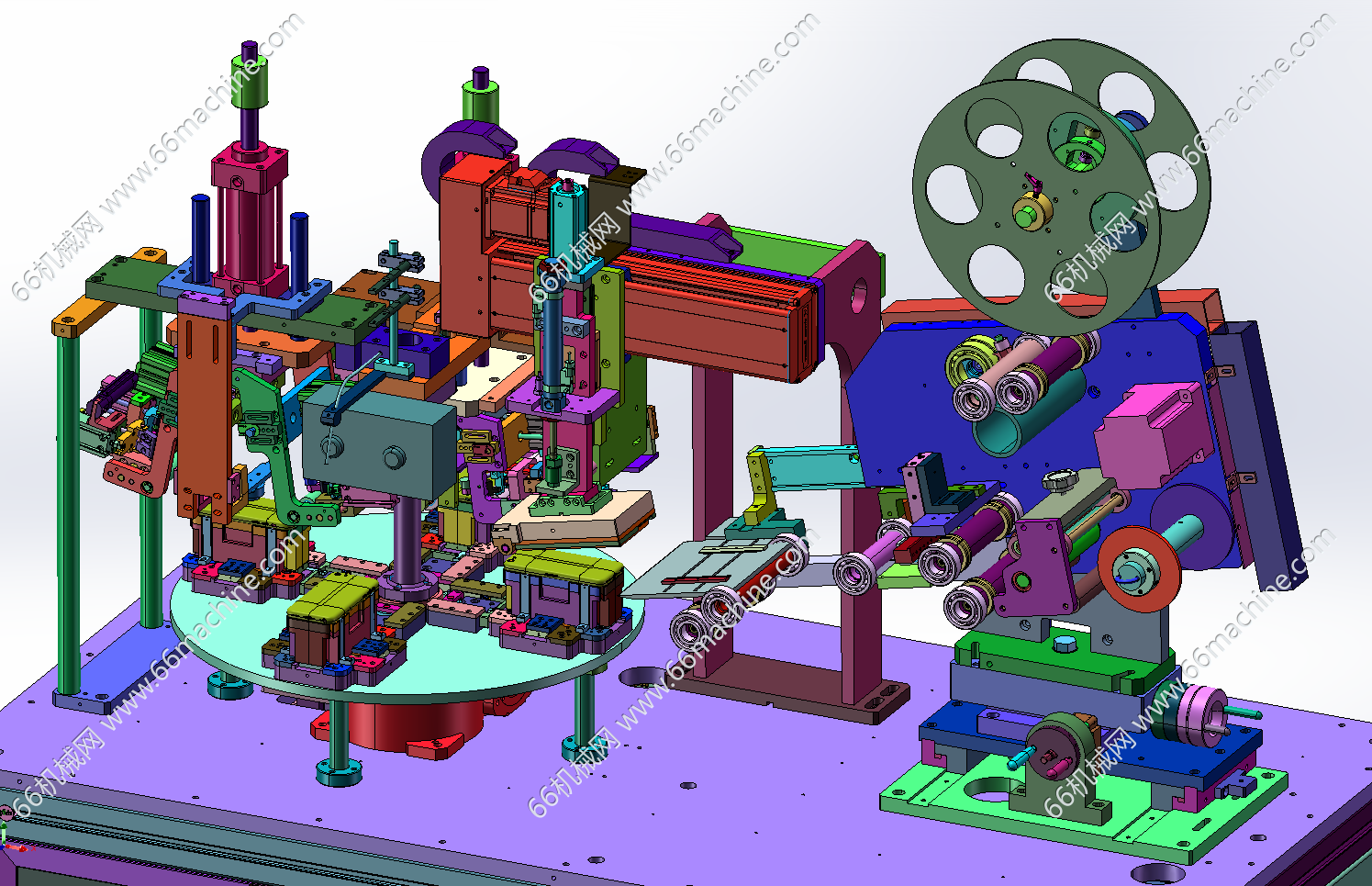 本设备为某企业通用型手机后盖贴标机(或贴膜机),主要由下机架、机罩、出标(出膜)飞达(送标供料系统)、标签吸取移送模组、四工位转盘、标签滚压贴紧模组等组成,通用性强,可用于市面上各种类型手机的后盖贴标或贴膜作业,仅供大家参考!