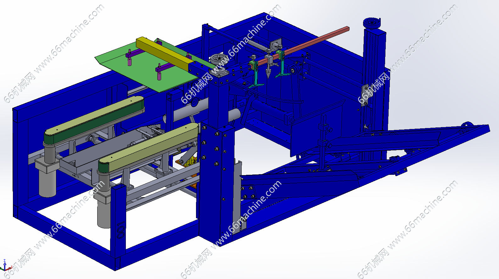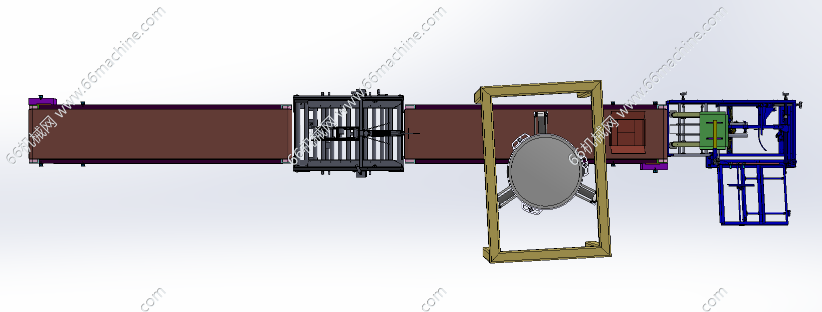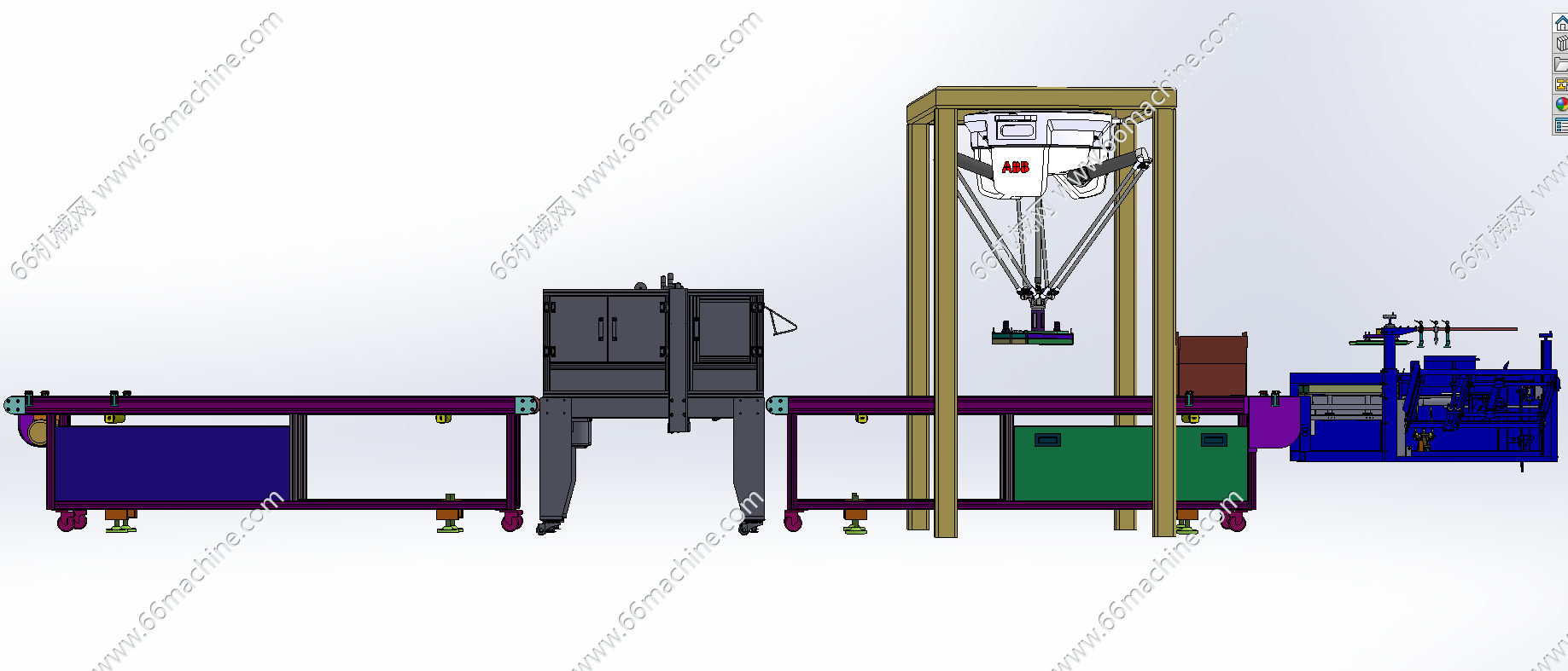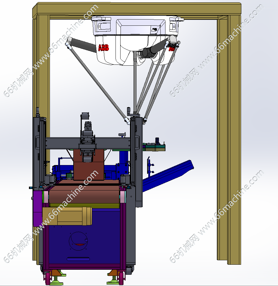 本模型为通用型自动开箱、装箱、封箱包装线,主要由开箱机、皮带输送线、吸取蜘蛛机械手及胶带封箱机组成,蜘蛛机械手将产品从其它流入线吸取并放入纸箱内。本包装线通用性强,欢迎参考!