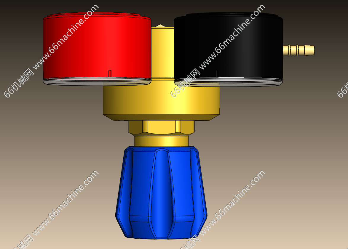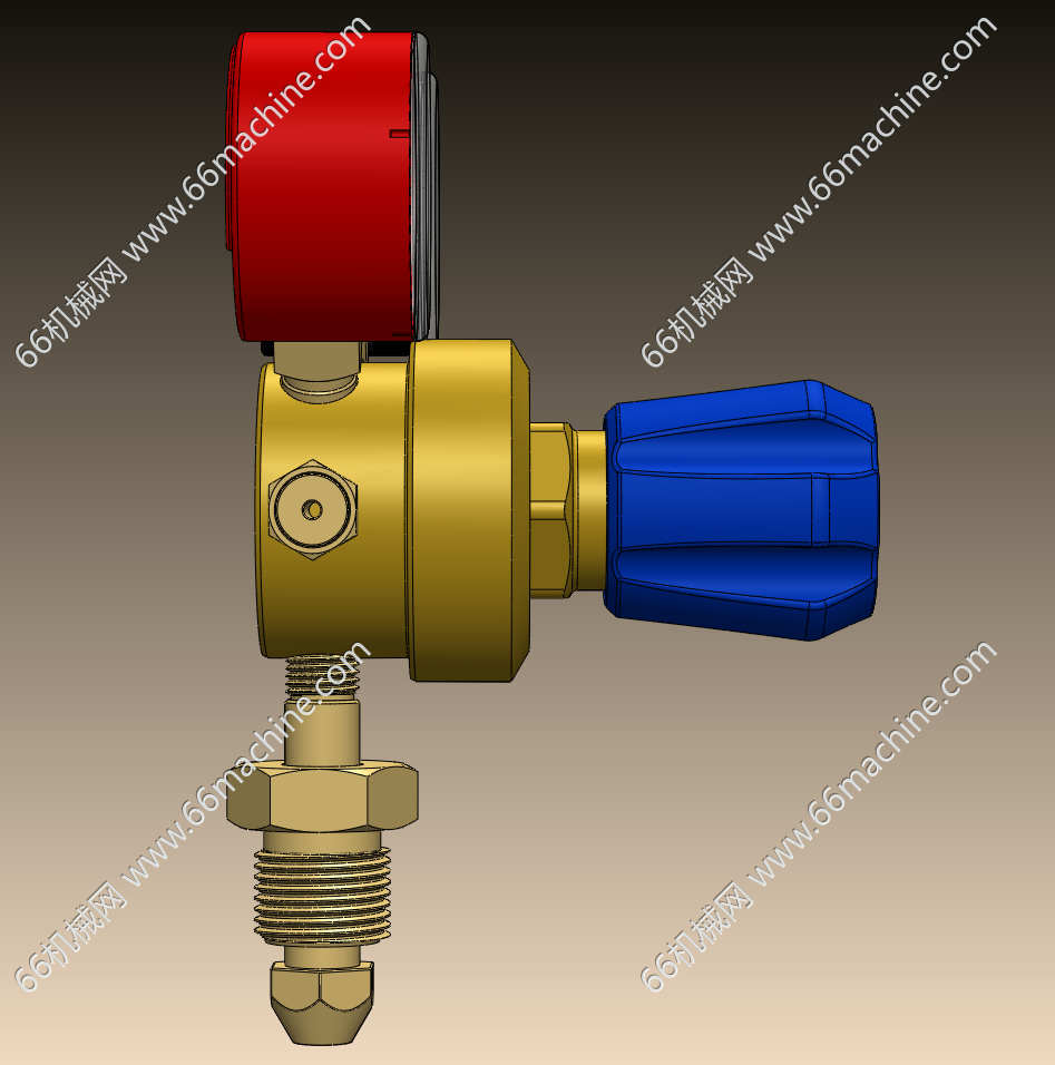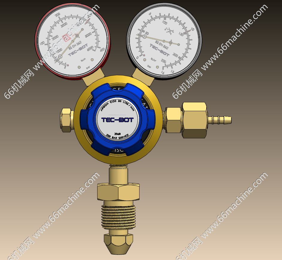 本模型为二氧化碳气瓶焊接专用单级减压器(调节器),主体采用黄铜阀体,通过双压力表分别监测气瓶高压输入与焊接低压输出状态,蓝色调压旋钮可精准调节输出压力,适配CO₂气瓶接口与焊接管路连接;其作用是将 CO₂气瓶内的高压气体稳定降至气保焊(MIG/MAG 焊)所需的低压,保障焊接保护气的稳定供应,避免焊接气孔等缺陷,是二氧化碳气体保护焊作业中不可或缺的核心安全配套部件,广泛应用于汽车制造、钢结构焊接等工业场景。