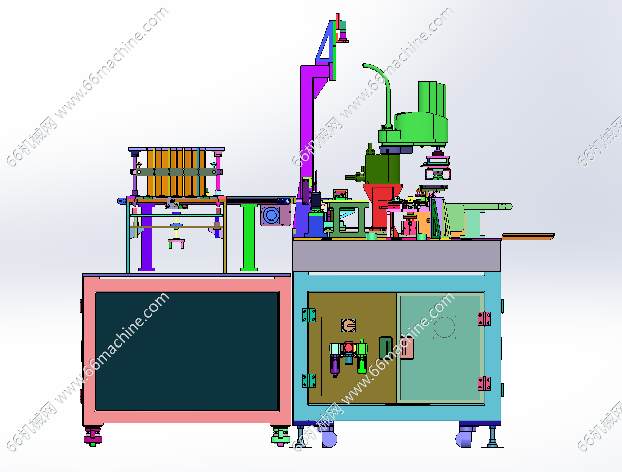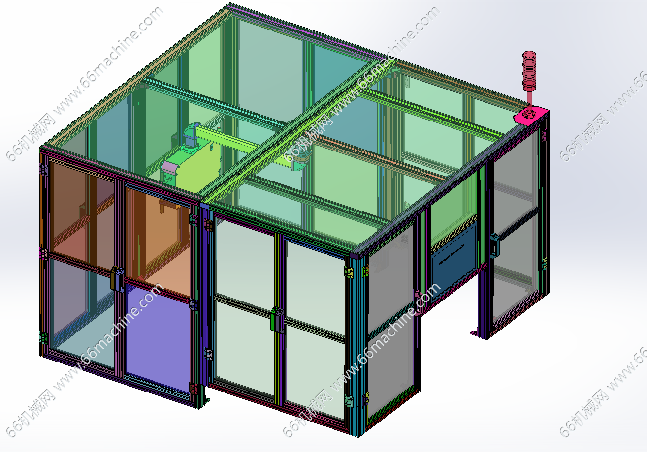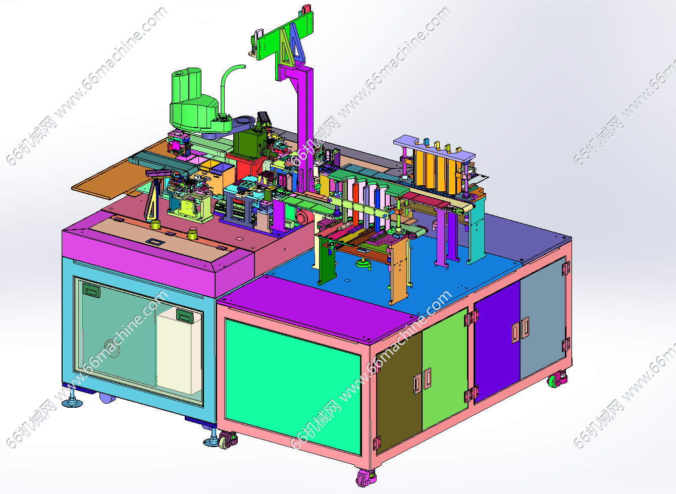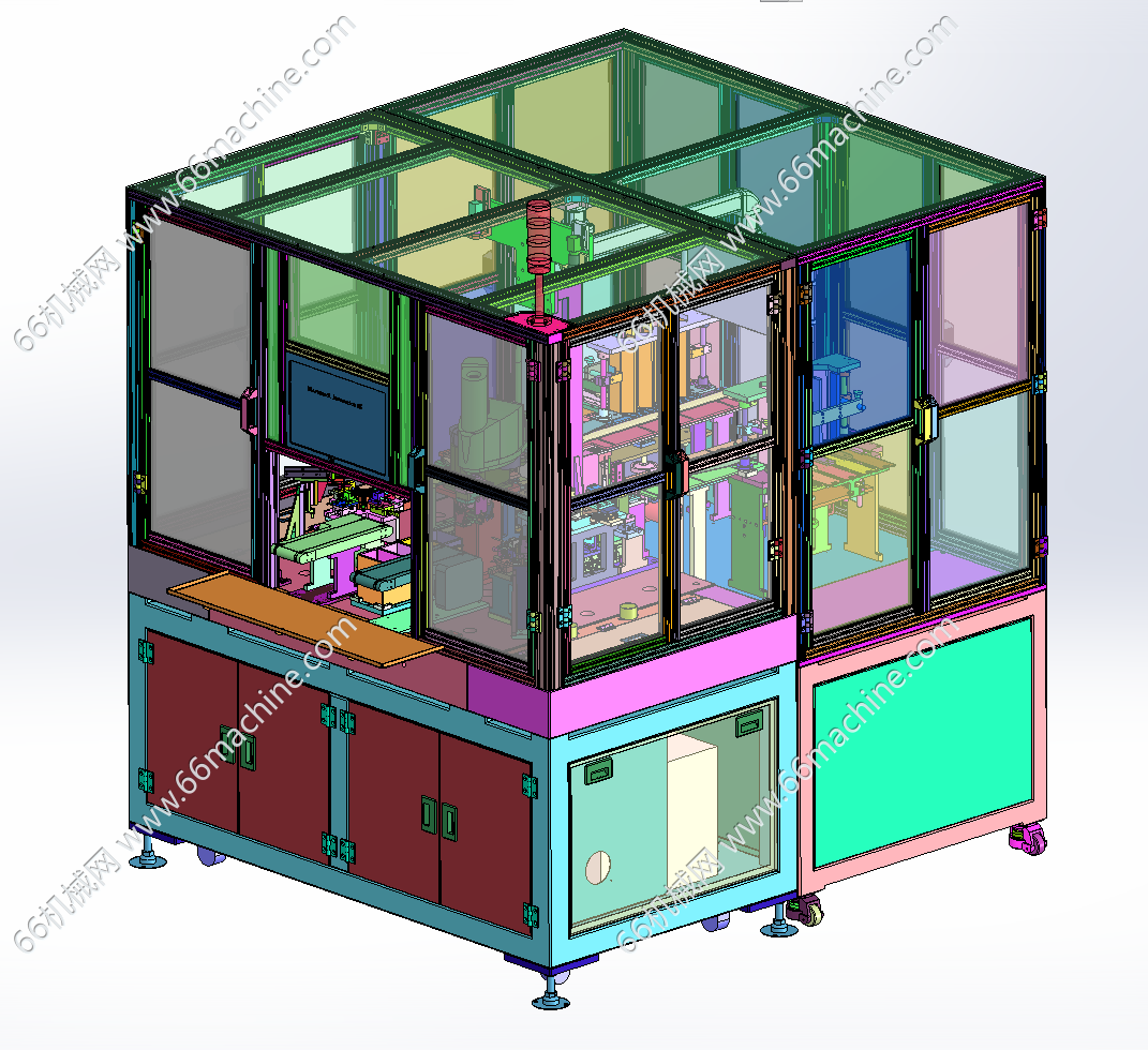 本设备为某企业圆环直径、高度及视觉检测机,主要由四轴机器人、圆环测直径模组、圆环测高模组、弹夹式上料机、CCD检测模组等组成。人工将圆环放置到弹夹上料仓中,推板上料至皮带线,定位工位对圆环完成定位,四轴机器人完成圆环的抓取至检测工位,通过接触力位移传感器完成直径、高度检测,视觉完成外观检测,检测完成,四轴机器人完成圆环的抓取,并搬运至下料输送线。