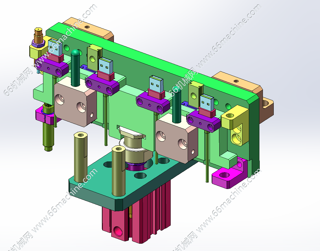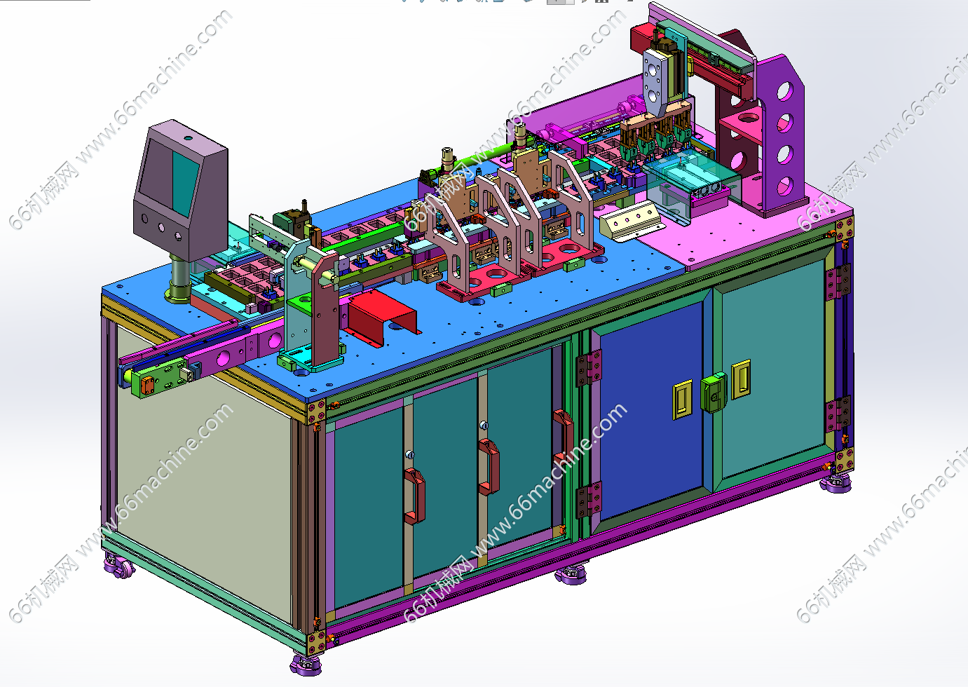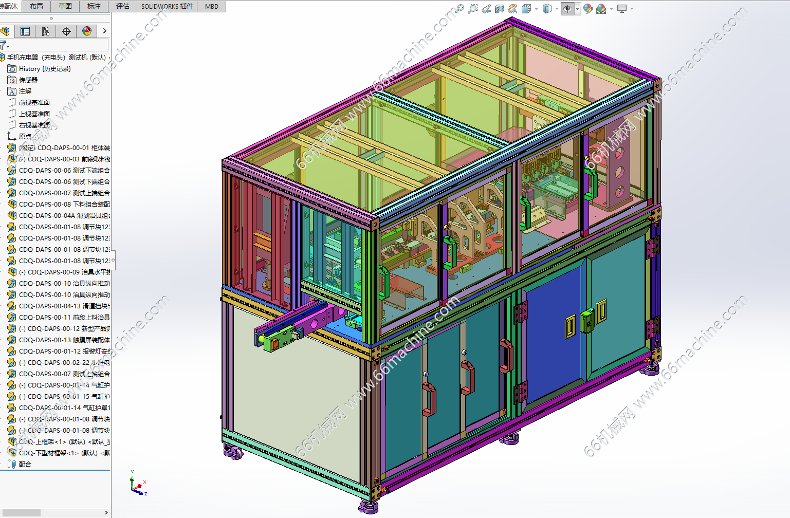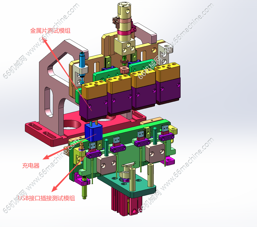 本模型为某企业手机充电器(充电头)测试机(检测机),主要由下机架、机罩、上料移栽模组、多工位夹取下料移栽模组、充电器金属片测试模组、USB接口及金属片测试模组等组成,主要用于手机充电器的质量检测,利用治具定位自动切换工位,自动化程度高,可用于大批量检测使用。