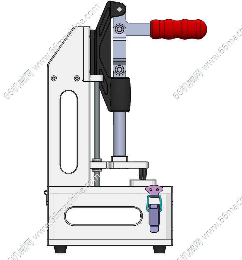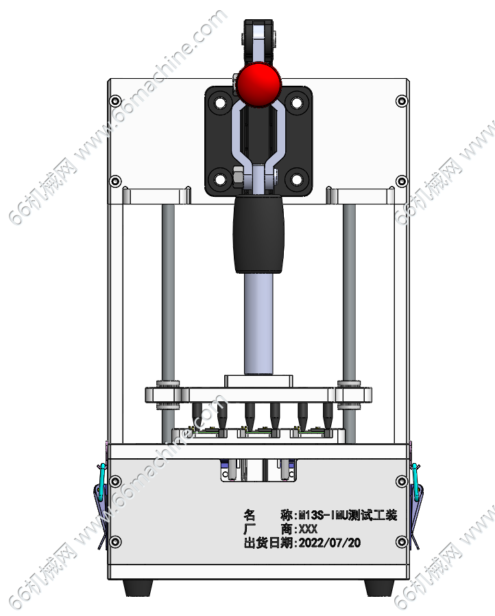 本模型为手动压合式PCBA测试工装,采用快速夹钳驱动上压板下压,通过导柱导向保证同轴度,底座载板可同时定位多片PCBA模块,配合上压板的探针组实现一次性压接测试点,适用于消费电子、工业传感器的PCBA测试。