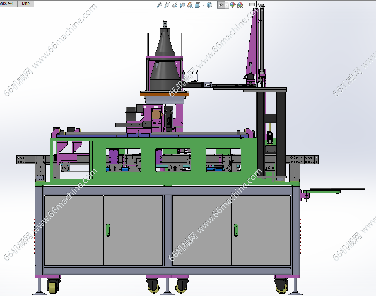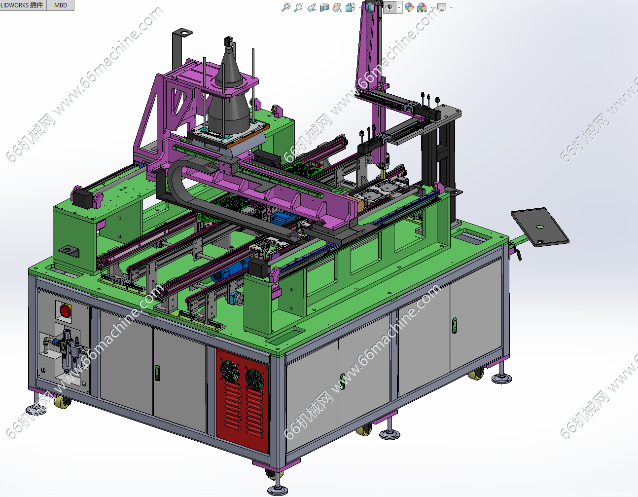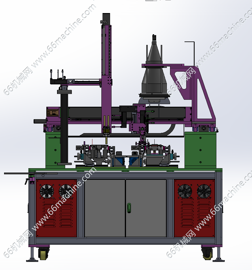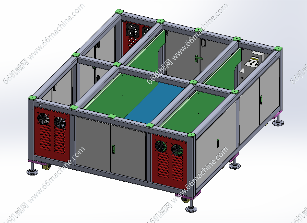 本模型为通用型视觉检查分拣机,主要由下机架、龙门吸取移送模组、条码扫描组件、视觉相机及2条载具输送线组成,产品放入载具内,由输送线流入,视觉进行检查并将NG品分拣至另一条载具线并扫码产品条形码进行记录,该设备通用性强,适用于多种小件产品检查及分拣,欢迎参考!