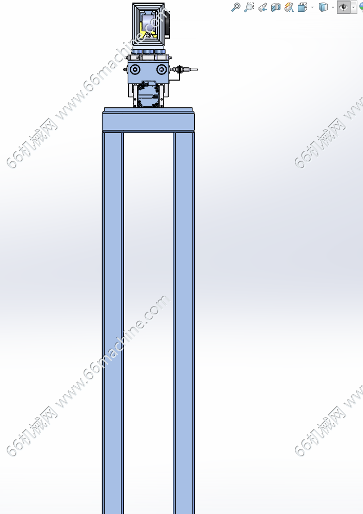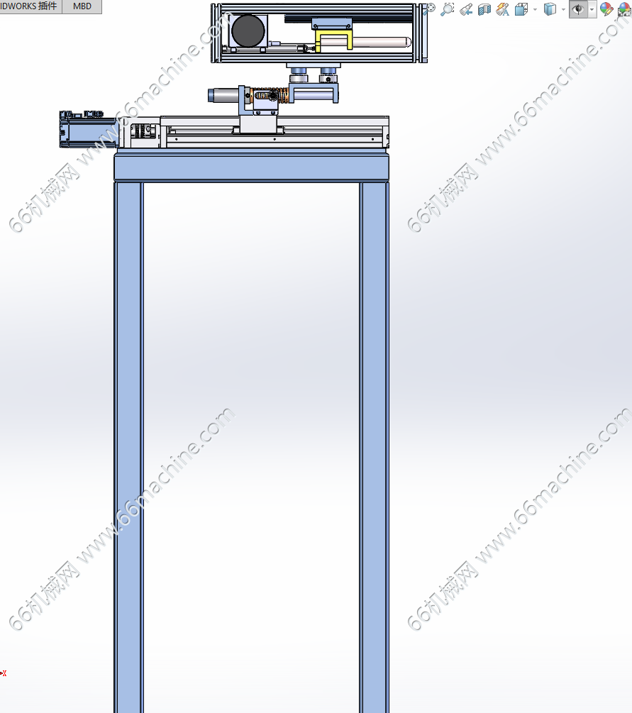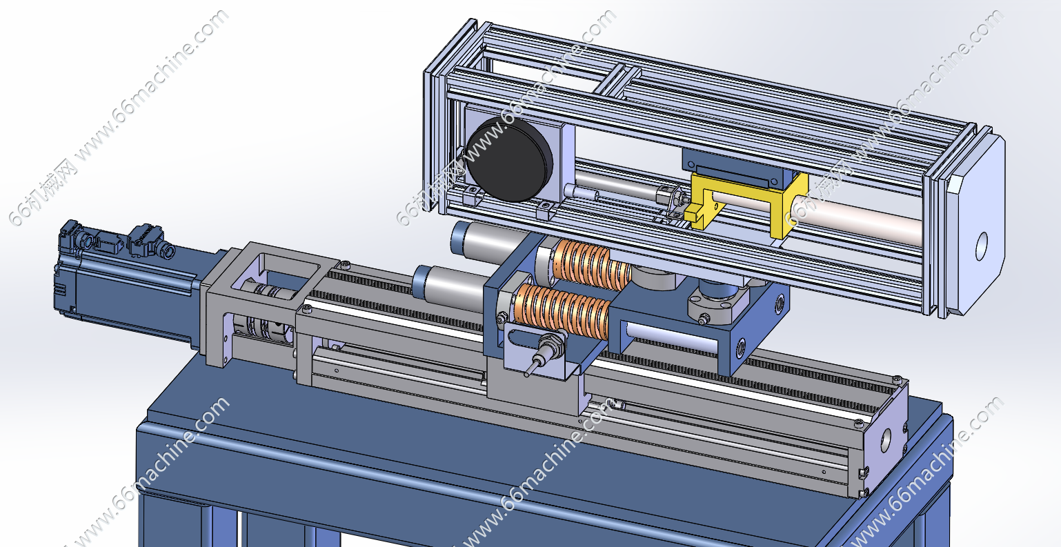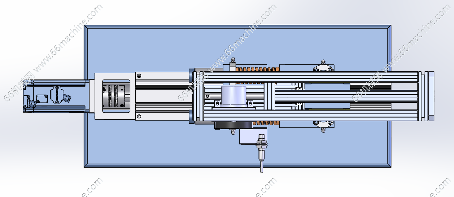 本模型为前后移动超声波测量装置,由移动模组、防爆伺服电机、压缩弹簧、直线轴承、接近开关、球面轴承、拉伸编码器、推进气缸、直线导轨、超声波探头等组成。工作过程如下:当工件就位后,工件两端的测量装置同时工作,伺服电机驱动移动模组滑块移动,带动测量装置整体向前移动,当测量基准面与工件端面接触后,压缩弹簧不断压缩,同时球面轴承自动调整测量基准面和工件端面的相对角度,从而保证二者完全贴合,当弹簧压缩到位后会触发接近开关,使得伺服电机停止向前推进,此时测量基准面和工件表面已经充分贴合,随后推进气缸推动直线导轨滑块向前移动,带动测量头伸入工件孔内,当测量头接触到工件填充物时气缸会自动停下,通过拉伸编码器数值的变化即可测量出落差的高度即孔的深度。