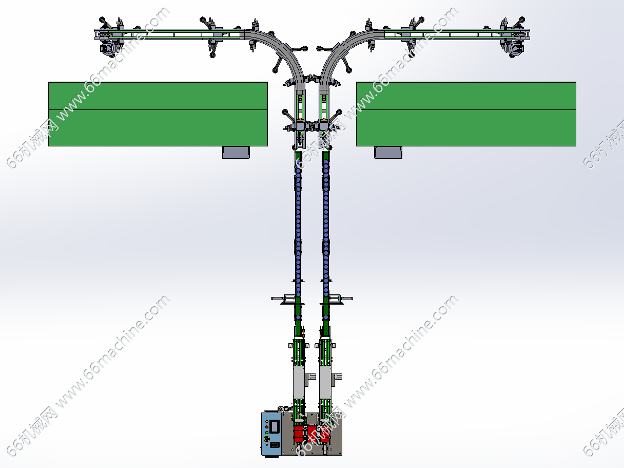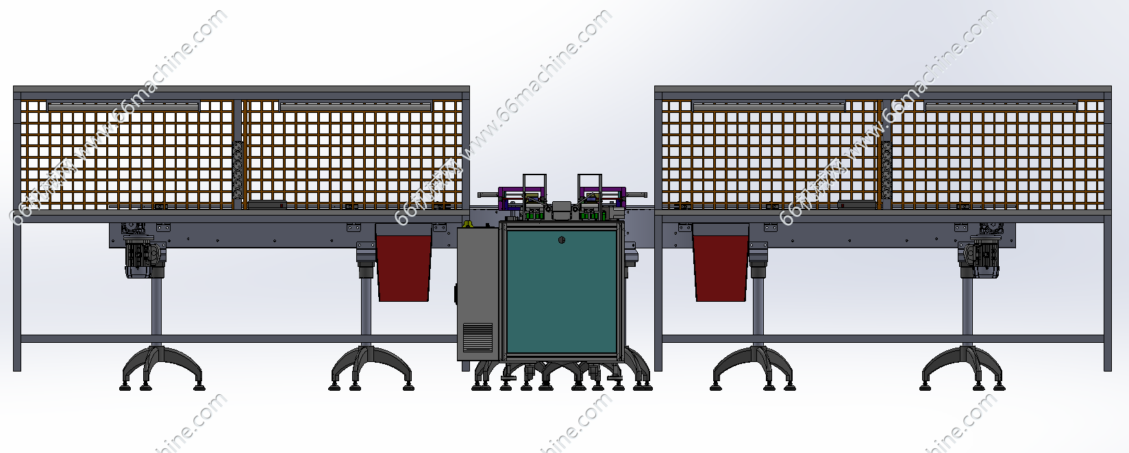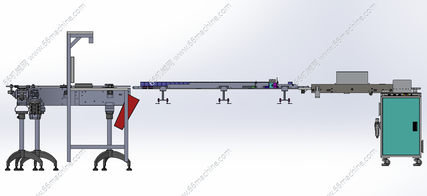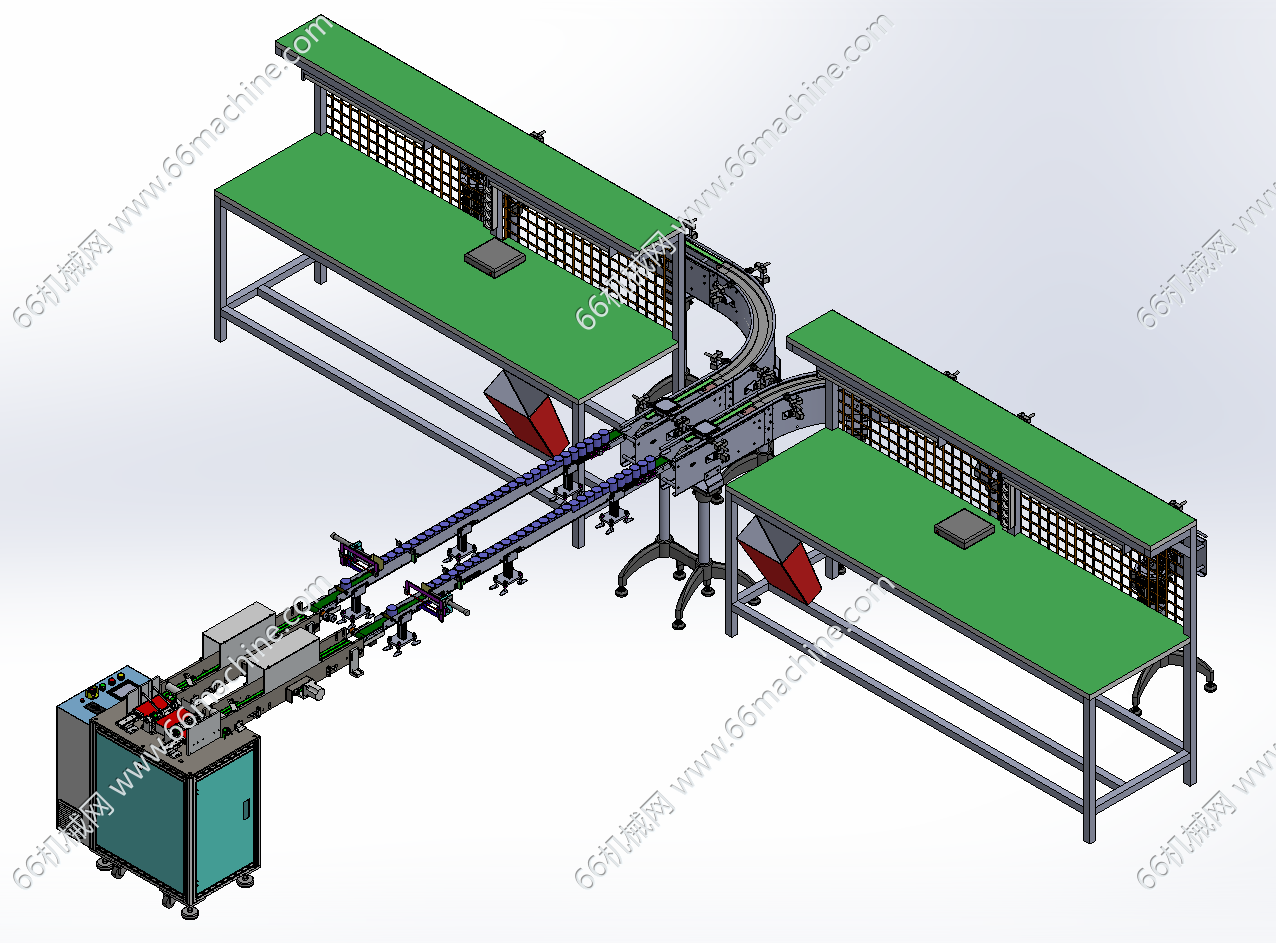 本模型为通用型产品检测输送线,产品经前端设备加工后,由输送线转运,通过人工检测剔除NG产品,再经弯道输送线分流至不同仓储或包装区域,保障产品质量与流转效率。