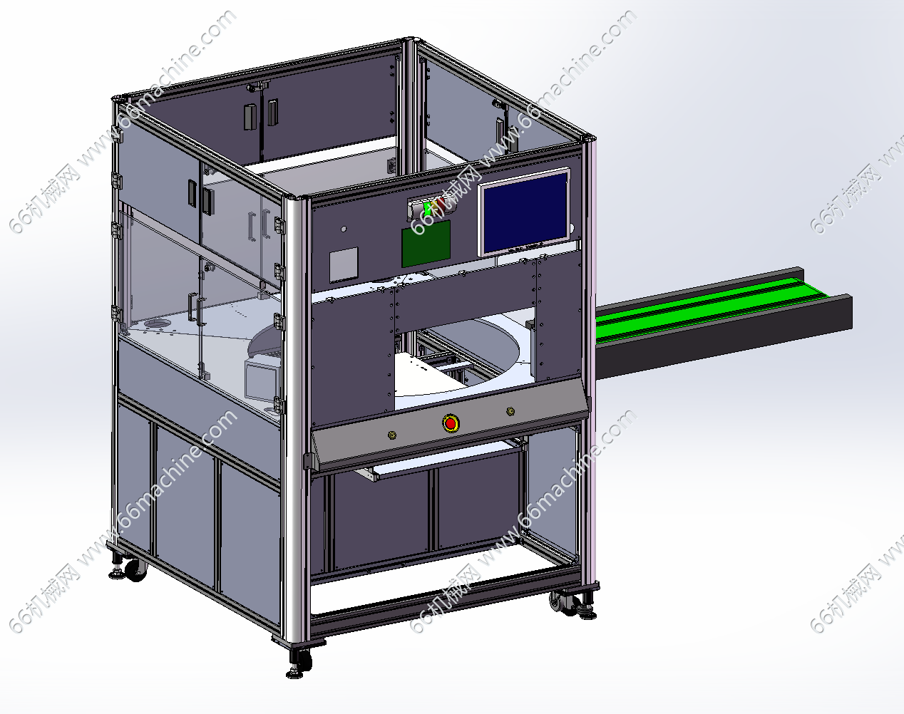 本模型为显示屏(背光屏)视觉检查机,主要由视觉相机、四工位转盘、吸取上料机械手、机架及机罩等组成,背光屏是指采用背光光源实现图像显示的屏幕技术,通常由液晶层(LCD)和独立背光模组构成。本设备主要用于背光屏的外观检测,仅供大家参考!