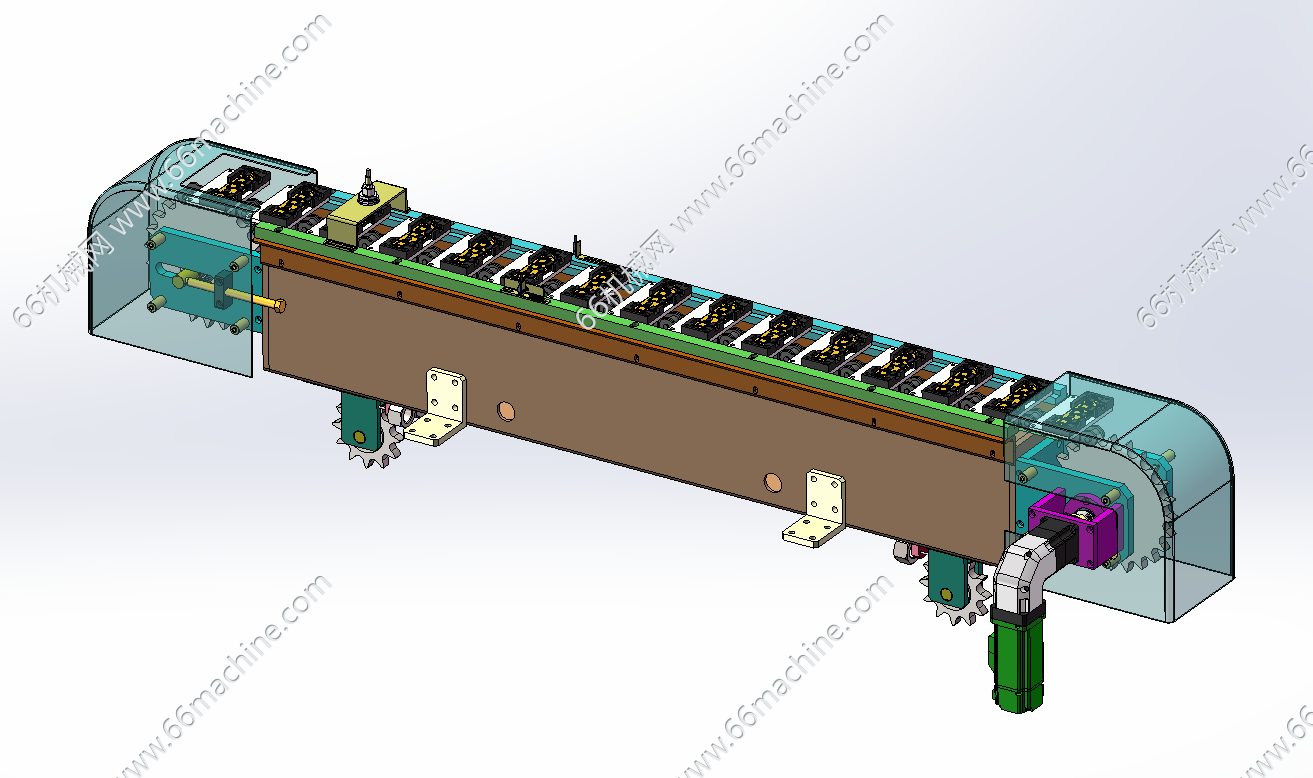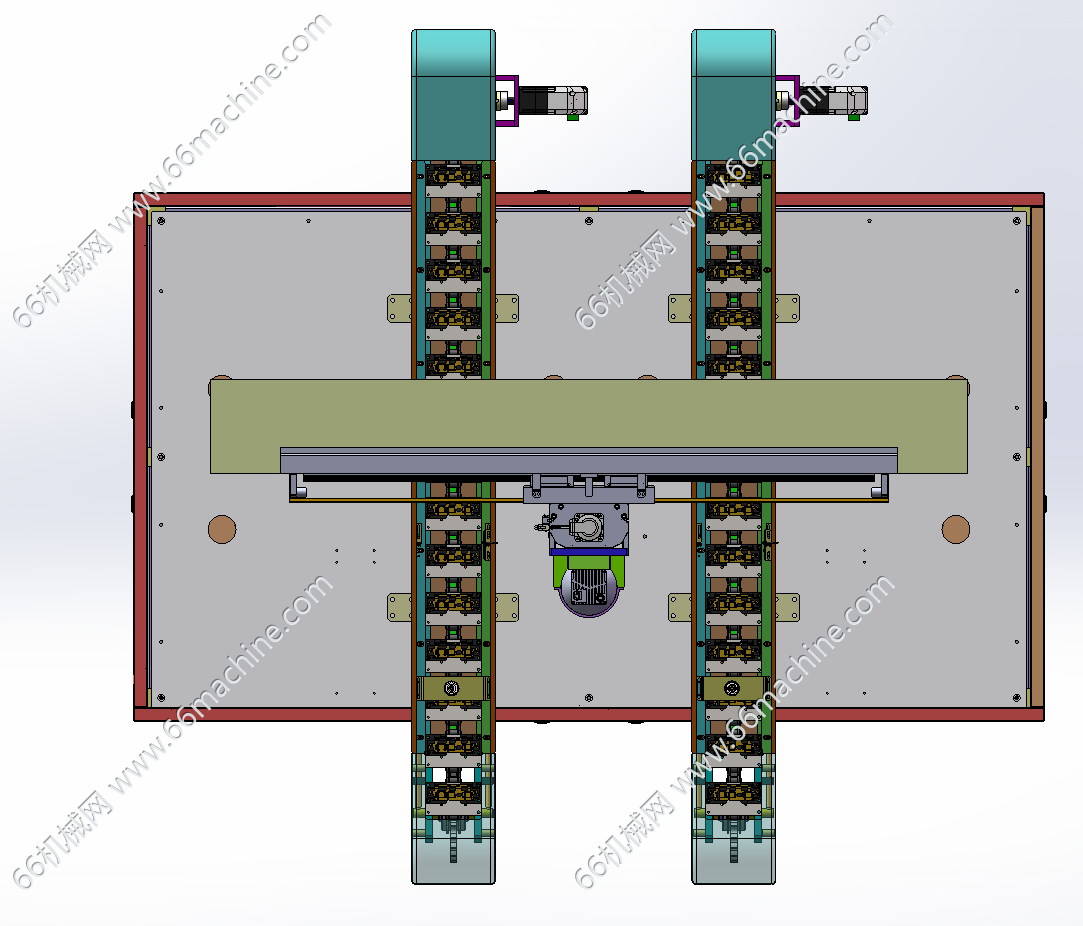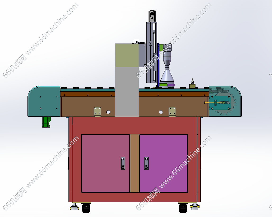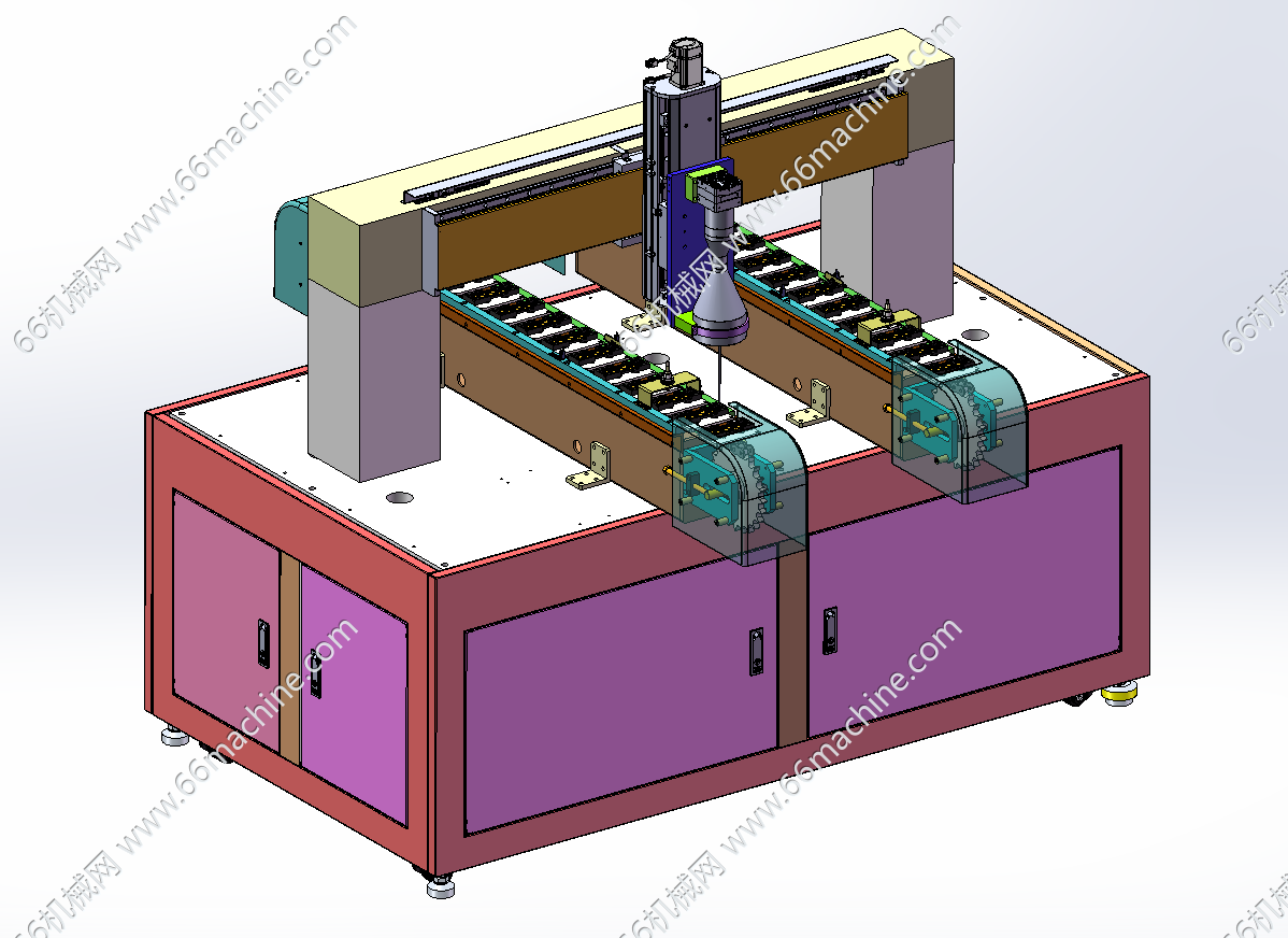 本模型为双工位链条定位输送视觉检测机,通过相机镜头在X轴的带动下左右移动检测双工位的链条上面的产品,产品是人工上料到输送机上,从设备前面进料,检测完后,从设备后面链条输送机输出到对接设备上。欢迎参考!
