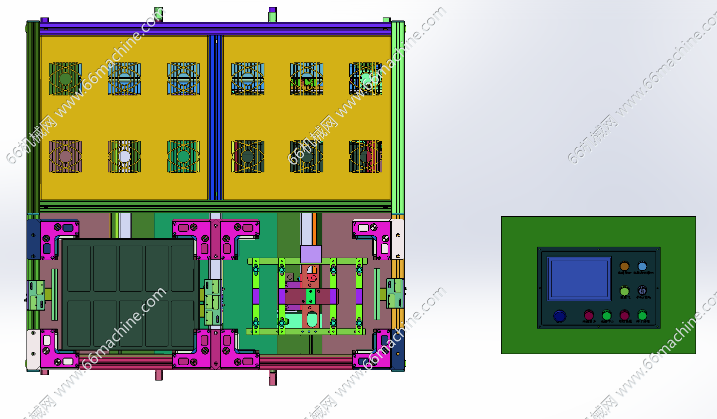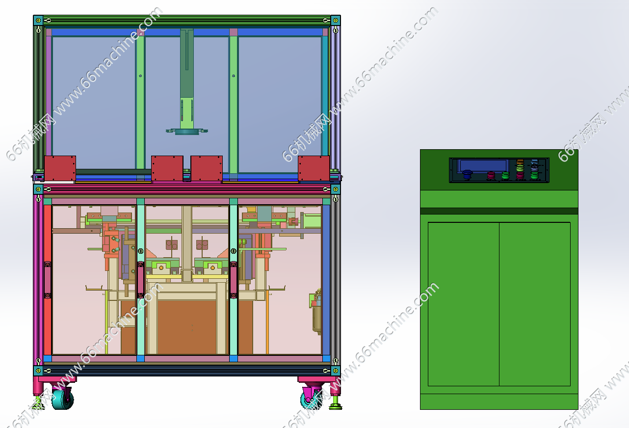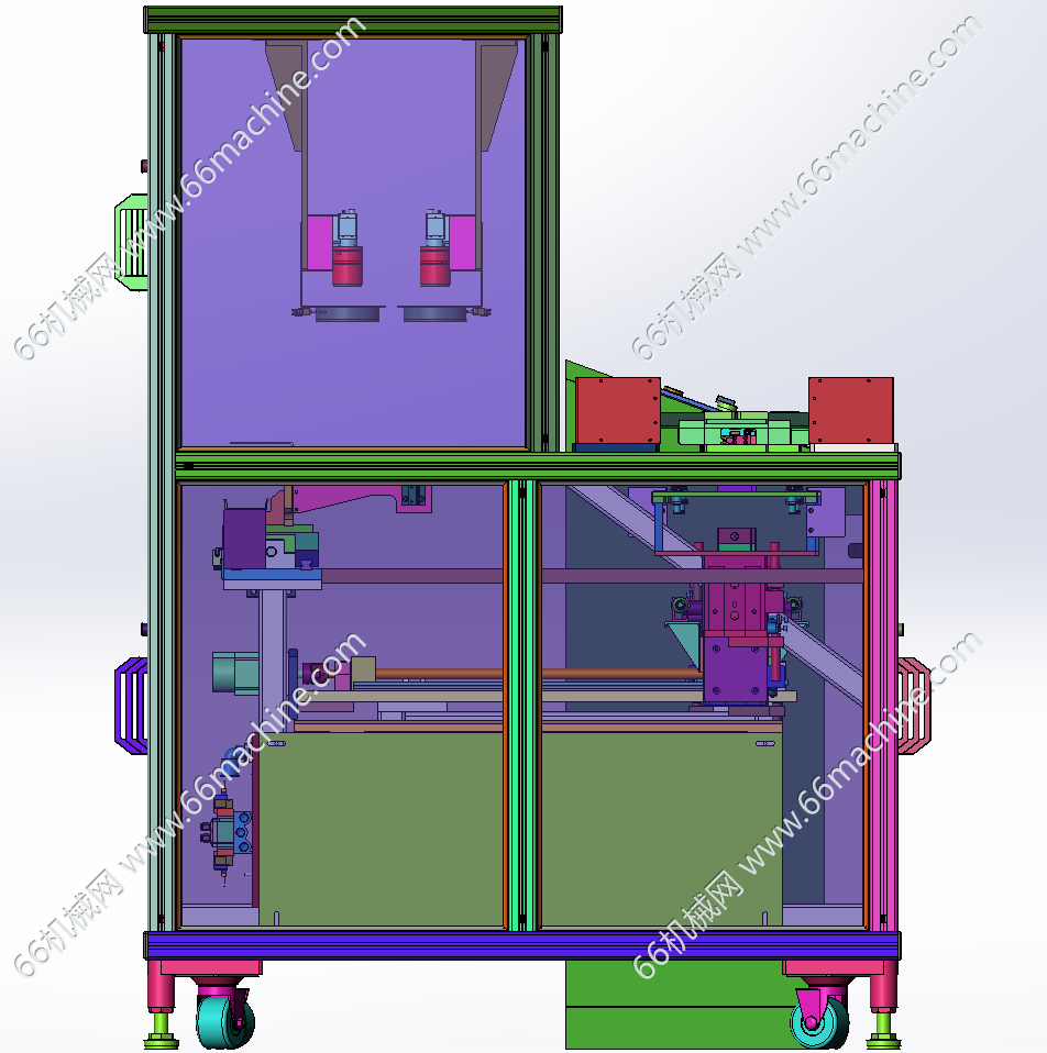 本模型为通用型小产品视觉检测机,主要由下机架、机罩、托盘伺服移送模组、托盘吸取伺服移送模组、视觉相机、控制柜组成,将产品放入托盘单元格内,伺服移送模组接力实现进料——横移(同时视觉检测)——出料,欢迎下载参考!