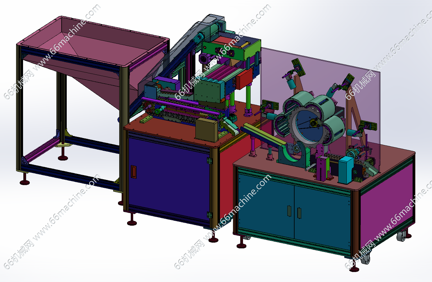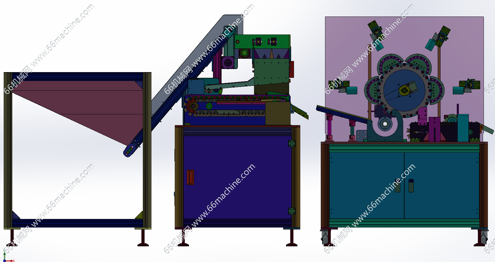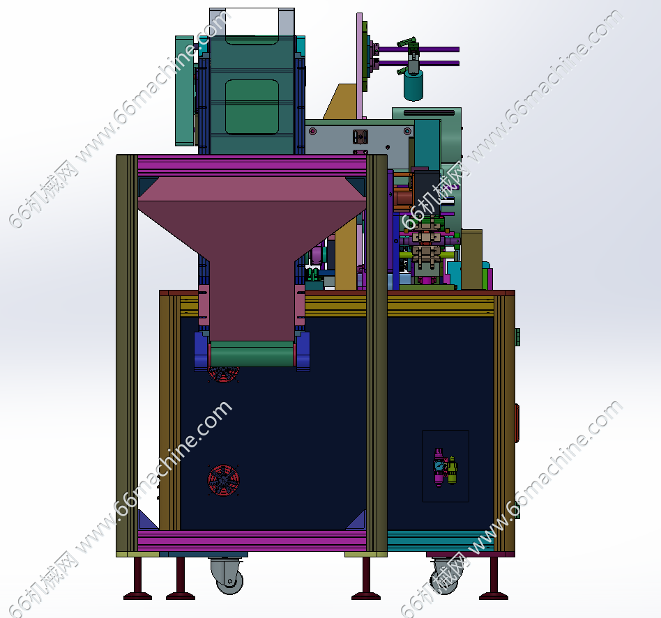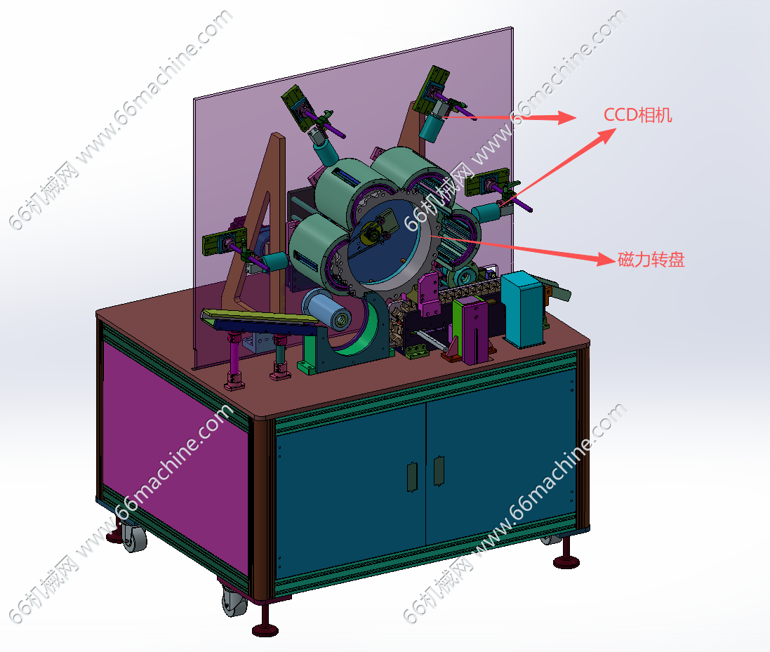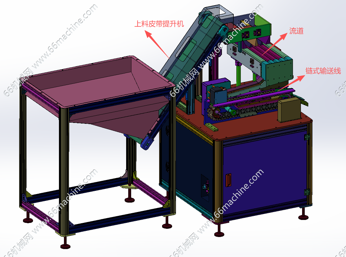本模型为某企业18650圆柱电池排序及CCD检测机(检查机),由上料排序机及CCD检测机组成,人工把杂乱的圆柱电池倒入漏斗,上料皮带把钢壳提升到后边皮带线上,利用速度差把圆柱电池分成一个个的,进入S弯道后,经过下面的链条把圆柱电池送至检测机,伺服电机带动的磁力转盘把电池一颗颗转到对应的CCD检测工位进行外观检测,仅供大家参考!