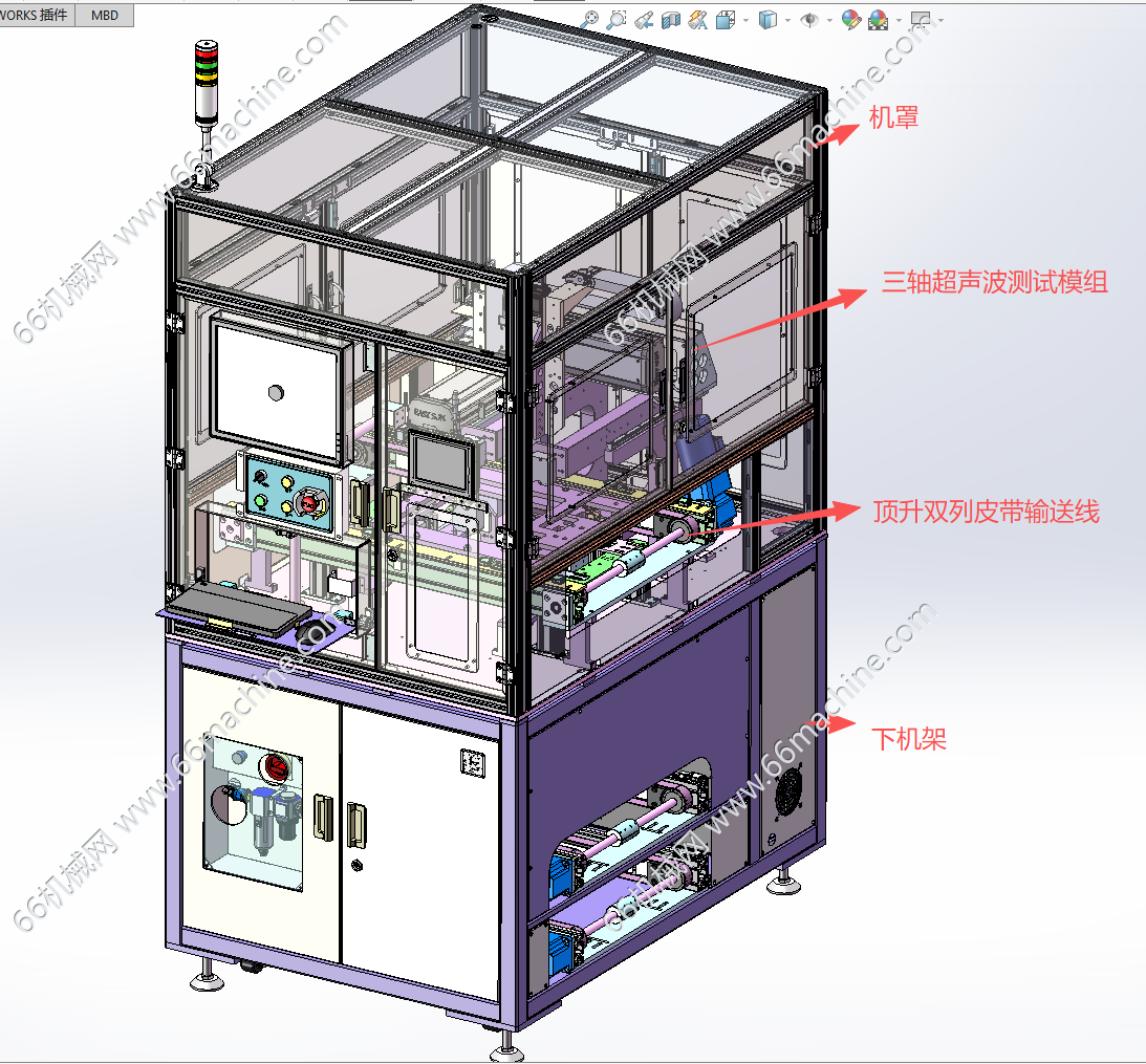 本设备为某企业在线式超声波测试机(产品缺陷检测机),超声波检测是一种利用超声波在材料中传播、反射和散射的特性来检测材料内部缺陷、结构和性能的方法。本设备主要由下机架、机罩、载具顶升双列皮带输送线、三轴超声波测试模组等组成,用于在线检测载具内产品的内部缺陷,可以实现无损检测,可供大家参考!