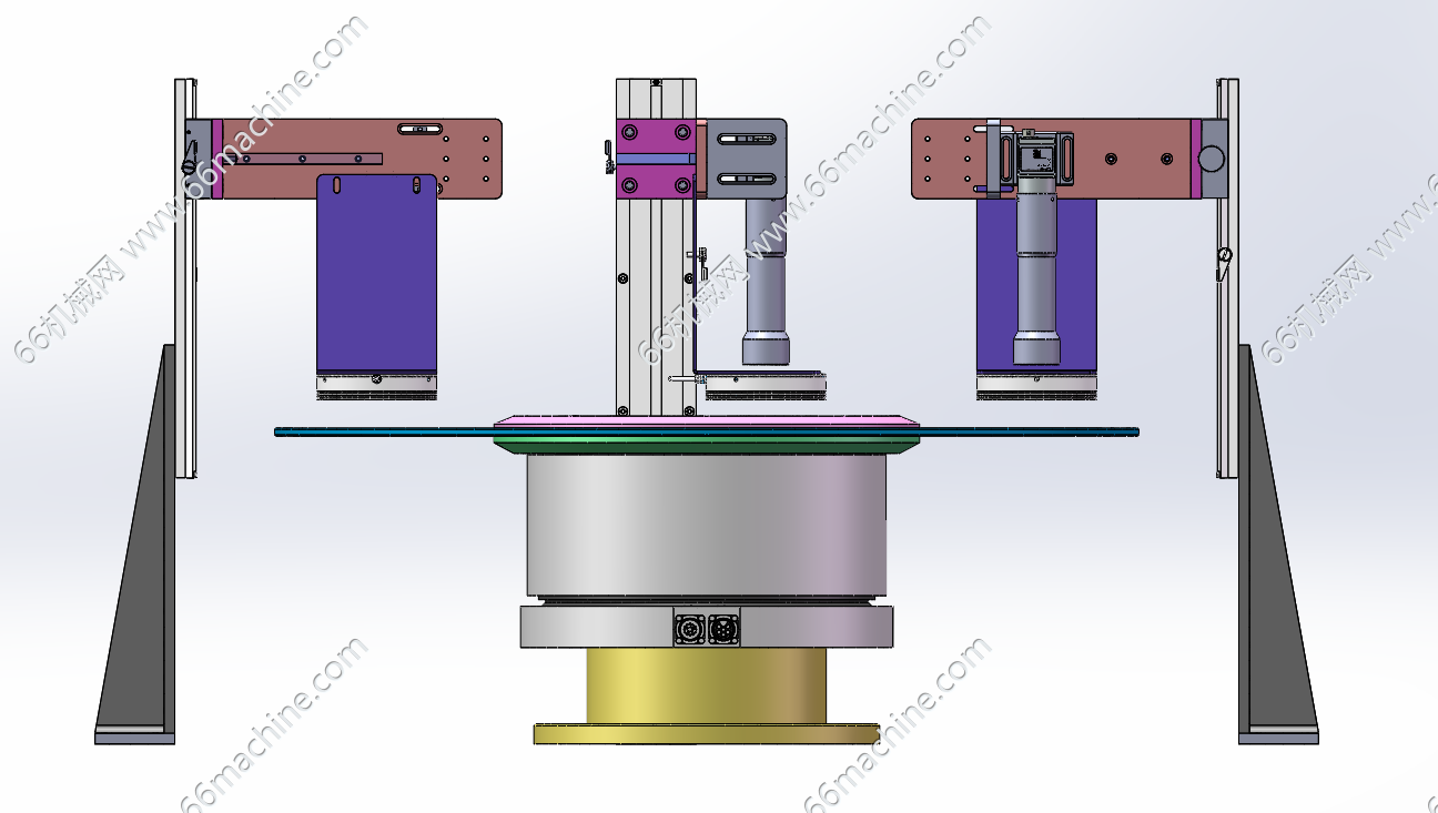 本模型为三工位转盘式视觉检查机,采用精密电动旋转台,内置驱动与分度机构,可带动圆盘工作台做间歇式转动,实现工位切换,主要用于工业生产中的自动化检测中。