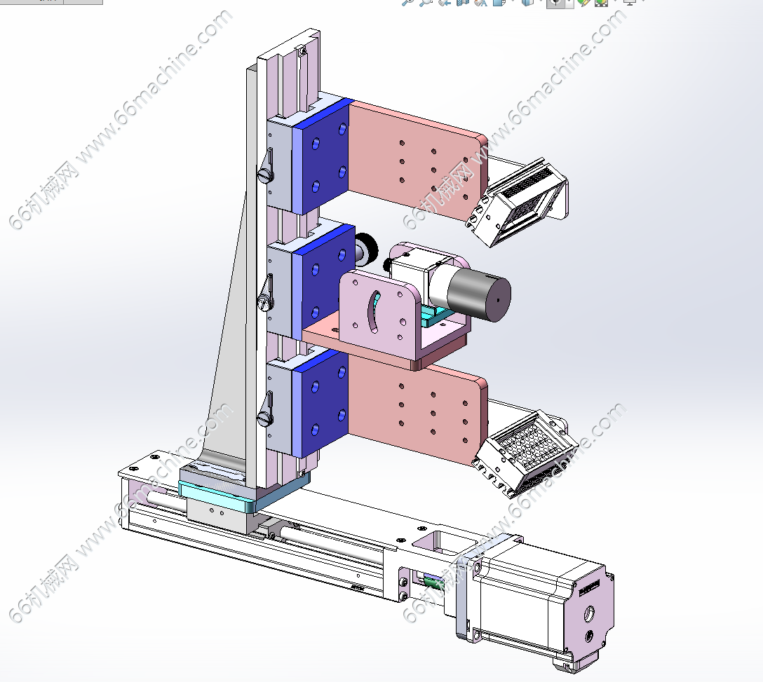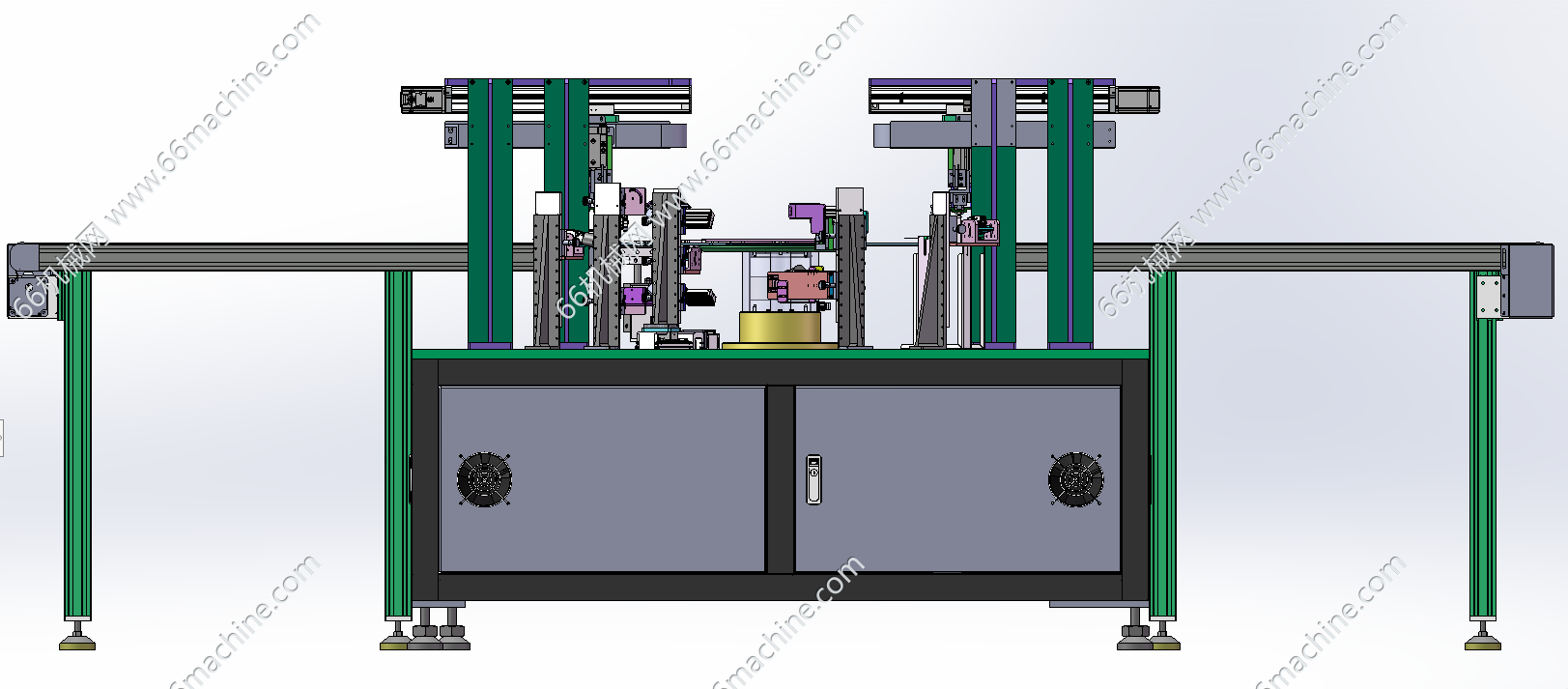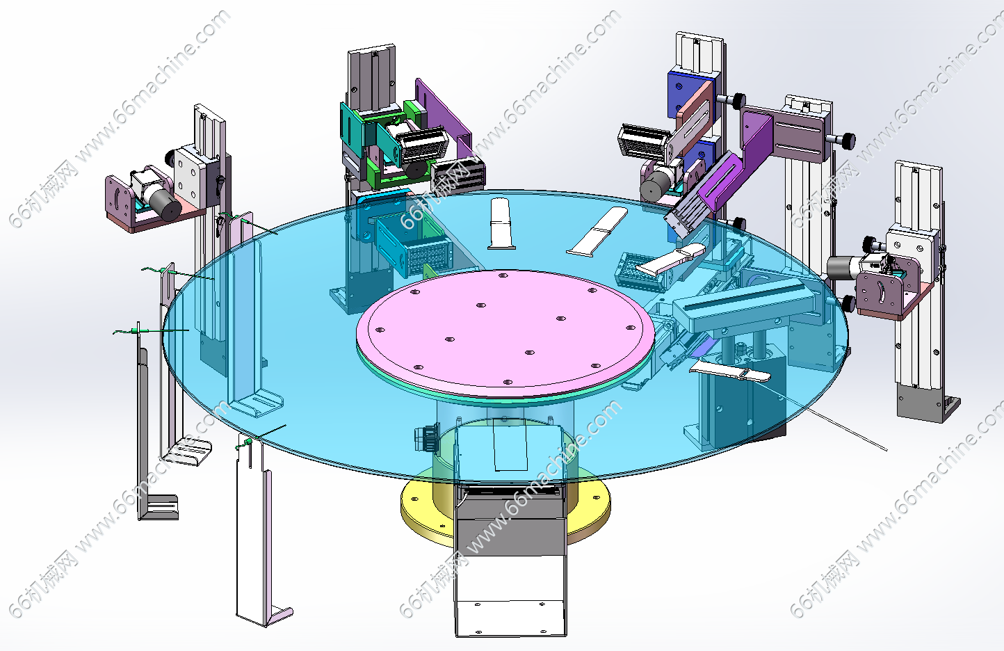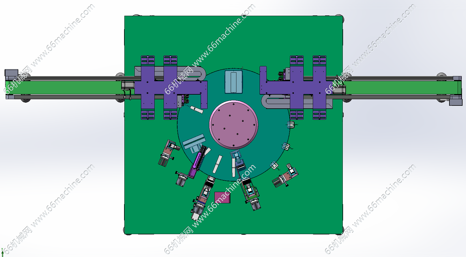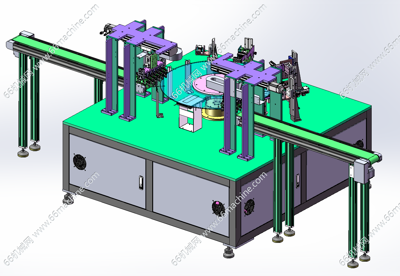 本模型为某企业通用型自动上下料转盘视觉检测设备,产品由皮带机输送至搬运机构下方,由搬运机构把物料搬运到玻璃转盘上,通过玻璃转盘工位视觉检测机构检测产品的缺陷。检测完后,再由另一侧的搬运机构把物料搬运到下料皮带机上输出。本设备通用性强,适用于各种零部件的的检测,欢迎参考!