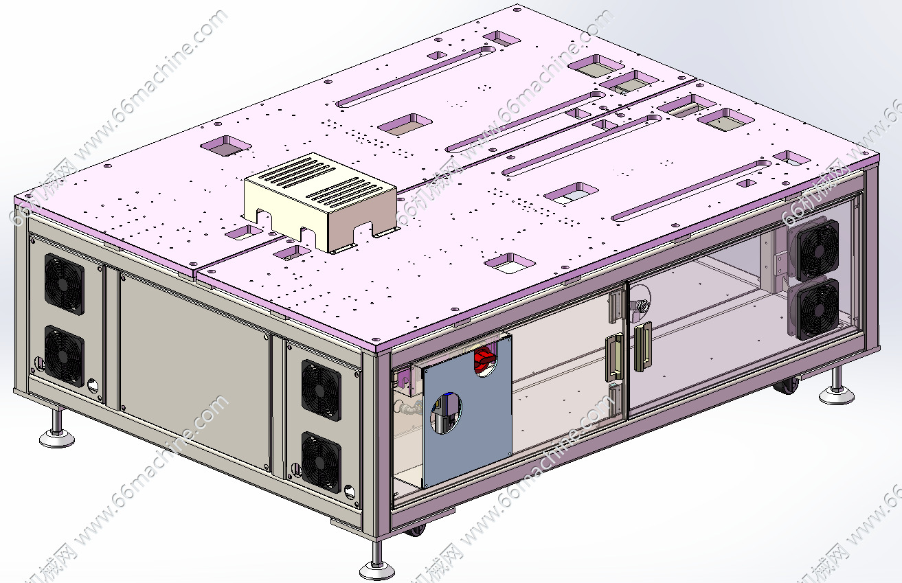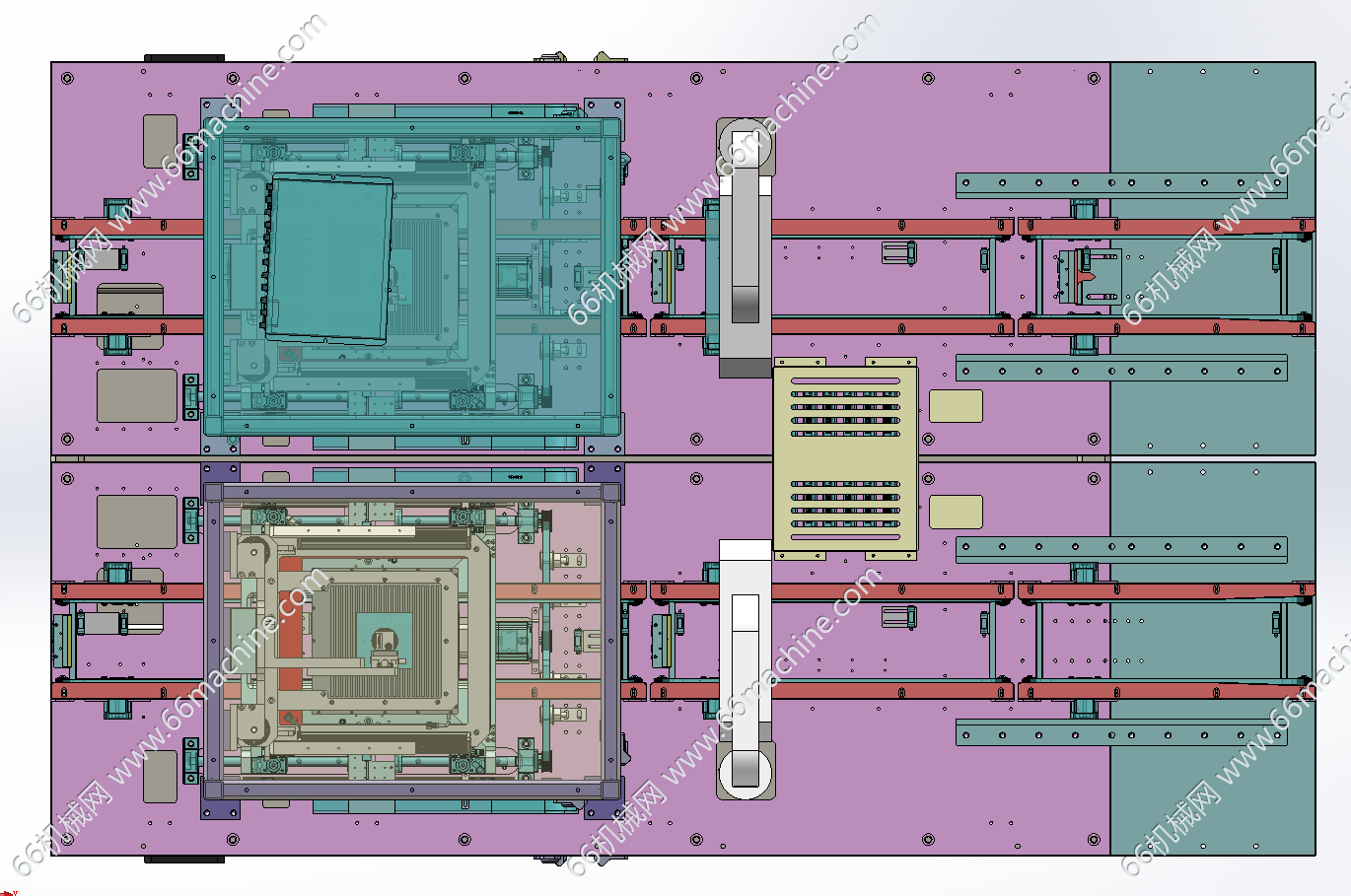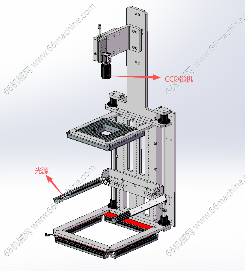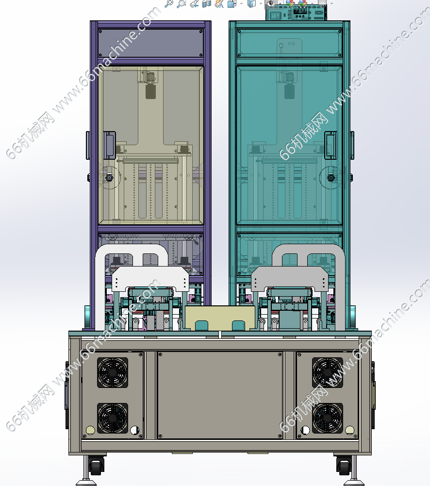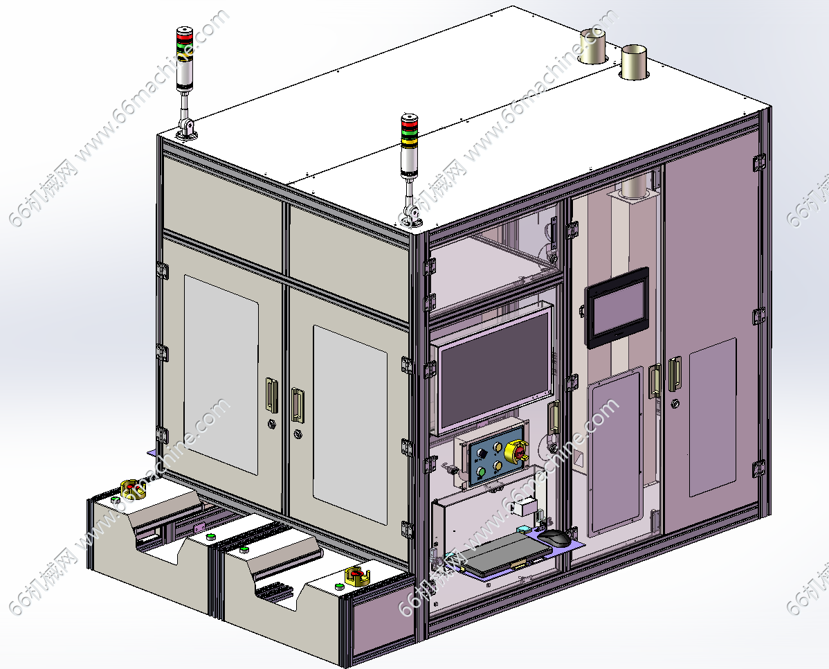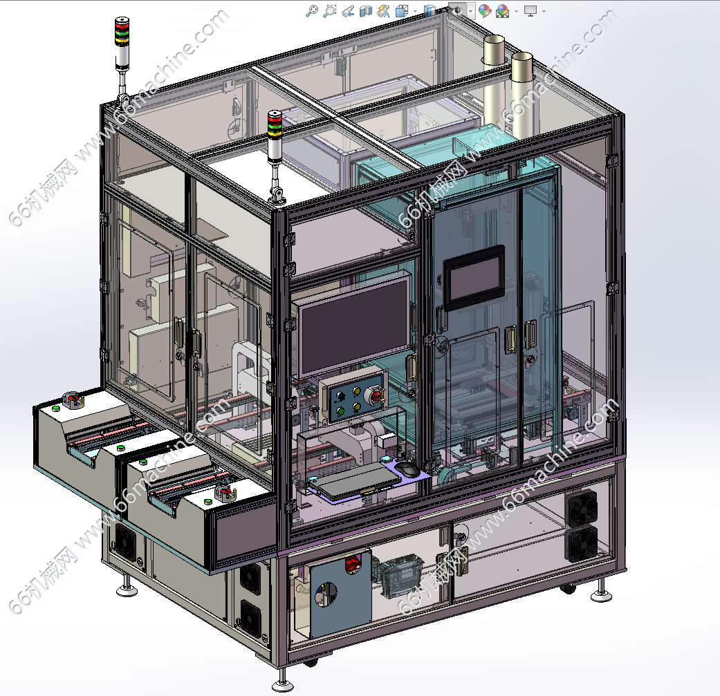 本模型为通用型电子元器件双流道视觉外观检查机,主要由下机架、机罩、2组皮带输送线、2组CCD视觉模组等组成,将电子元器件放入载盘内,沿着皮带输送线流入到CCD位进行外观检查,该设备通用型强,适用于绝大部分小产品的外观检查,可供大家参考!
