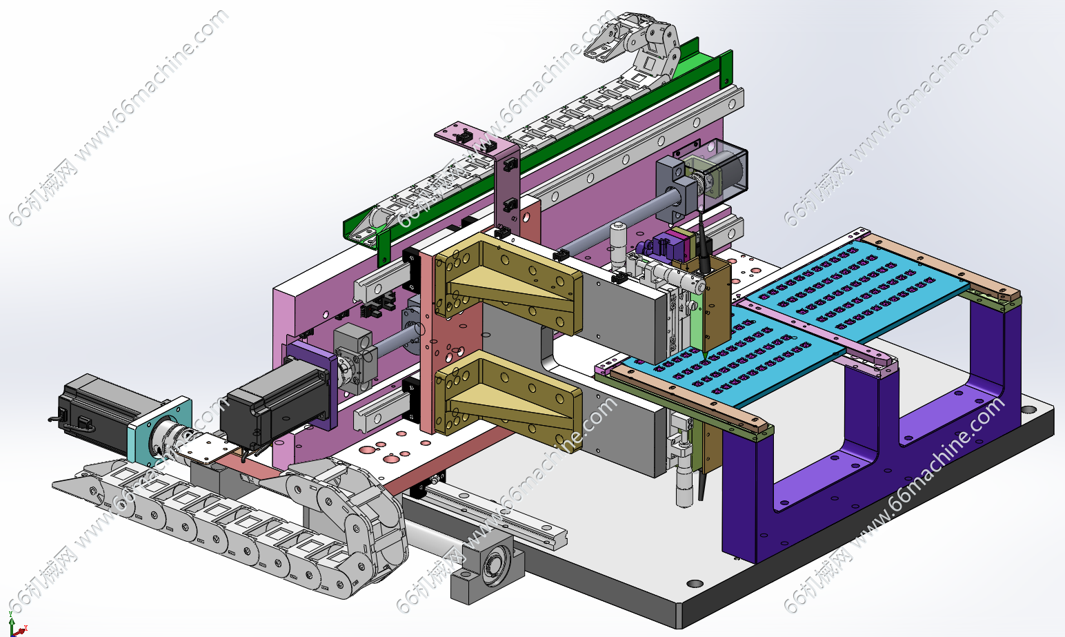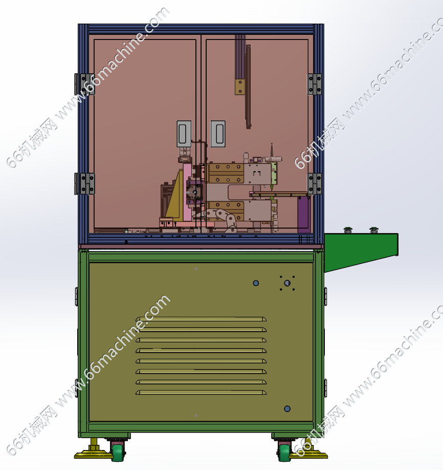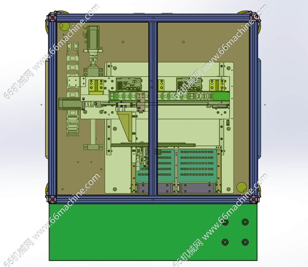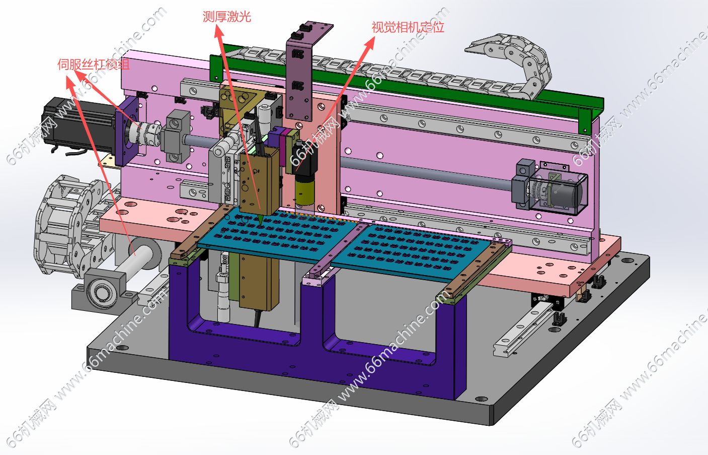 本模型为载具内产品激光厚度检测机,主要由下机架、机罩、载具、激光检测模组等组成,人工将小件产品放置在载具内,视觉引导激光模组对其进行厚度检测,欢迎下载参考!