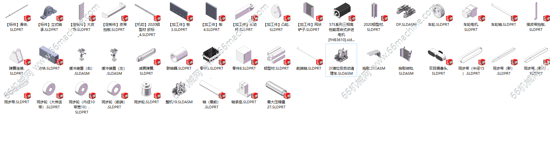 这是一款沙滩垃圾自动清理车,它包括三部分,第一部分,垃圾拾取装置采用扫荡,以及偏心轮的抖动进行高效去沙拾取垃圾,第二部分是减震底盘,使机器人在沙滩中稳定运行,第三部分是垃圾自动清理装置,当垃圾拾取到一定程度,他会通过链条传动进行自动倾倒,达到垃圾清理。本模型建模精巧,可供大家参考!