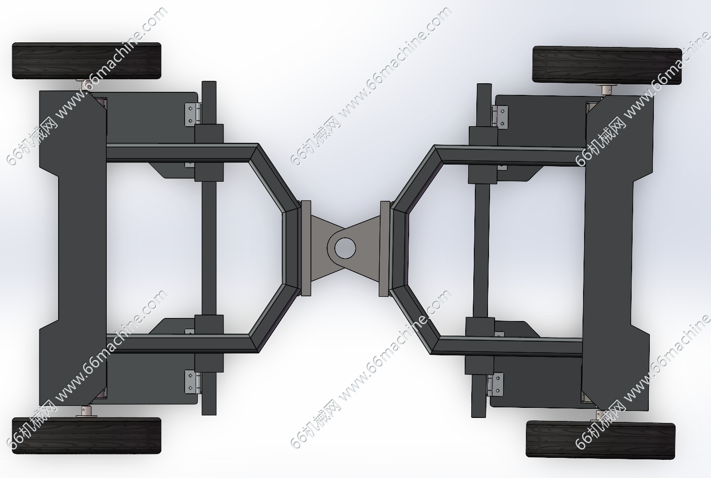 本模型为差速驱动铰接底盘(四驱铰接式AGV车),采用四驱结构,前车架和后车架采用铰接结构,铰点可以绕垂直轴左右摆动,实现前后车架相对转向,转弯半径极小,灵活性远高于传统整体式车架,适合狭窄空间作业。