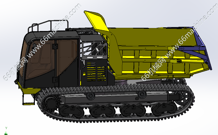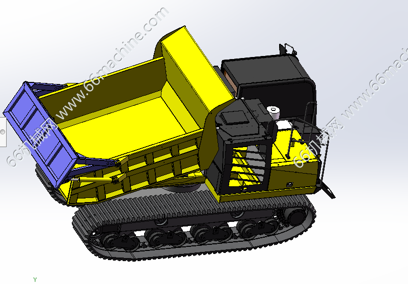 本模型为IC70R新型履带自卸运输车的基本结构 ,是参考图片,图册等资料绘图的,仅用于参考。履带底盘作为动力行走。底盘之上采用全回转结构 前面是驾驶室。后面是车厢,可液压自卸,载重7吨起。
