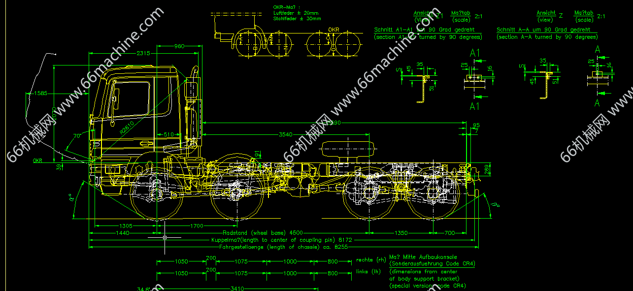 本图纸为奔驰牵引车外形尺寸图,图纸包含四视图(左右视图),配有技术要求等说明,CAD2007版本,可做参照,为专业人员设计,可供大家探讨学习!