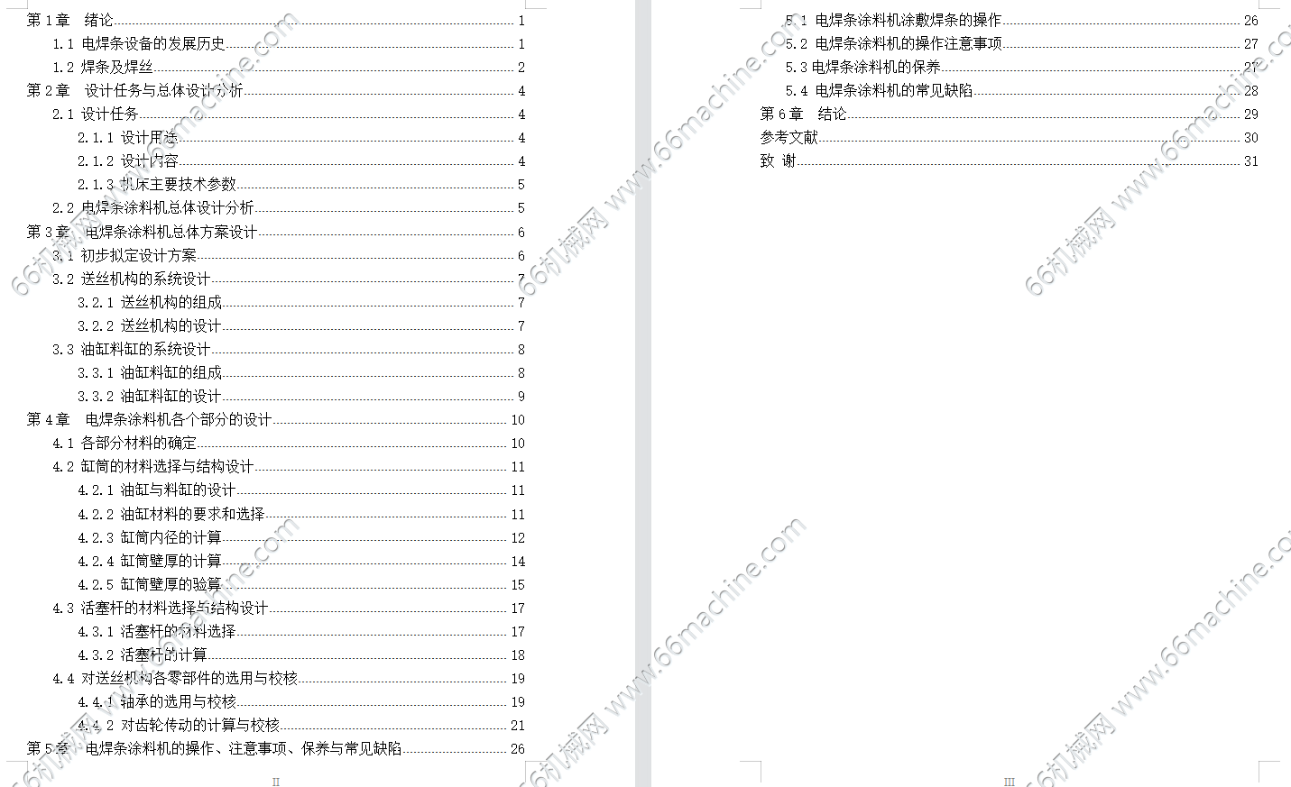 摘 要: 近年来,随着我国的焊接技术逐步走向成熟,各行各业对电焊条的需求量也随之增加,而目前我国此种电焊条生产设备的发展水平还比较低,所以,设计一台结构简单、价格合理、压涂质量好、药粉耗量小的电焊条涂料机很有必要。本次毕业设计的内容是一台60T电焊条涂料机,此种涂料机主要应用于电焊条生产厂家对小批量的电焊条进行压涂生产,也可用于实验室及焊接科研单位涂敷焊条试样。 本次设计的内容为60T电焊条涂料机的总体外观、送丝机构、料缸、油缸的设计。作者从体积和效率等多方面因素综合考虑,在设计过程中运用了不少创新的思想,把许多结构巧妙地运用到设计中,使设计出来的设备更加经济、实用。首先,在送丝机构的设计上,为保证恒定的传动比和传动的准确性,采用了圆柱直齿轮的传动结构;由于蜗轮蜗杆传动具有良好的自锁性能,并能保证运动平稳,还可以起到减速的作用,故在电动机输入到送丝机构的部分采用了蜗轮蜗杆传动;为了避免多根焊丝同时进入轧辊,在锥轮和轧辊之间加入了一块挡板,这样只能允许最下面的一根焊丝通过。其次,在油缸料缸的设计上,为了保证料缸和油缸能够迅速并牢固地连接起来,采用了梯形螺纹连接。这样的结构设计既可以满足焊条生产的需要,又可以达到简化结构的目的。 关键词:电焊条涂料机;油缸;料缸;蜗轮