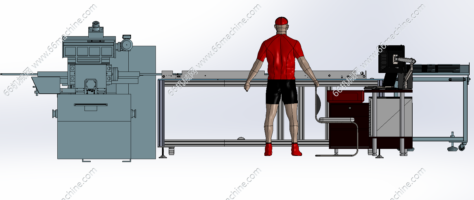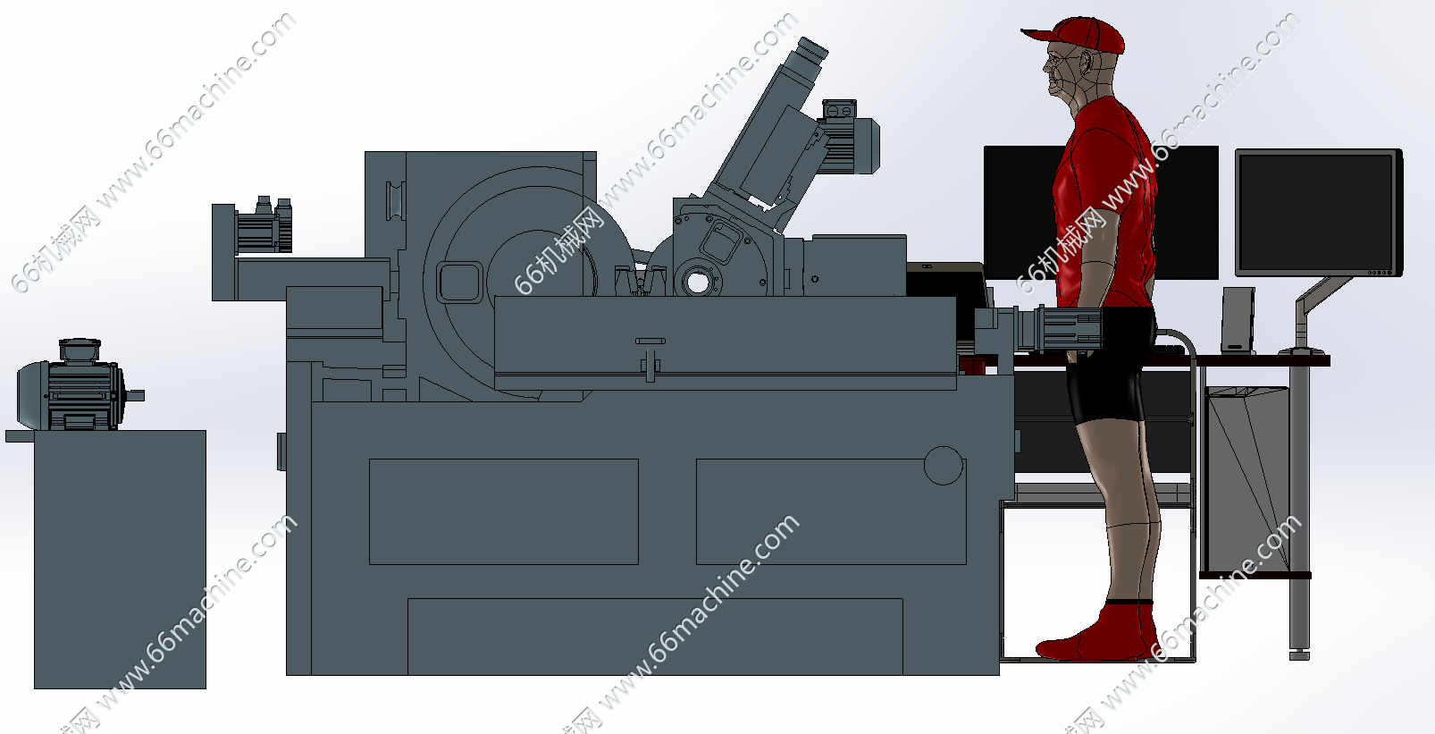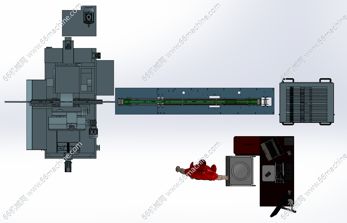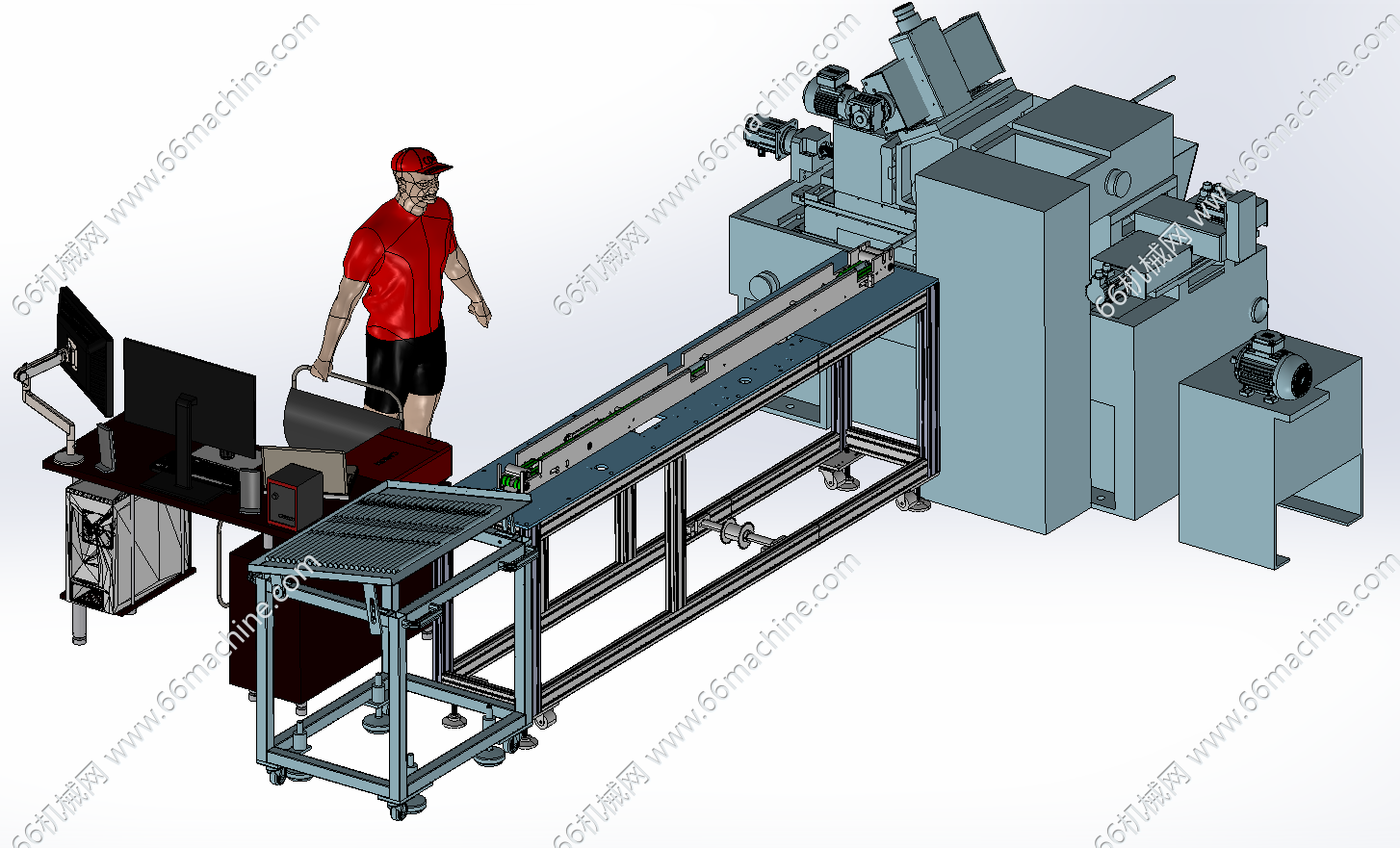 本模型为管、柱、轴类零件磨圆设备,主要由磨圆机、输送线及人工检测台,输送线将加工后的零件输送至检测区域,工作人员在操作工位通过检测设备对零件的尺寸、精度等指标进行检测,同时管理自动化上下料流程,提升零件加工的自动化程度与检测效率。