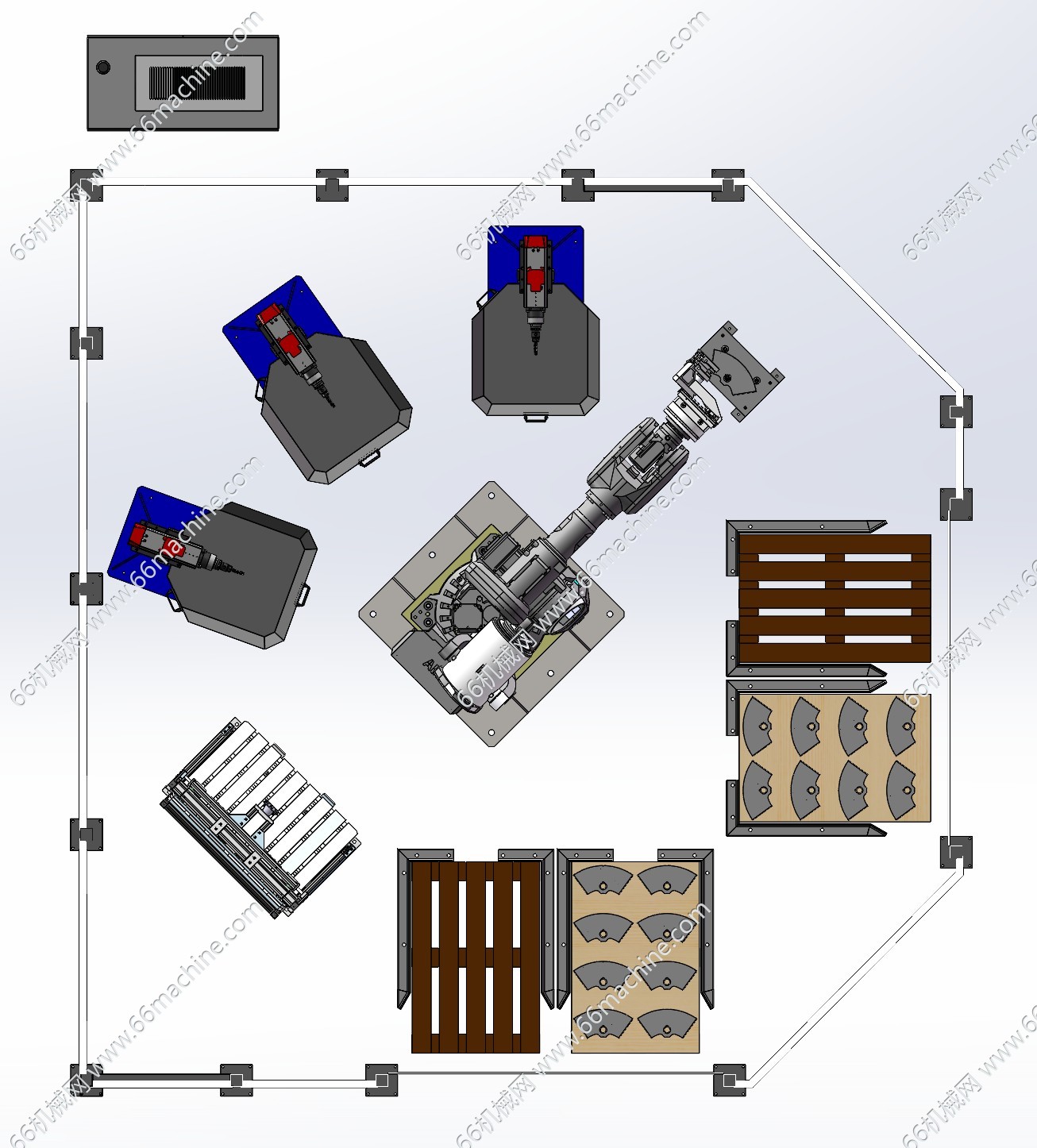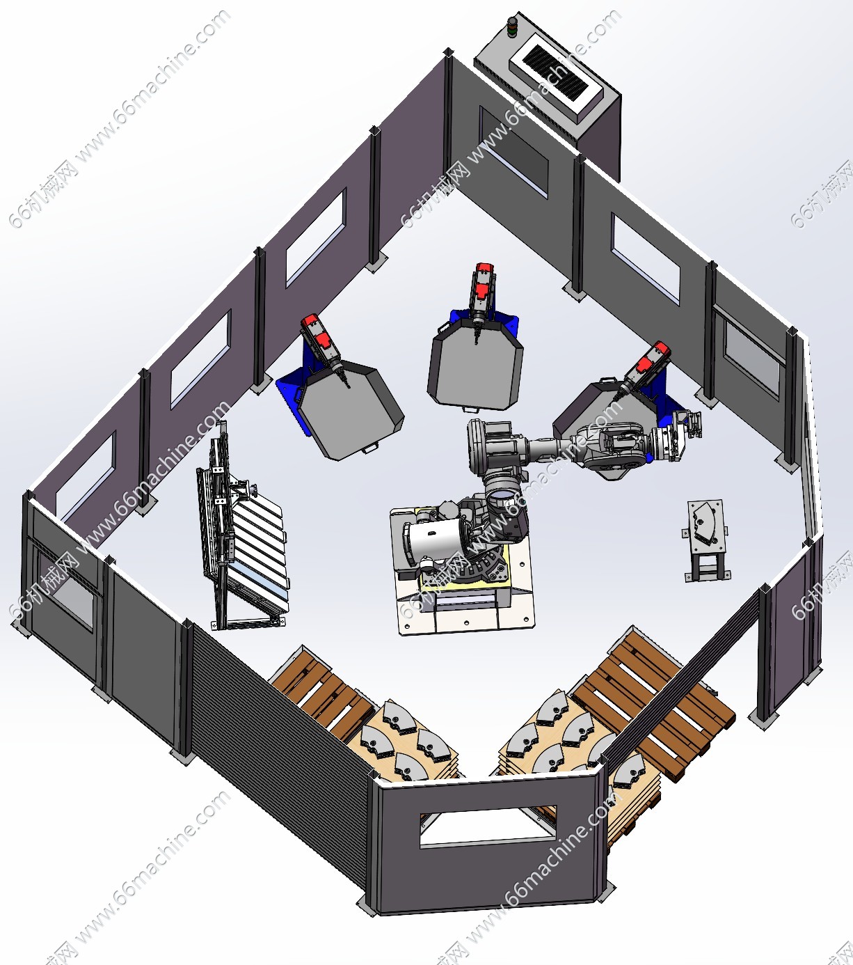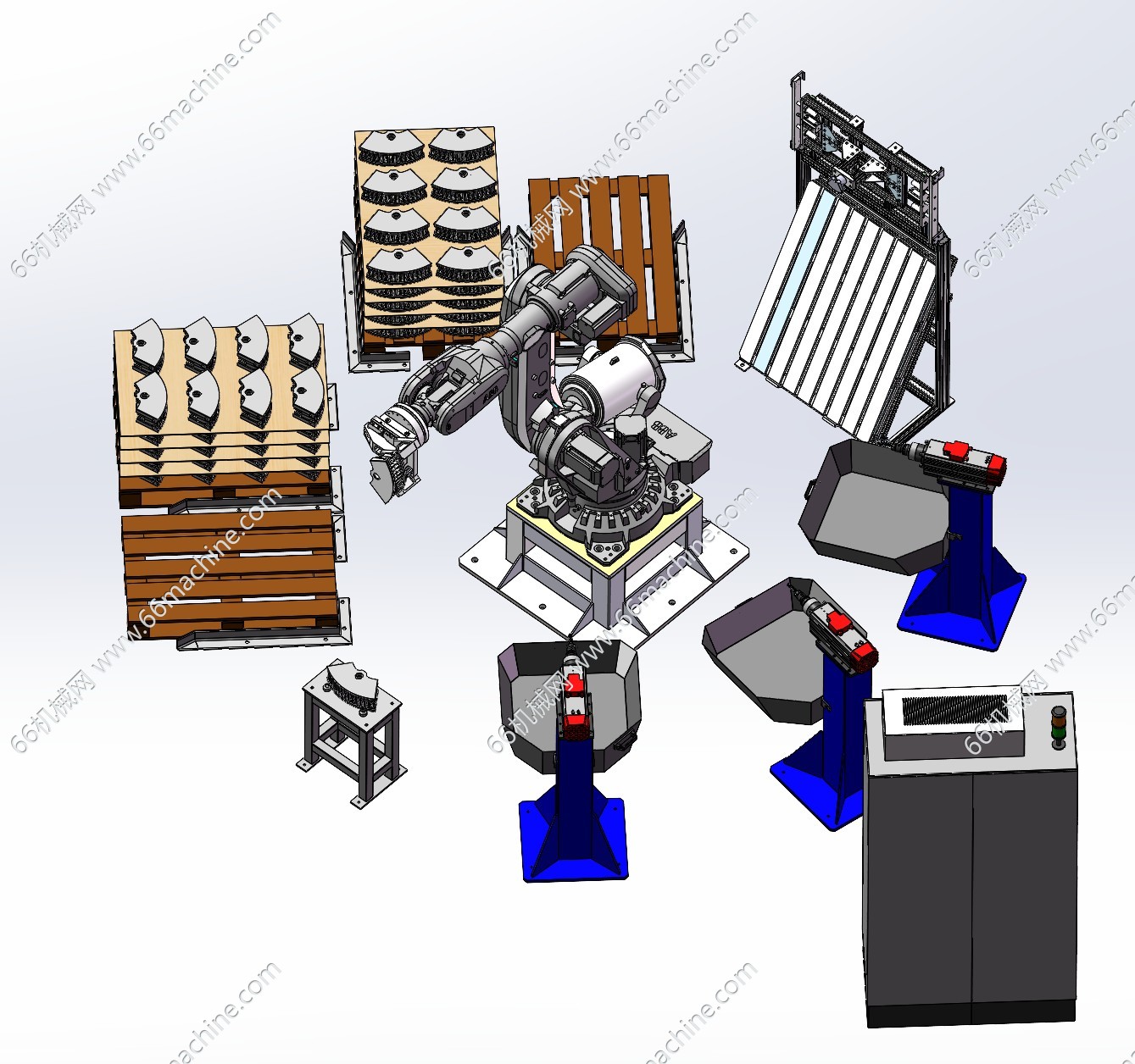 此三维模型为机器人抓件到固定电主轴上打磨去毛刺,来料方式为托盘堆叠来料形式,通过视觉拍照引导机器人从托盘处抓件,放到二次定位台上,机器人从定位台上抓件到电主轴上打磨去毛刺,中间的隔板采用隔板抓手抓取隔板,是成熟产品,欢迎大家下载