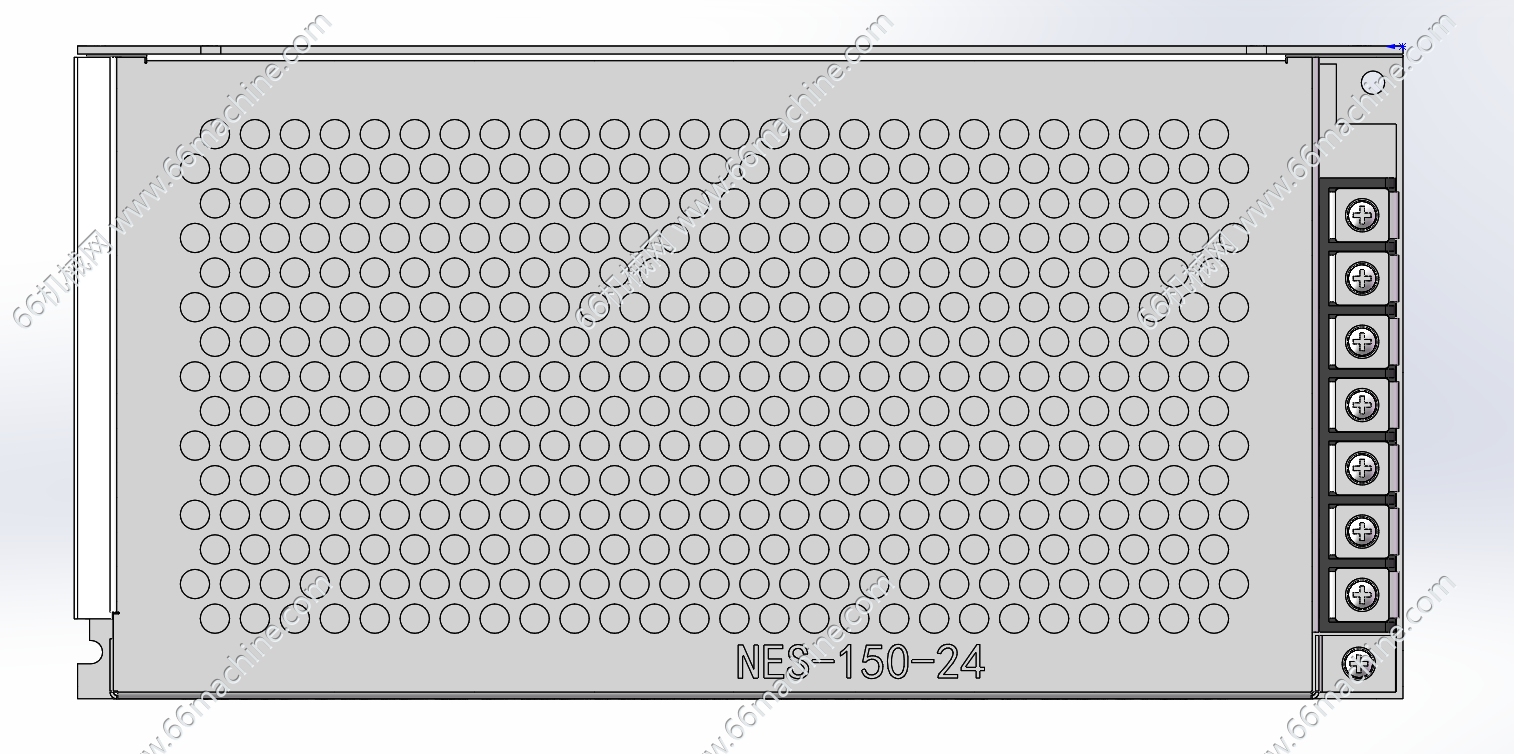 本模型为开关电源模块(型号为NES-150-24),NES-150:代表该电源属于经典工业级NES系列,额定输出功率为150W。-24:表示其输出电压为24VDC,输出电流约为6.3A。输出接口:标有“+V”(正极)、“-V”(负极),还有“ADJ V”微调旋钮,可对输出电压进行±10%的小幅调整,适配不同设备需求。开关电源是将交流市电转换为稳定的24V直流电压,为工业设备、监控系统、LED灯带、自动化控制电路等供电。外壳上的蜂窝状孔洞是散热孔,用于保障电源在持续工作时的稳定性。