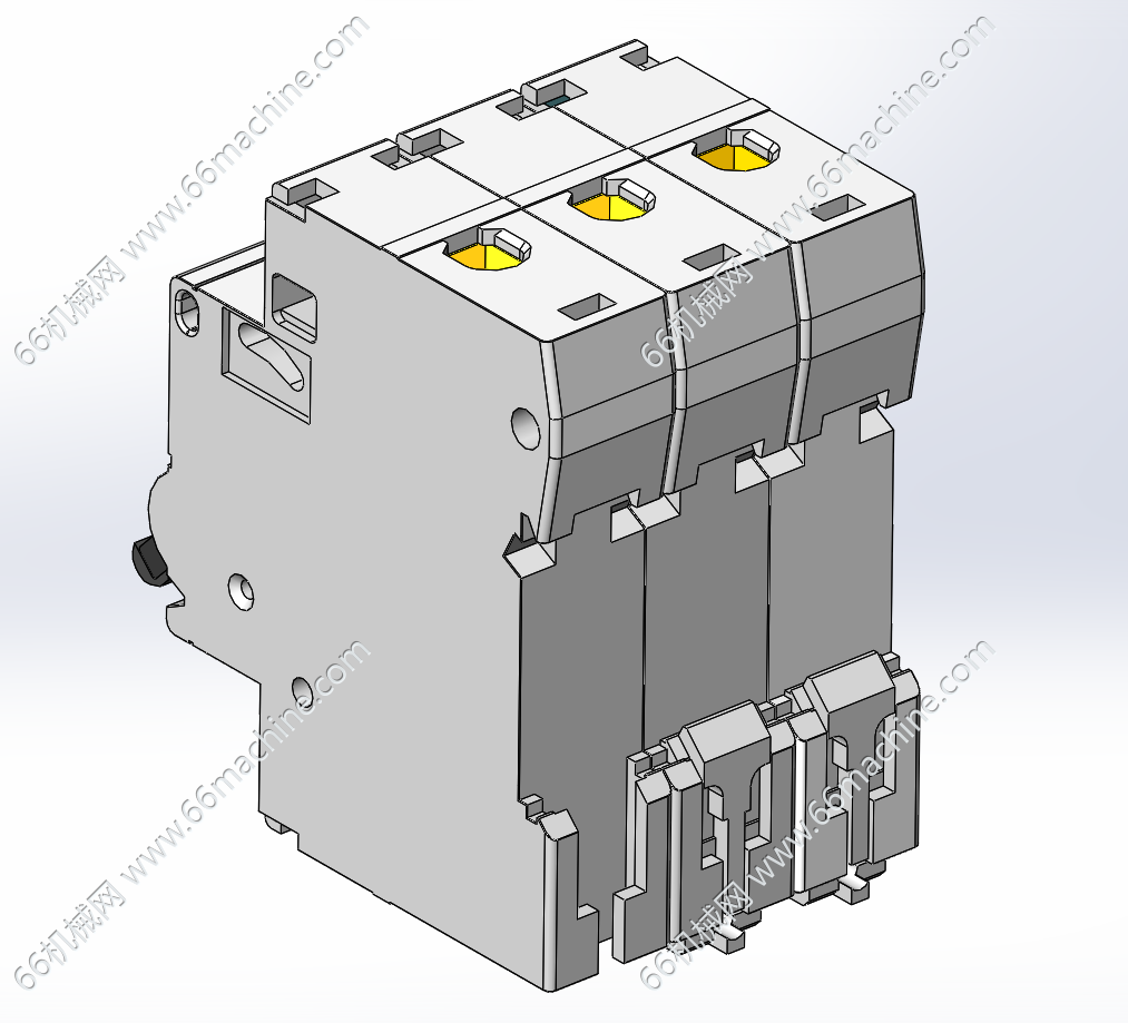 本模型为三相微型断路器(空气开关),具体型号是施耐德Multi9系列的C65N-C20-3PB型。C65N:代表施耐德经典的C65系列微型断路器,“N”表示分断能力为6kA。C20:“C”是脱扣特性曲线(适用于照明、配电等常规负载),“20”代表额定电流为20A。3P(三相):三极设计,可同时切断三相电路,常用于工业或三相用电设备的过载和短路保护。广泛用于电路出现过载、短路等故障时自动切断电源,从而保护用电设备和线路安全。