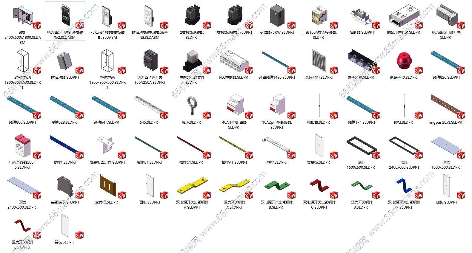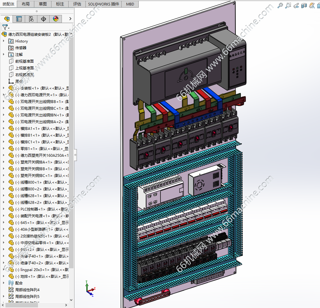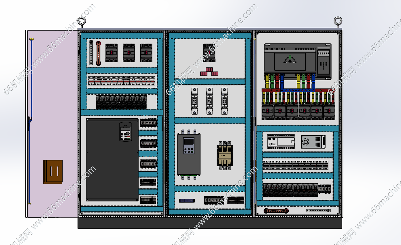 本模型为某企业双电源软启动plc控制,柜体尺寸:2400x600x1800mm,由三柜变频器+软启动旁路+双电源软启动PLC组成。属于三柜组合式低压成套电控系统,左柜为变频控制主柜,集成大功率变频器实现电机无级调速与软启停,中柜为软启动旁路+ PLC 控制中枢,通过软启动器实现电机平滑启动、旁路接触器切换工频运行以降低损耗,并由 PLC 统筹全系统的控制逻辑、联锁保护与通讯监控,右柜为双电源自动切换 + 配电总控柜,通过 ATS 开关实现两路电源的无缝切换以保障供电连续性,整套系统以变频调速节能、软启动保护电网、双电源冗余供电、PLC 集中控制为核心,采用变频与软启回路双重联锁、分级配电保护等设计,兼具高可靠性、节能性与自动化水平,广泛适用于给排水、暖通、工业生产线等对电机控制与供电连续性要求高的关键负载场景。