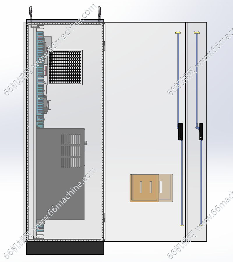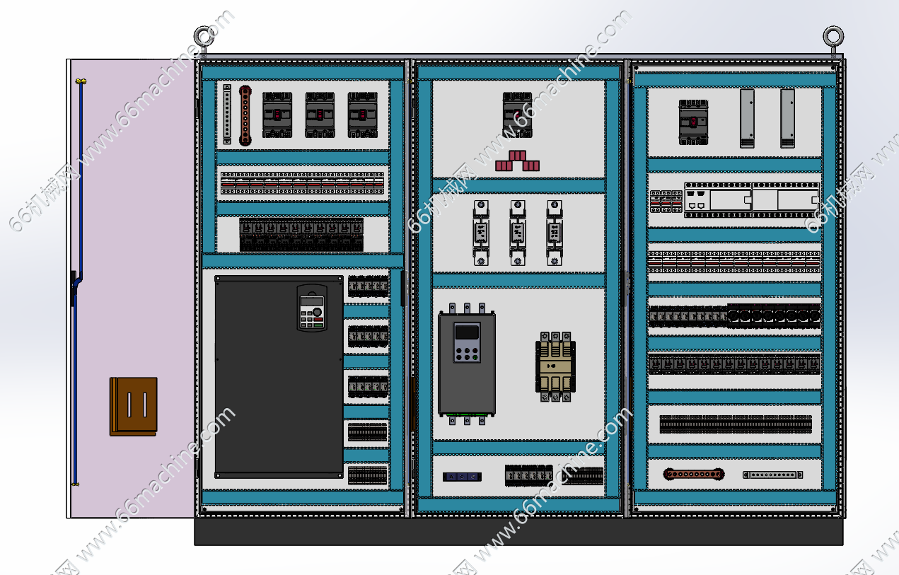 本模型为变频器软启动plc延时控制柜,尺寸:2400x600x1800mm,属于典型的工业自动化控制系统集成柜。采用三开门独立隔舱式设计,将大功率主回路与弱电控制回路物理分隔,满足EMC电磁兼容与安全防护要求。