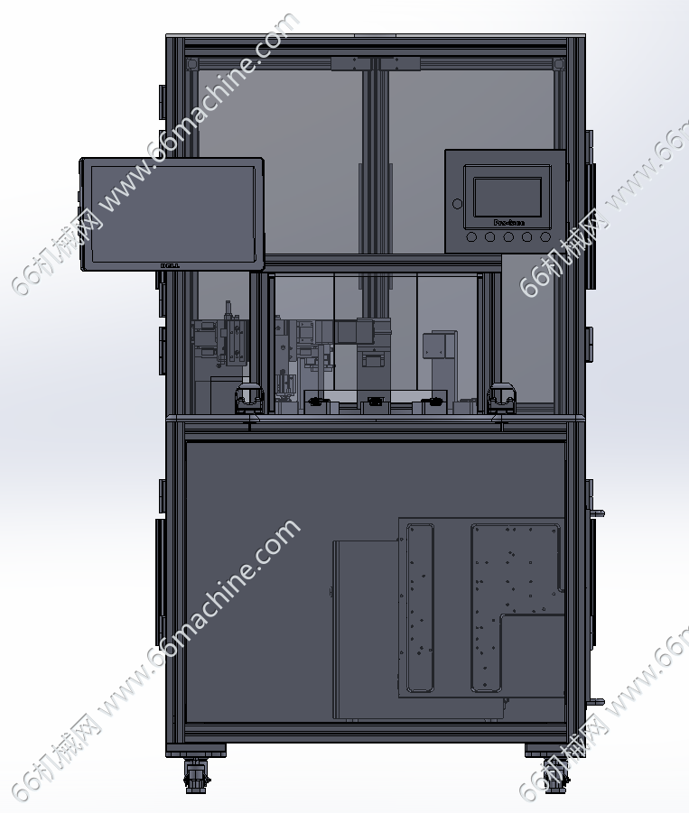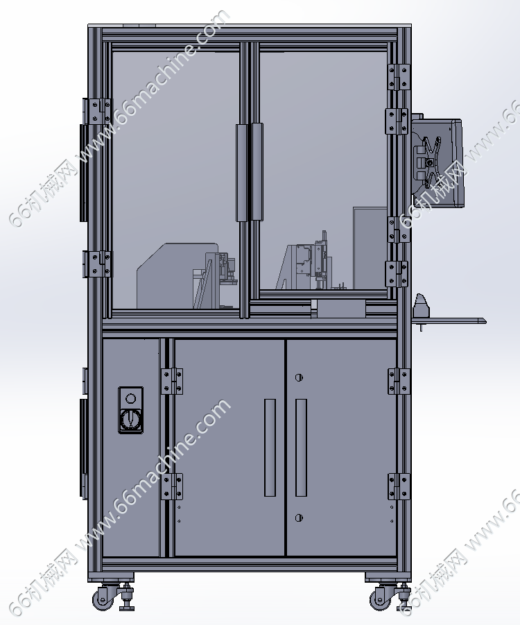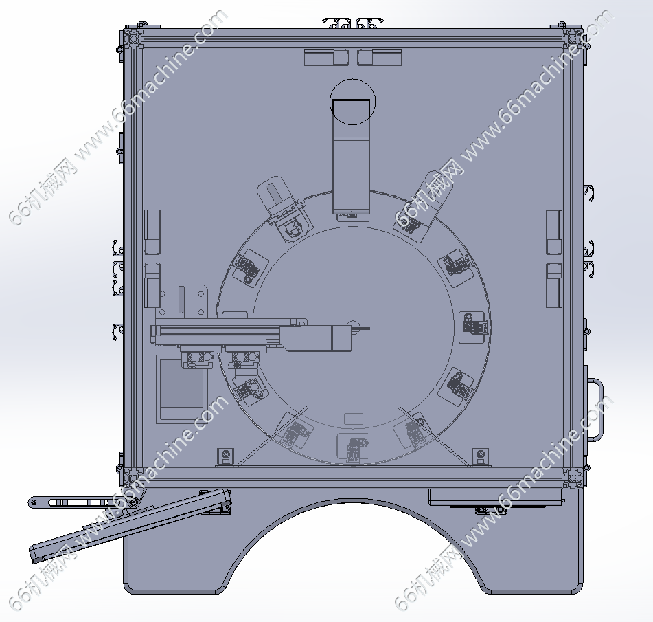 本模型为连接器接口转盘式激光打标机,主要由下机架、机罩、多工位转盘、夹取上下料模组、激光打标模组等组成,工作台底部装有带刹车的轮子,方便移动和定位。