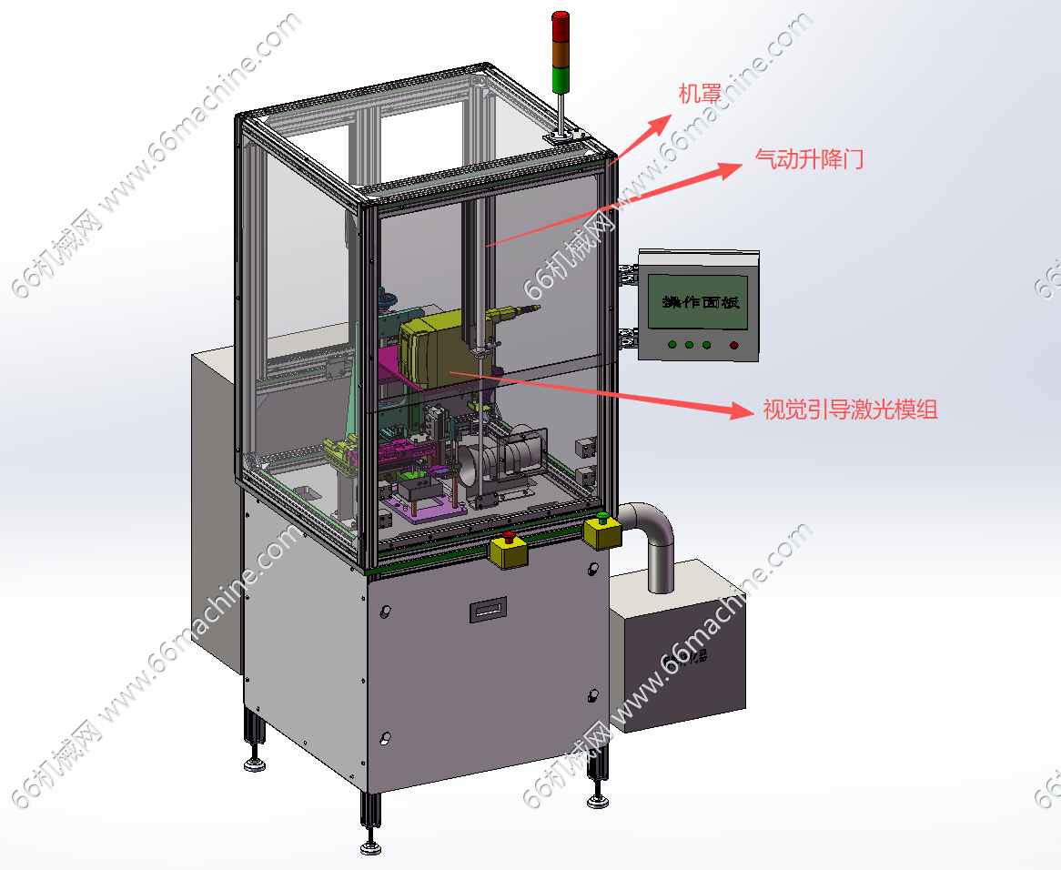 本设备为某企业视觉引导标牌(铭牌)激光打标机,主要由下机架、机罩、视觉引导激光模组、出料机构及吸取移送模组等组成,可以实现标牌(铭牌)自动供料、打标及下料作业,欢迎参考!