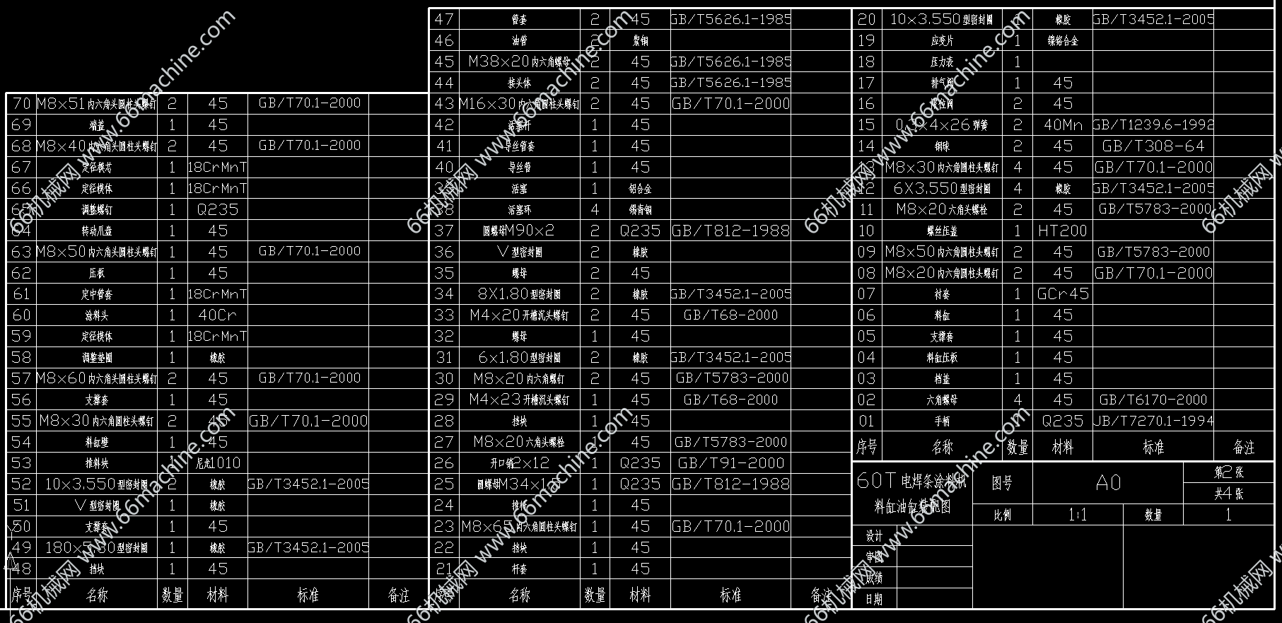 技术要求: 1.装配油缸时,推料杆一个人能够推动,而且保证不漏油。 2.料缸和衬套必须在同一轴线上,且料缸轴向活动自由。 3.因为是高压油路,注意接头的密封性,不准漏油,回油管为紫铜管。 4.涂料头装入料缸时,外圆应涂上一层薄的润滑油。 5.料缸与油缸只准随手旋合,不得拧得过紧。