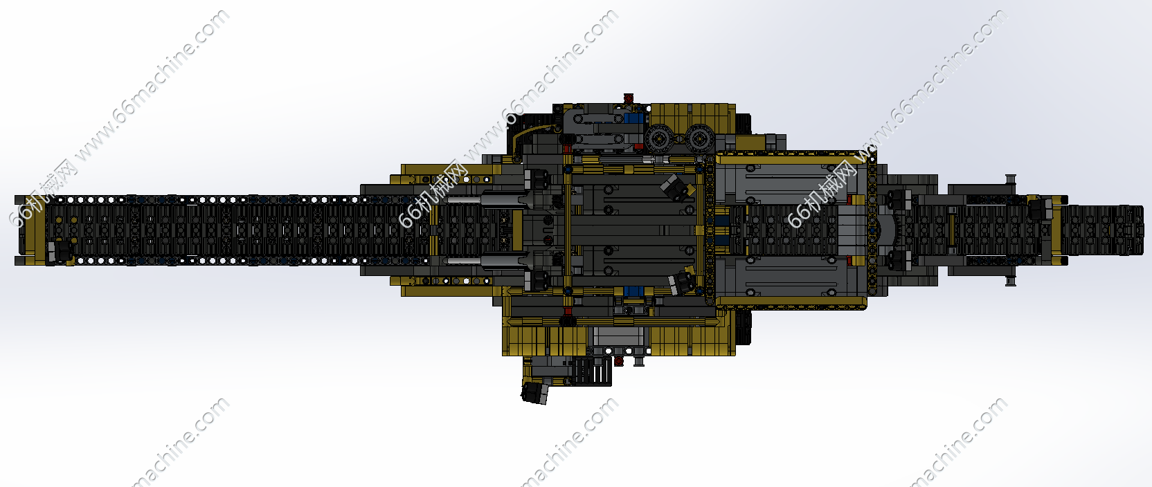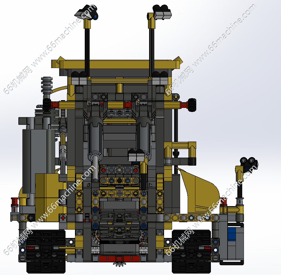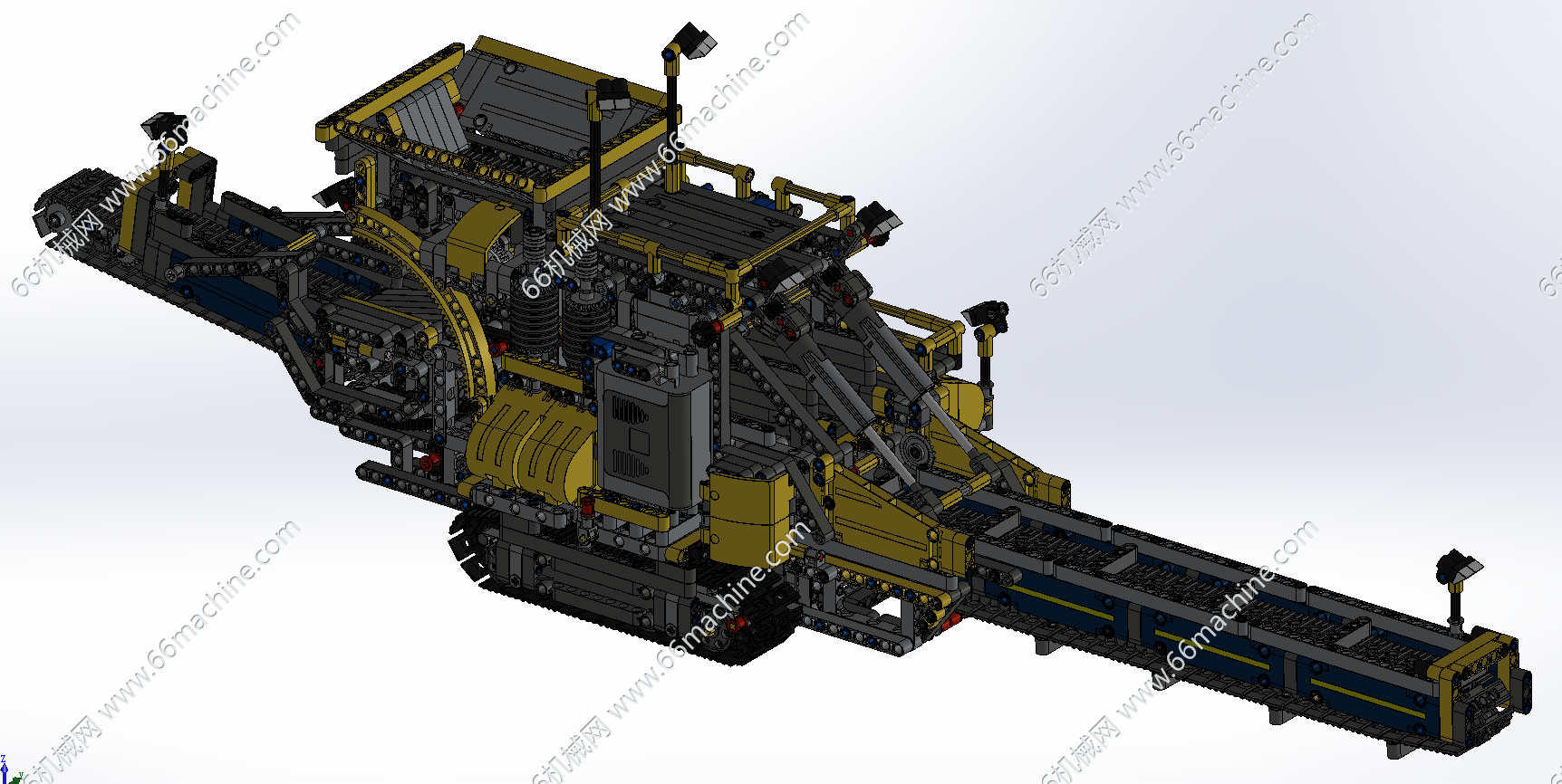本模型为煤矿、铁矿履带式传送工程车,由履带底盘和上装部分组成,履带底盘包含4轮一带,驱动轮,支重轮,引导轮,上装部分使用油缸、齿轮齿条等机构,主要用于煤矿、铁矿的传送带式输送(如输送至货运箱内),欢迎参考!