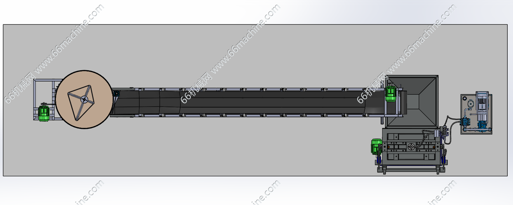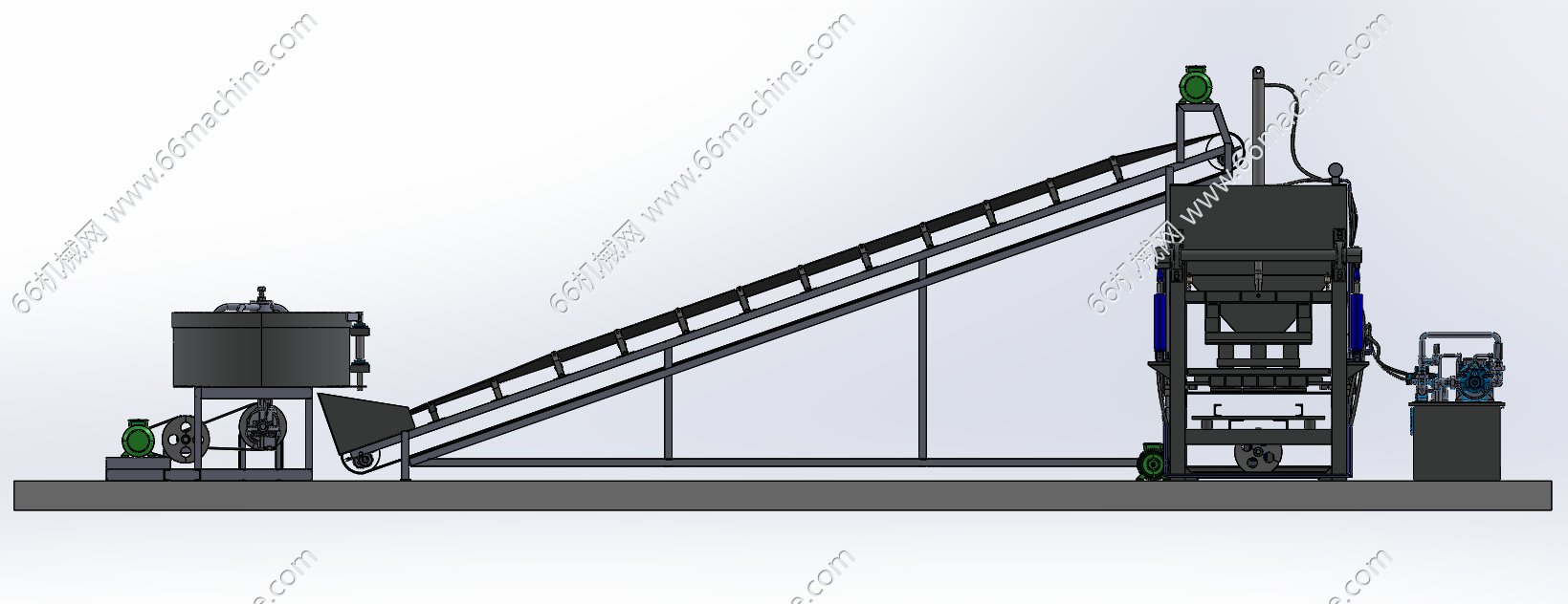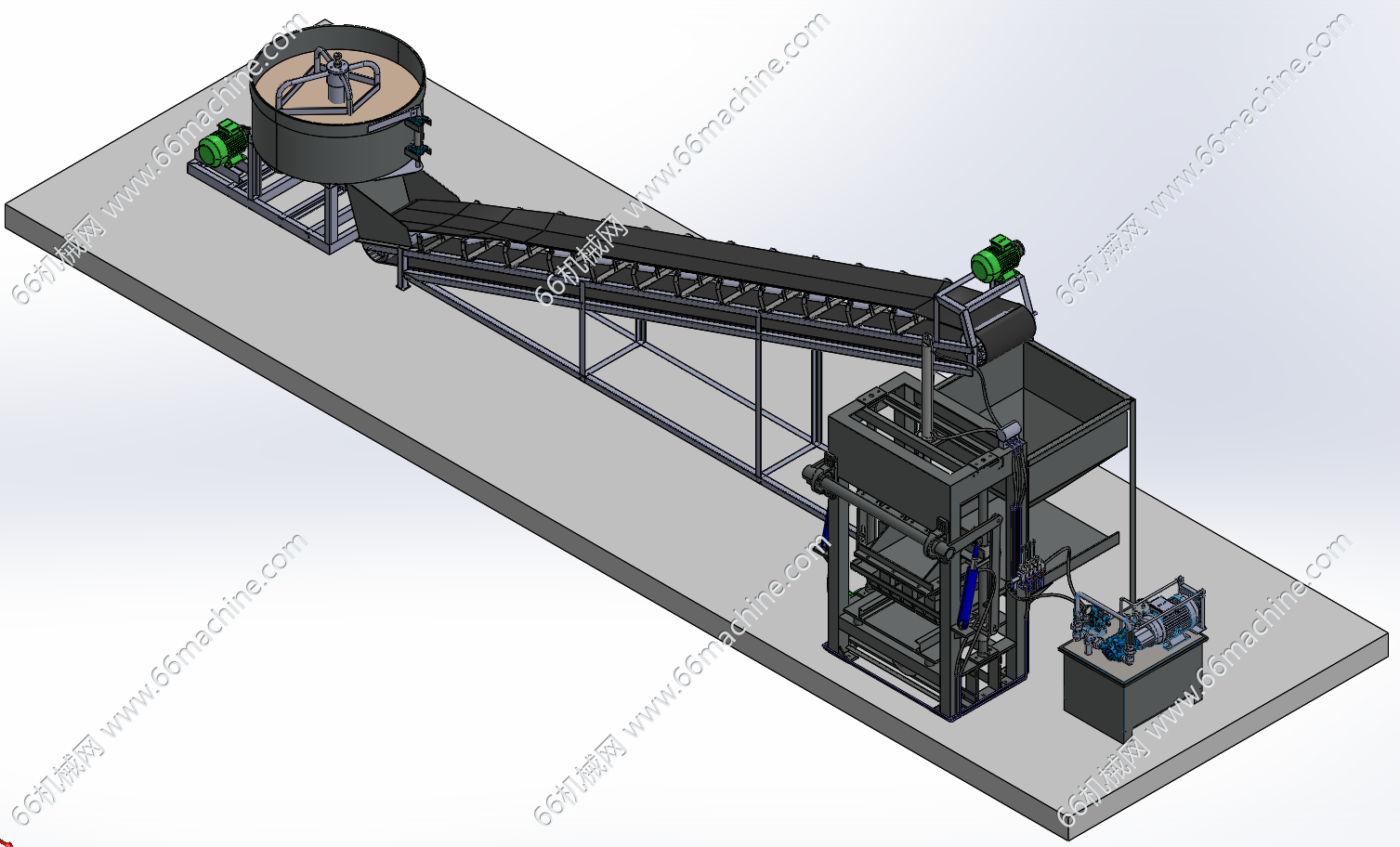 本模型为自动上料制砖线,主要用于将水泥、砂石等原料加工成砖块。圆桶式搅拌机负责将水泥和砂按比例混合成均匀的混凝土混合料,然后由倾斜式皮带输送机将搅拌好的混合料提升并输送至右侧的成型主机料斗!
