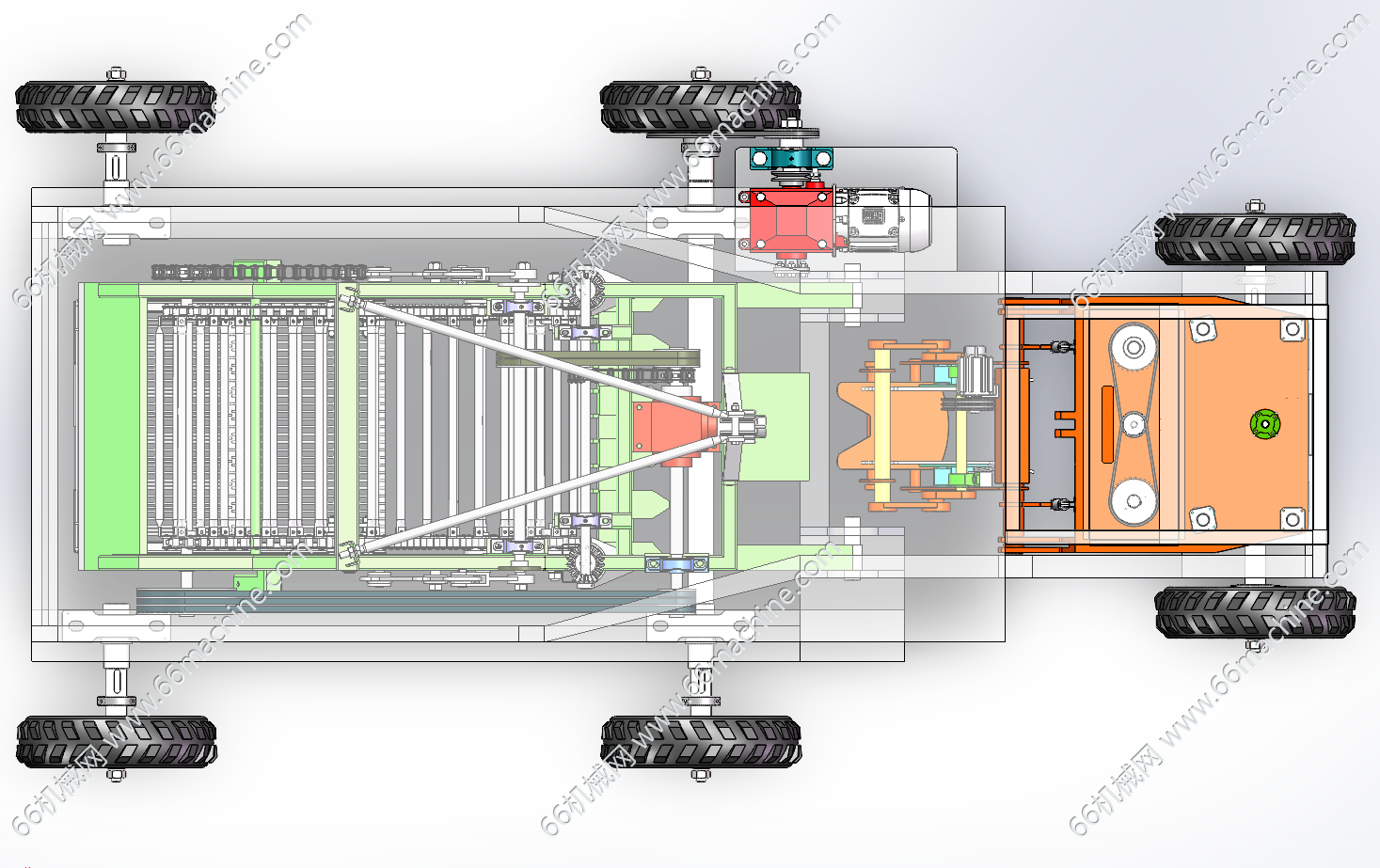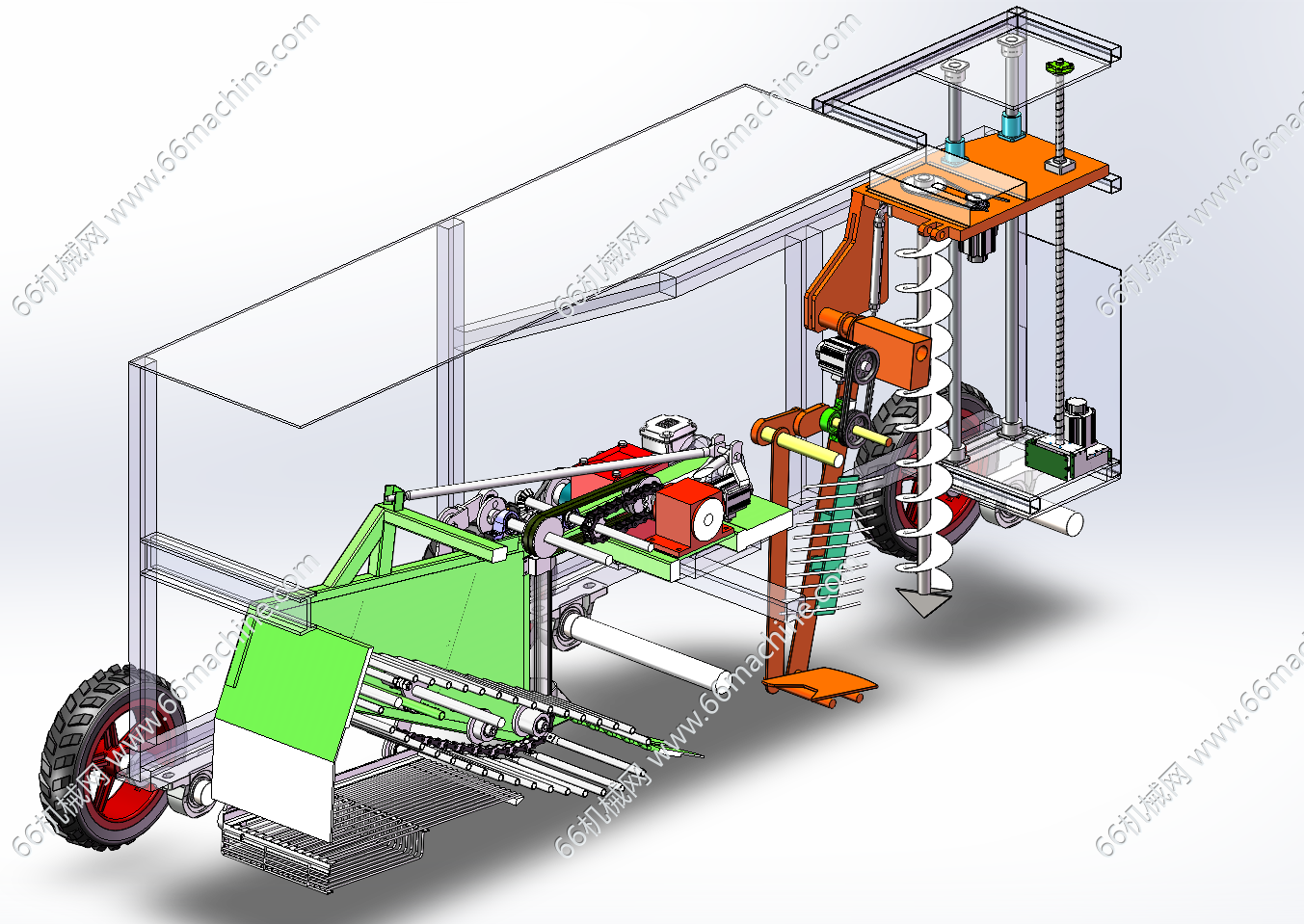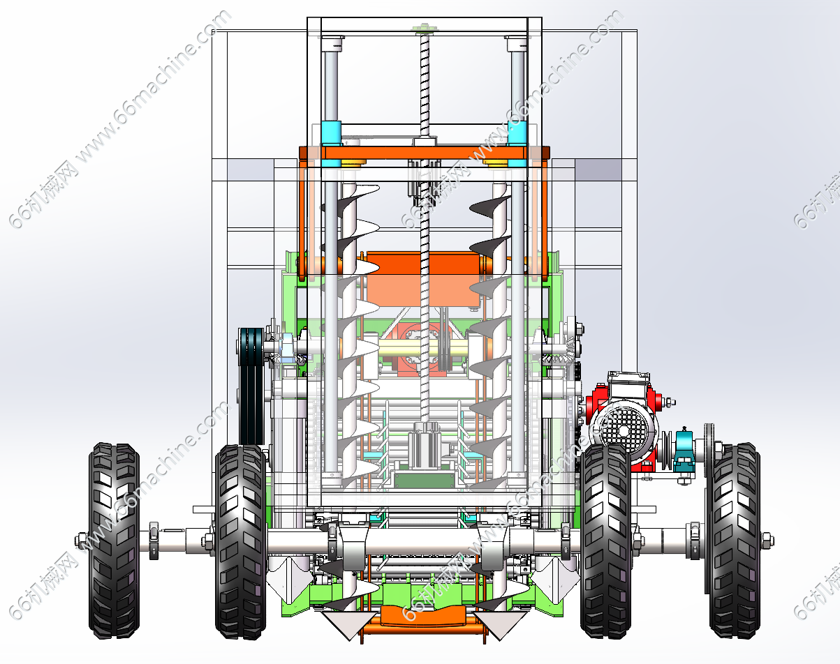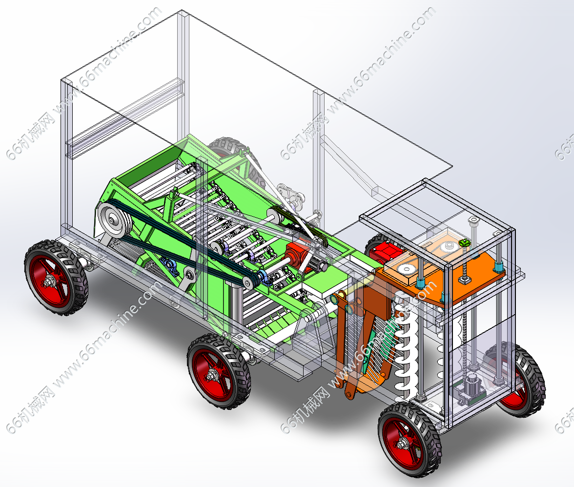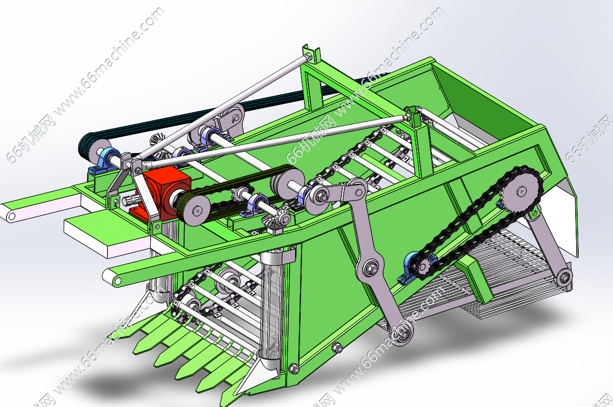 针对传统山药人工采收效率低下、块茎破损率高及现有机械适应性不足等问题,本研究通过创新机械结构与作业模式融合,研发了一款具备破土开沟、振动碎土与根土分离复合功能的山药收获装备。通过田间农艺调研与力学特性分析,构建了采收设备的模块化设计方案,重点突破深层土壤处理与脆性作物保护的技术瓶颈。在整机设计环节,采用变螺距螺旋叶片与分体钻尖组合结构,实现种植沟的精准开掘与土壤定向分流,通过双螺旋结构的力学优化降低入土阻力。振动碎土装置创新性地引入复合运动模式,结合曲柄摇杆机构与液压驱动系统,通过垂直振动与水平摆动的协同作用实现土坯破碎与块茎无损分离。根土分离机构采用多级筛分系统,利用振动筛的斜抛运动与链杆式输送带的自激振动效应,显著提升土壤剥离效率。