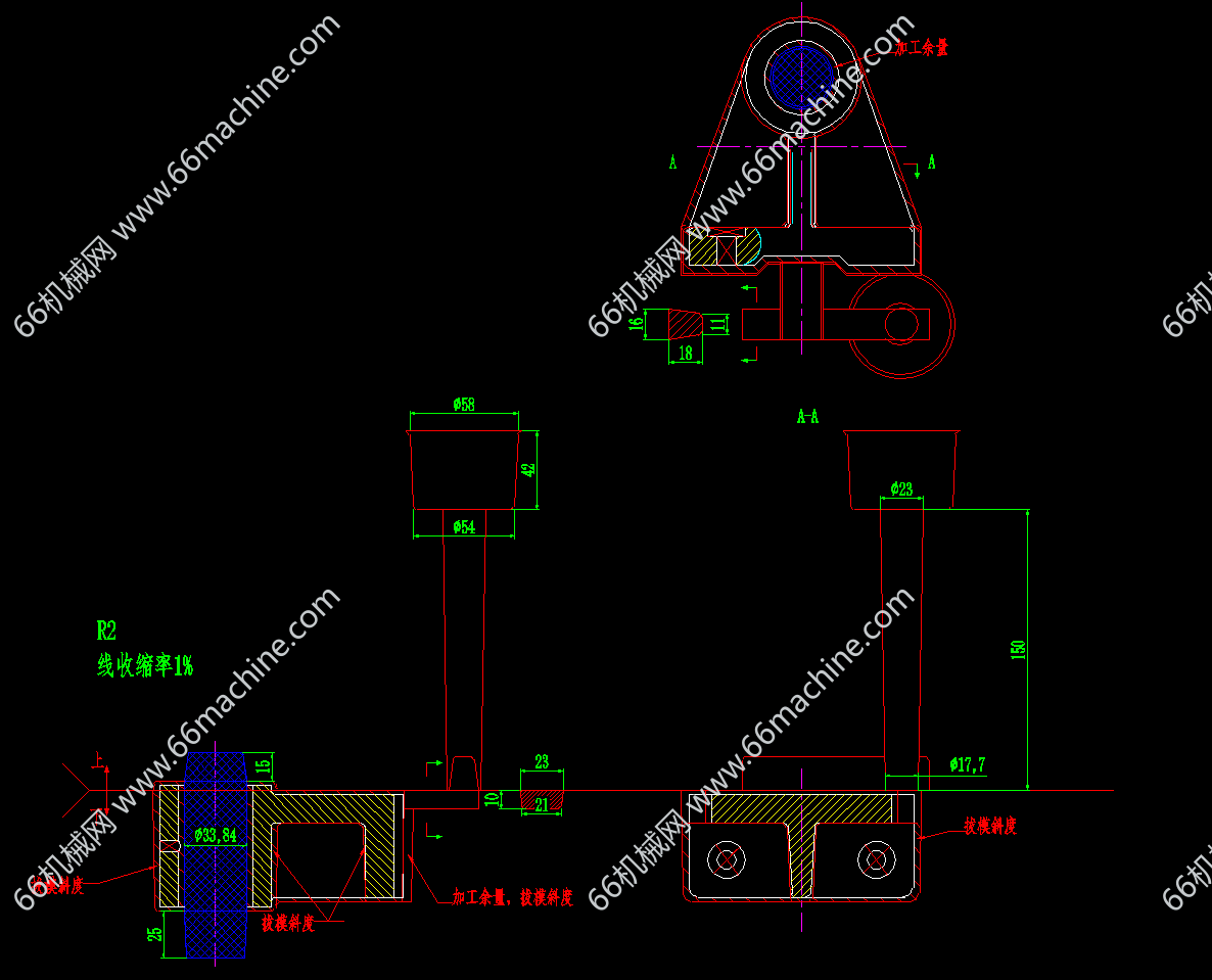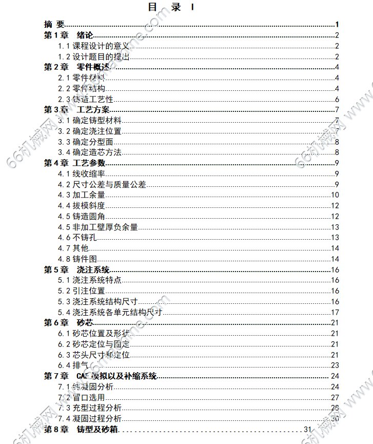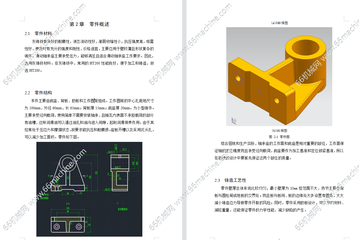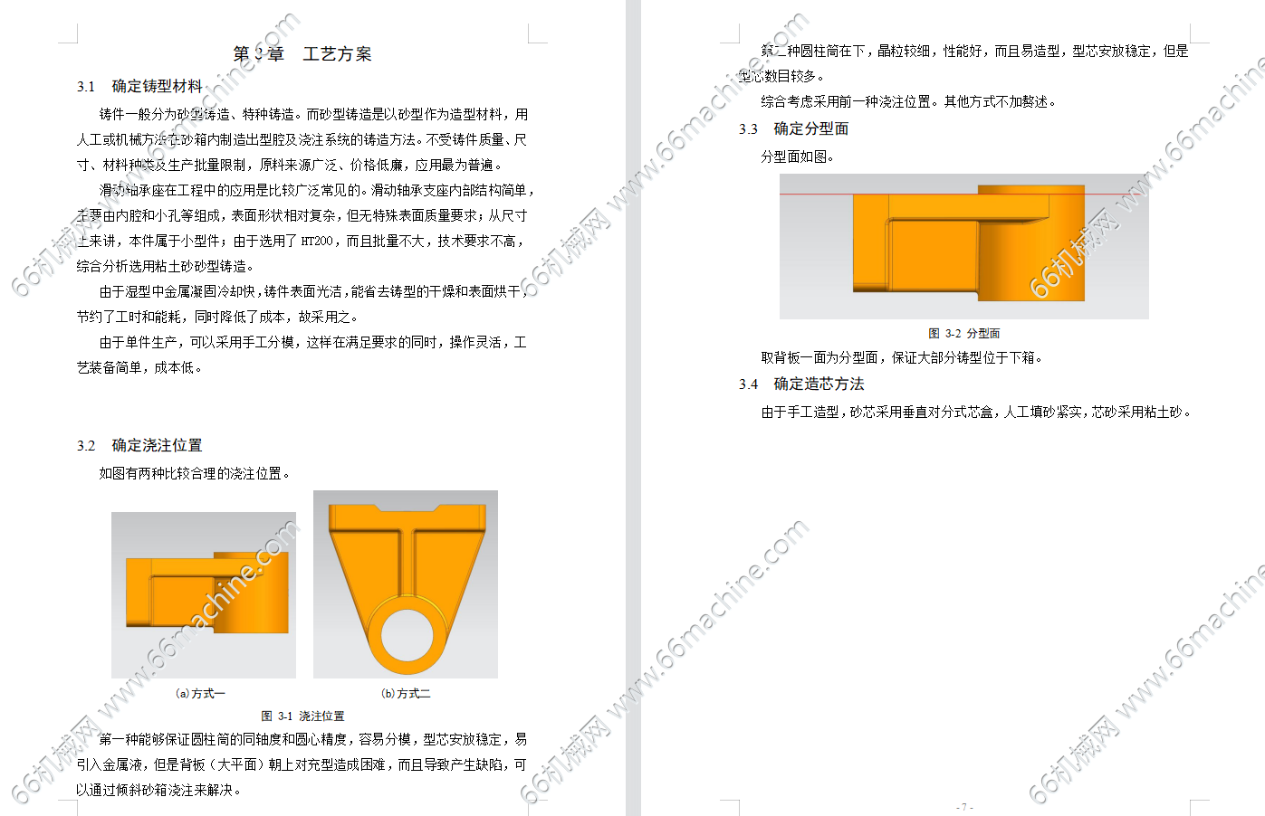 摘要:本工艺设计说明书主要按照国标,对小型件滑动轴承座进行了零件分析、工艺参数、浇注系统和补缩系统的设计,并利用华铸CAE进行了模拟分析,最后给出了工艺图和工艺卡指导生产。由于零件是配合课程作业而简单设计的,,所以在实际应用中可能不常见,生产批量设定为单件生产,质量要求满足小型玩具水平即可,表面粗糙度及尺寸精度均要求不高。故主要矛盾是铸型达到要求,为防止收缩过多导致尺寸偏小,收缩率取的较大,铸造坯料加工量较大。本设计采用顶注式浇注系统,有利于铸件顺序凝固补缩,而且在热节处设置冒口进行补缩,加之灰铸铁自补缩,最后铸件缩松缩孔几乎完全消除,铸件趋近于同时凝固。由于零件设计时就考虑到壁厚、圆角的问题,而且设计中进一步优化,所以最终铸坯也没有应力集中和开裂问题。