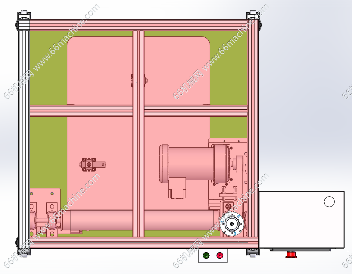 本模型为压紧定位工装,用于特定产品定位,带3组压紧气缸,主体框架为铝型材材料,带HMI控制屏及升降卷帘门,设备运行时,升降门提升,防止操作者磕碰。