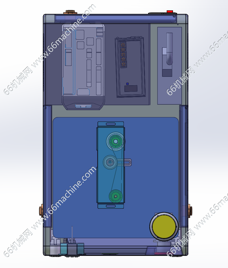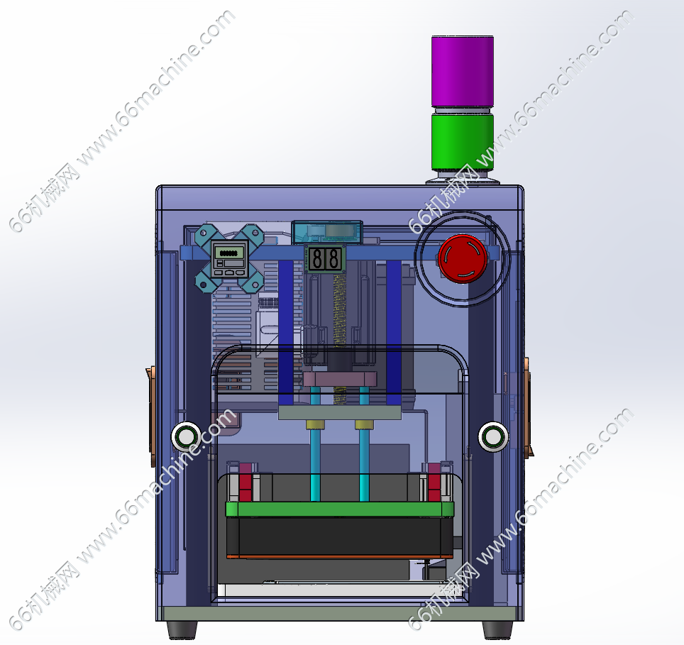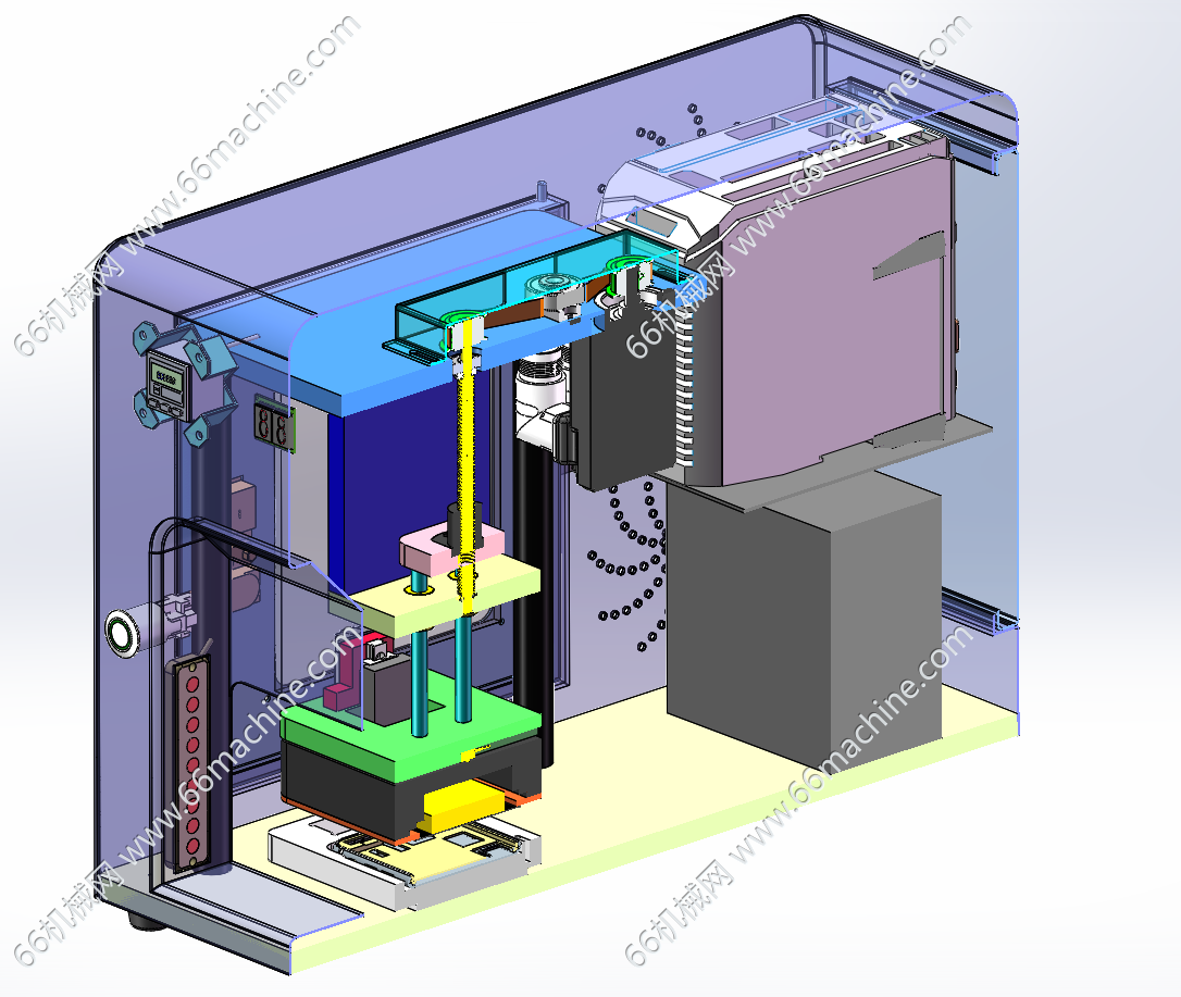 本模型为桌面式手机外屏压合治具,采用伺服电机经过同步带驱动丝杠模组动作进而实现升降压合动作,该治具用于手机主体与外屏涂胶后的压合粘合,具有保压作用,欢迎下载参考!