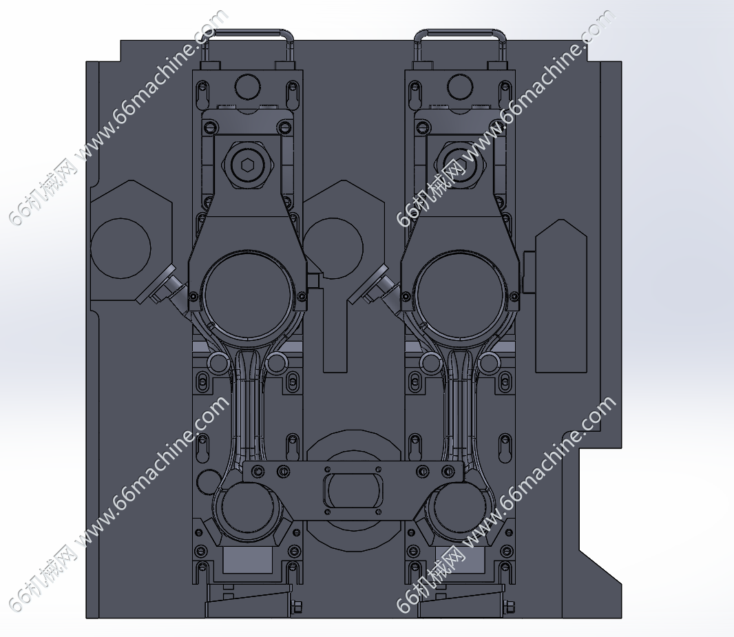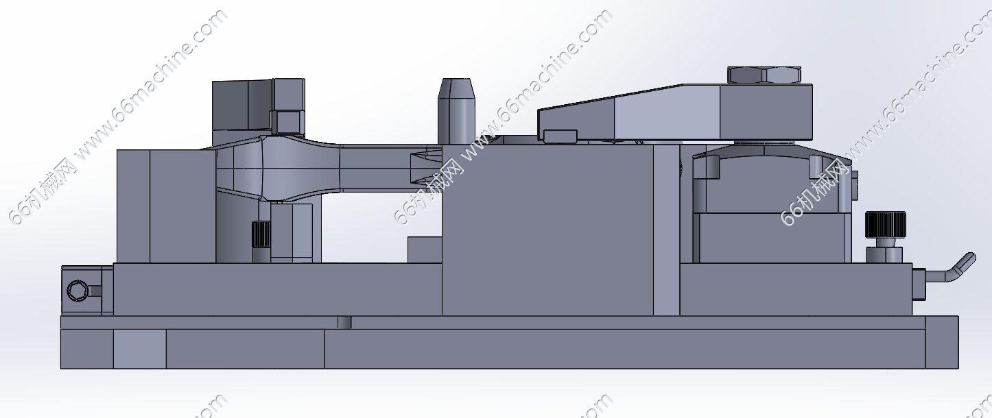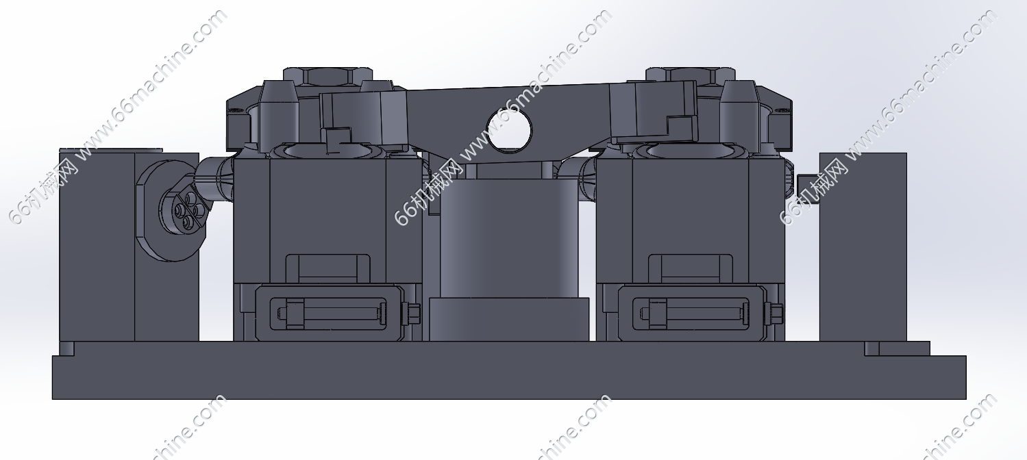 本模型为汽车连杆粗镗大小孔加工夹具,连杆的刚性较差,在镗削其大小头孔时需要使用专有夹具。本夹具采用多点联动夹紧,将工件牢固锁定在定位面上;夹紧力均匀,防止工件变形。