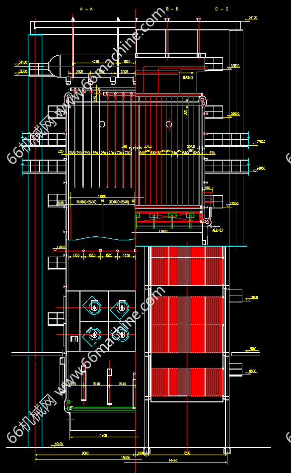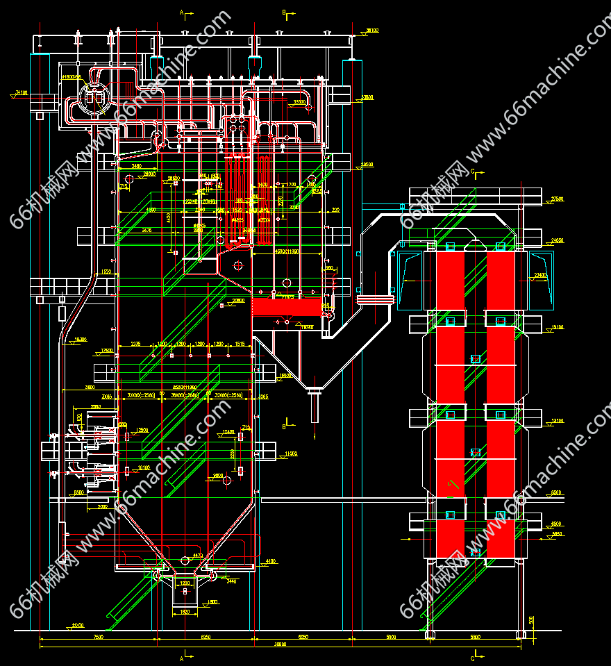 本图纸为某企业410t/h煤粉锅炉(高塔式煤动力蒸汽炉),塔式煤动力锅炉,提高了煤的燃烧速率,高效节能,起停简单。由炉膛,燃烧器,点火装置等构成。本图是高塔炉结构总成图,图纸通过主视图,侧视图结构展示整体炉体的结构布置,尺寸参数等。